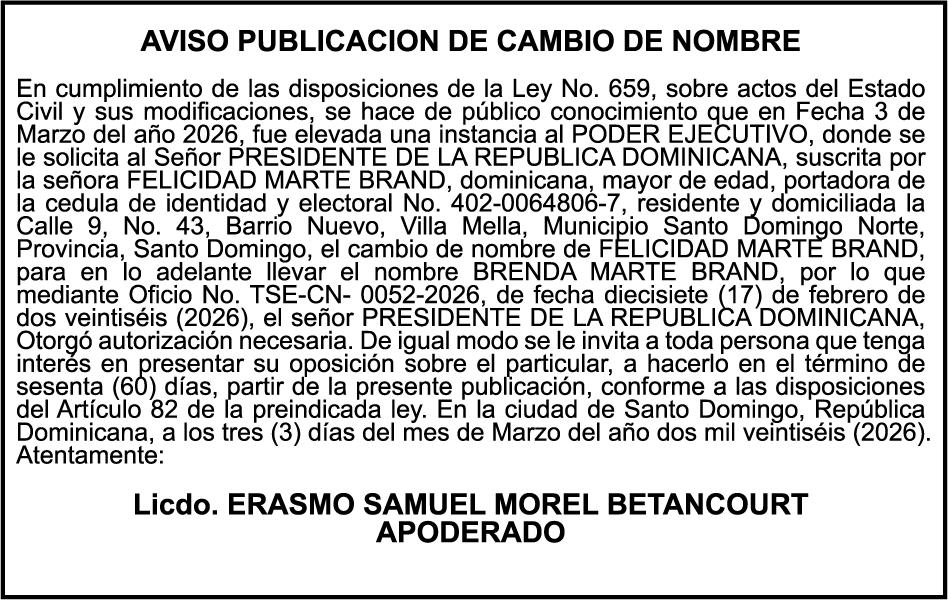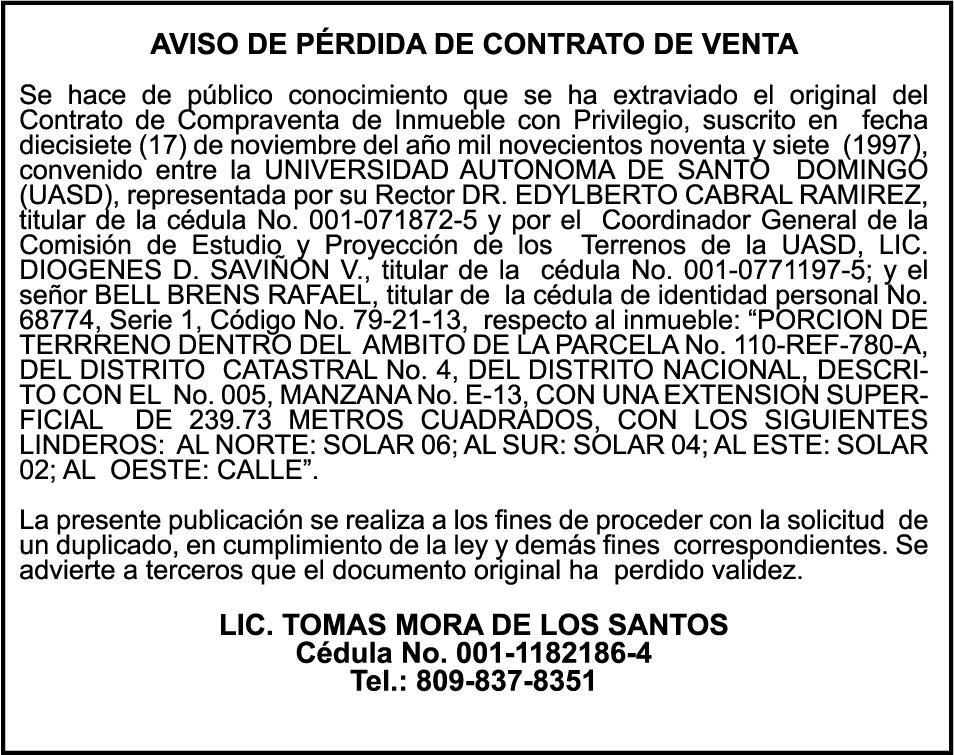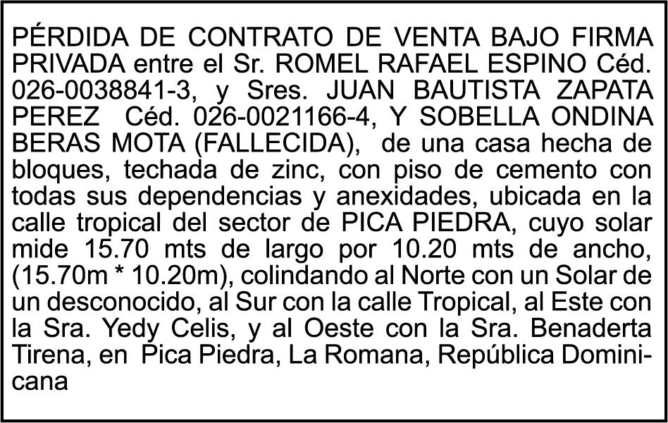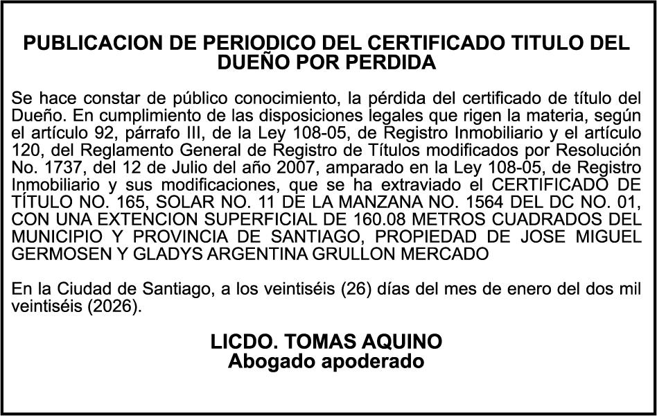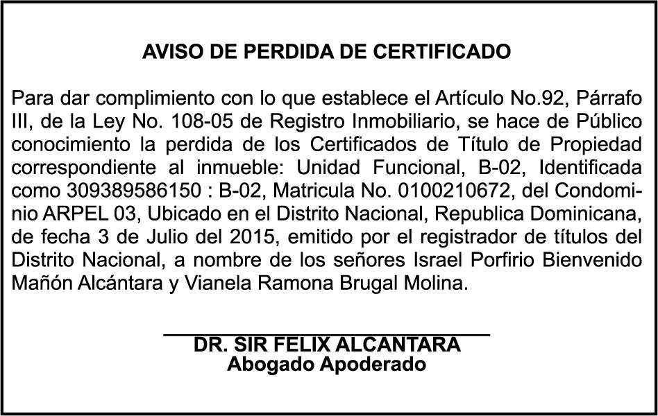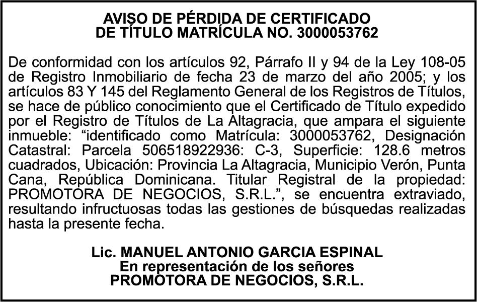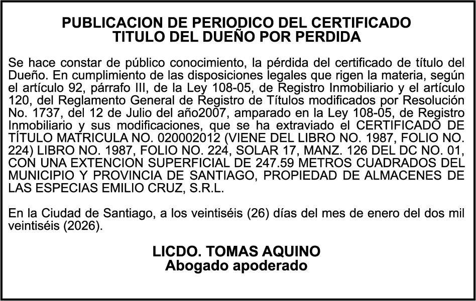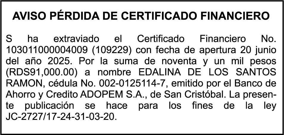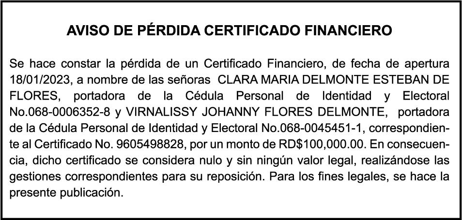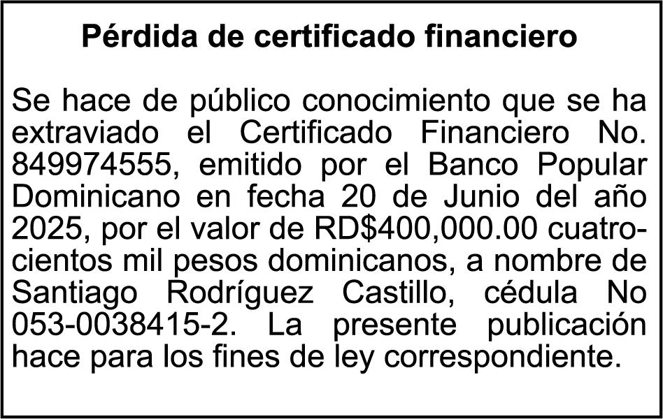 SE hace de público conocimiento la pérdida del Certificado Financiero número 847846078 emitido por Banco Popular Dominicano, S. A. Banco Múltiple, a nombre de APOLINAR RINCON FELIZ, portador de la Cédula de Identidad y Electoral número 001-1318691-0 certificado número 847846078 expedido el 13 de marzo de 2025 por el monto de (USD$15,144.23) más intereses generados a la fecha.
