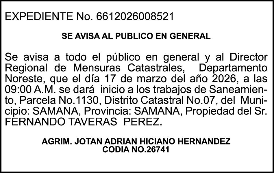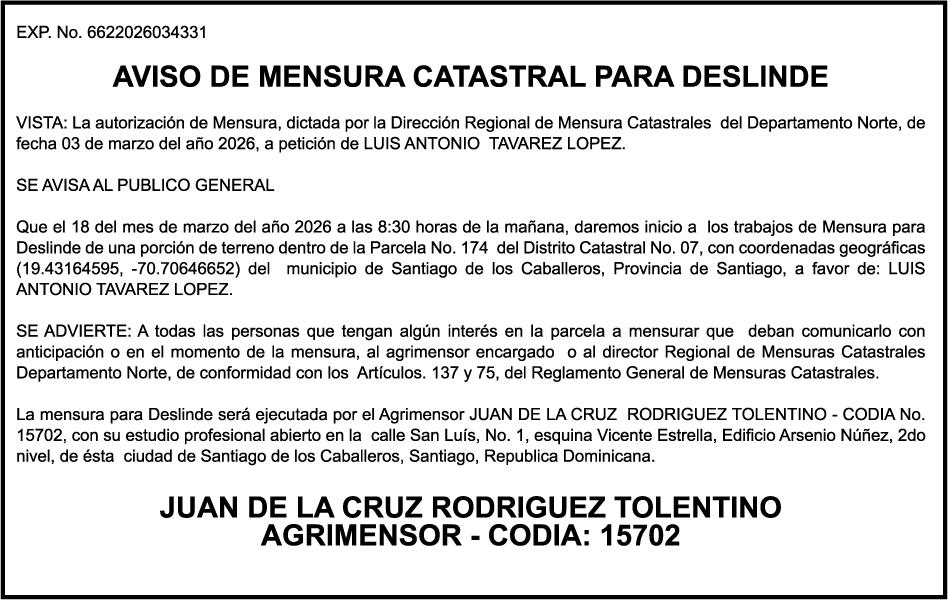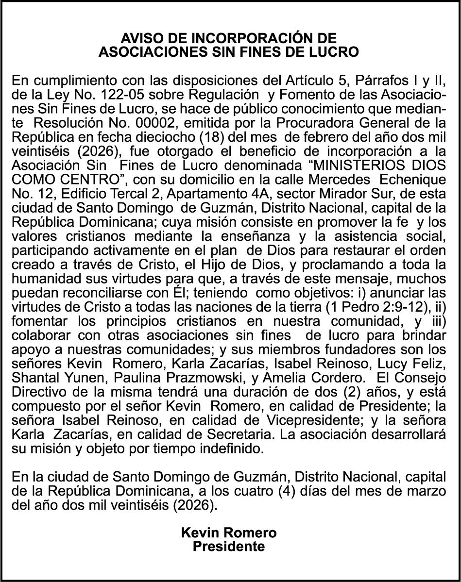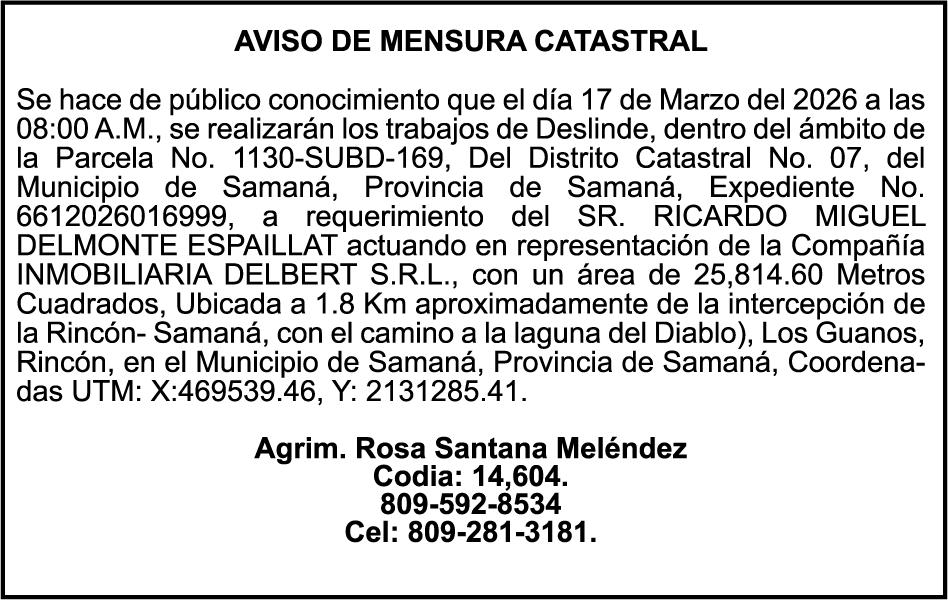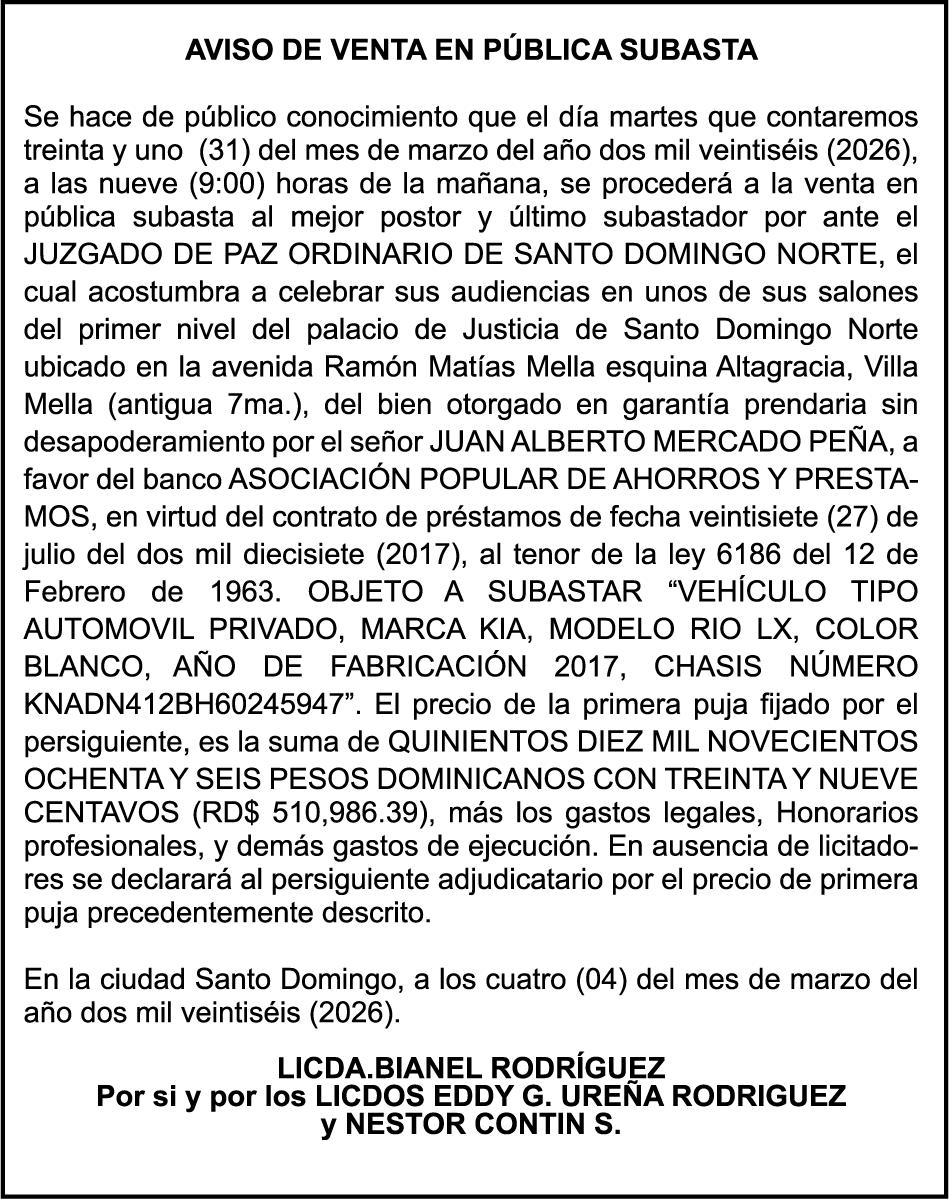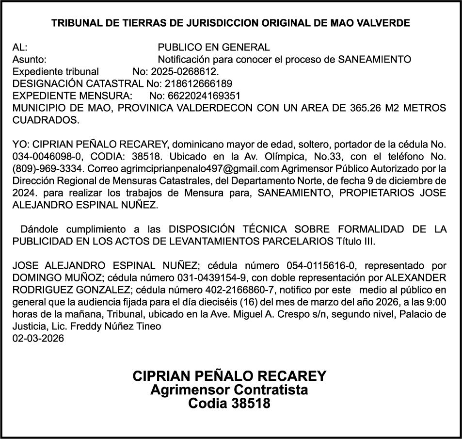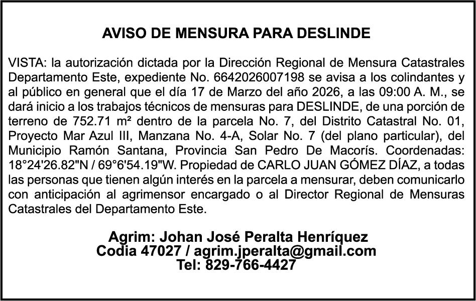 SE hace de público conocimiento la pérdida del Certificado Financiero número 847846078 emitido por Banco Popular Dominicano, S. A. Banco Múltiple, a nombre de APOLINAR RINCON FELIZ, portador de la Cédula de Identidad y Electoral número 001-1318691-0 certificado número 847846078 expedido el 13 de marzo de 2025 por el monto de (USD$15,144.23) más intereses generados a la fecha.