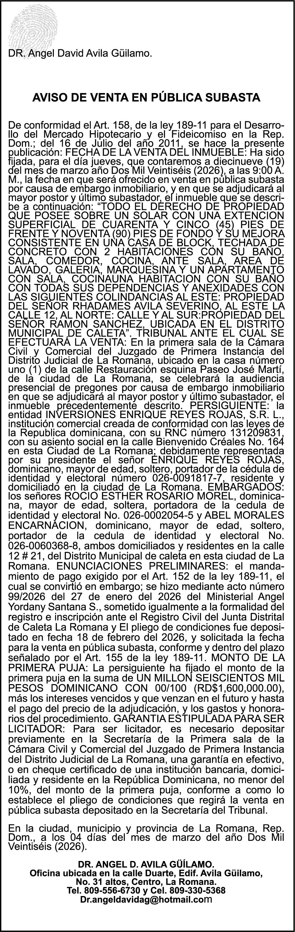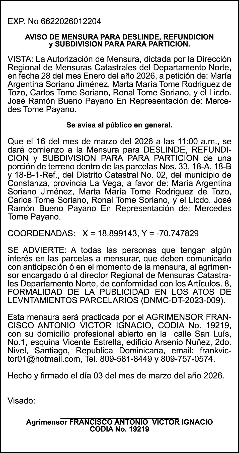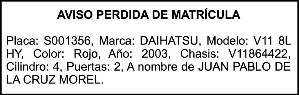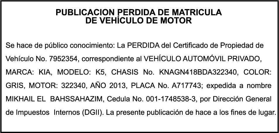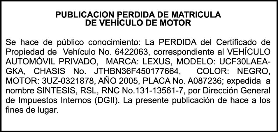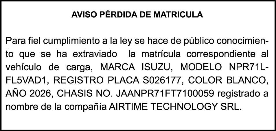 PERDIDA DE MATRICULA CARGA TOYOTA , color BLANCO, año 2026 , placa L540085, chasis JAA1MR77FT7100224, a nombre de HINO AUTOS SA PERDIDA DE PLACA N852926, MOTOCICLETA MARCA JINCHENG,MODELO AX100, AÑO 2011, COLOR NEGRO, CHASISLJCPAGLH1B1002619, NOMBRE DE LUIS ALBERTO LUGO PAULINO.