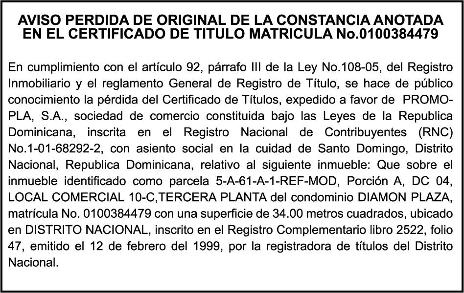 SE hace de público conocimiento la pérdida del Certificado Financiero número 815065784 emitido por Banco Popular Dominicano, S. A. Banco Múltiple, a nombre de LEONEL LUCIOLO VITTINI PAYANO, portador de la Cédula de Identidad y Electoral número 023-0110166-9 certificado número 815065784 expedido el 3 de septiembre de 2019 por el monto de (RD$59,834.99) más intereses generados a la fecha.