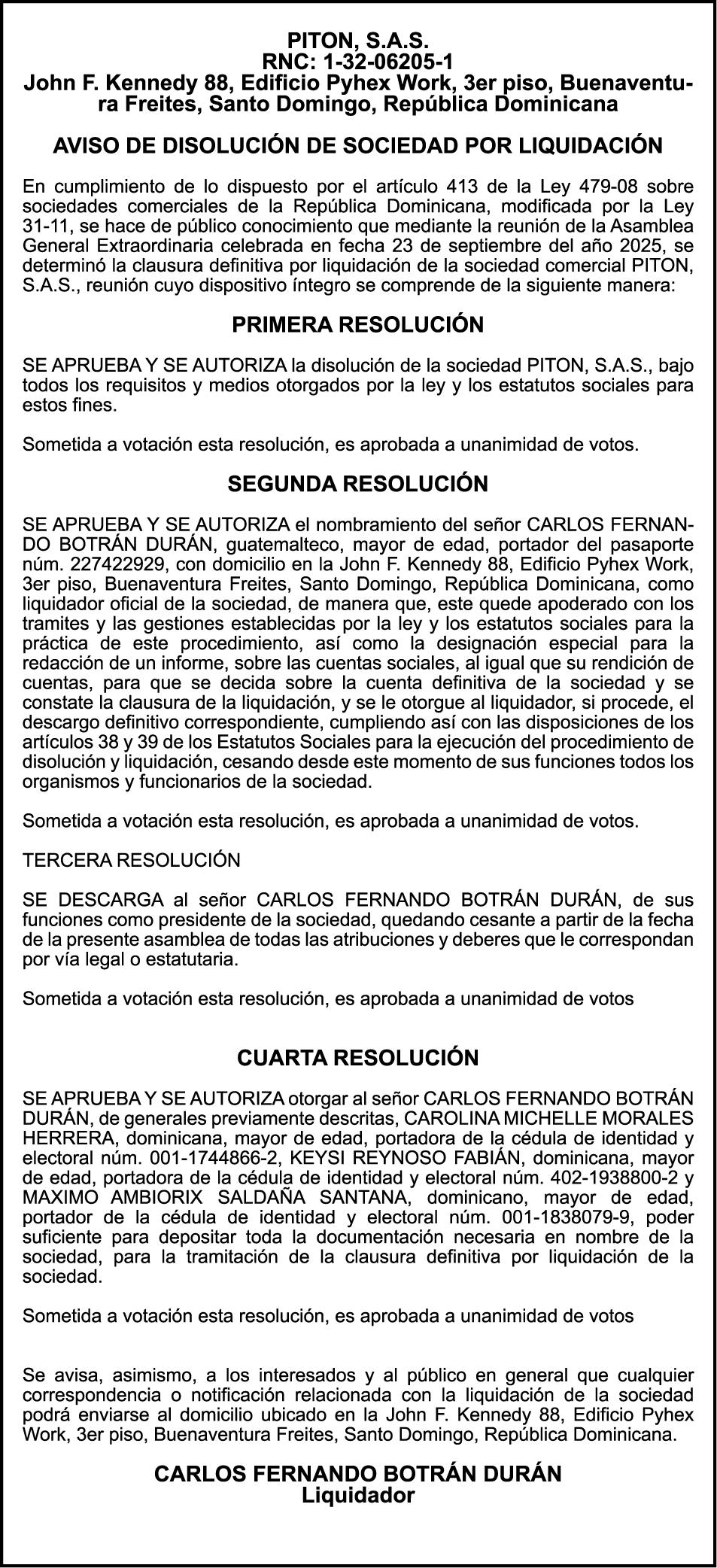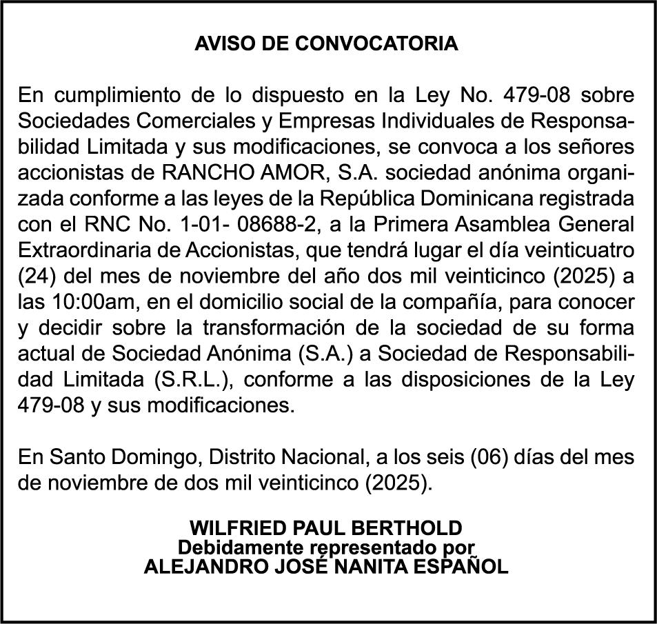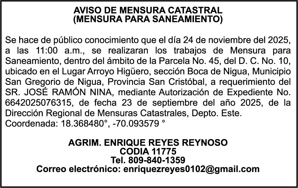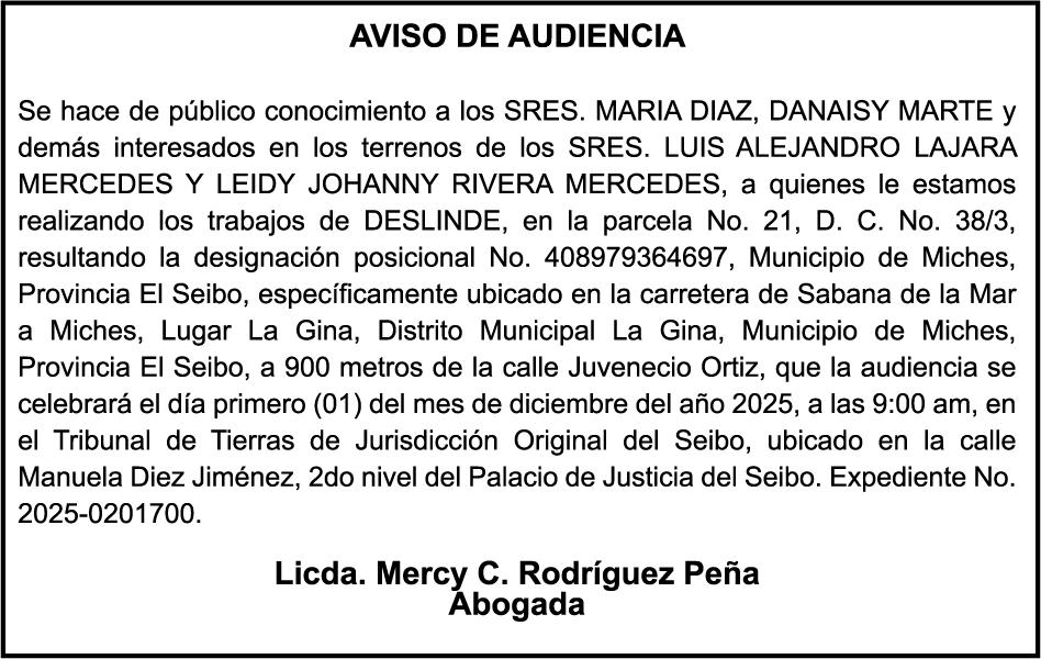 AVISO TRASPASO DE MEBARCACION.El señor. MARCIAL GUERRERO REYES , traspasa el bote de recreo denombre "YRLANDER" matricula No.BR-Y121-2655SBS, de 24´0 pies de eslora, a la señora. LUZ DENY TRINIDAD VILORIO, como nueva propietaria. PERDIDA DE MATRICULA Autobús Privado TOYOTA, modelo LH1144LBRMRS, color AZUL, año2001, placa 1000156, chasis LH1140033978, a nombre de FRANCISCO GUZMAN VALDEZ