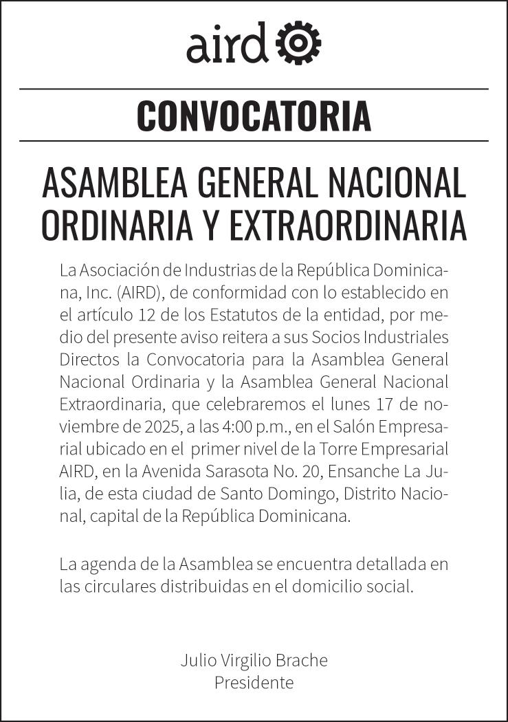 8:30 A.M. AIRD entrega Galardones Industriales 2025, en ese acto se reconocerá la excelencia, la innovación y el compromiso con el desarrollo del sector industrial nacional. Garden Tent, El Embajador.