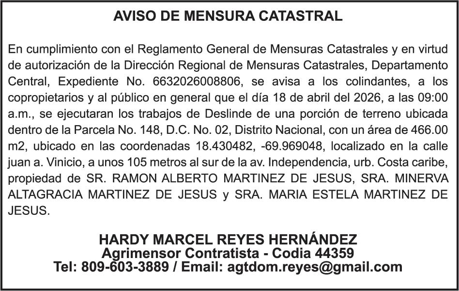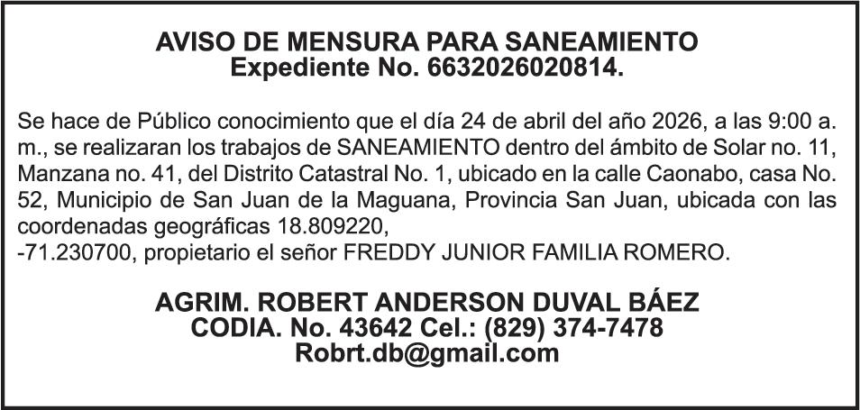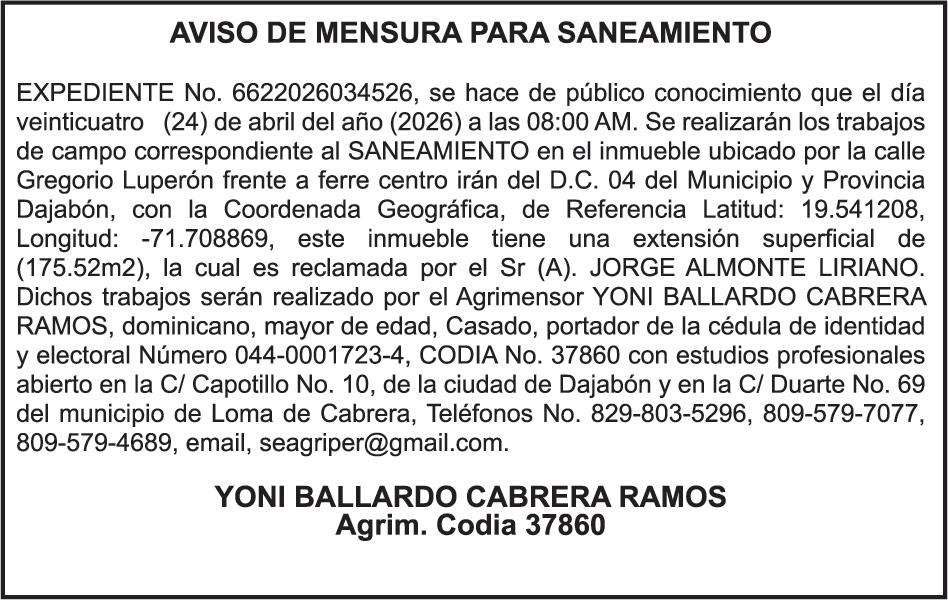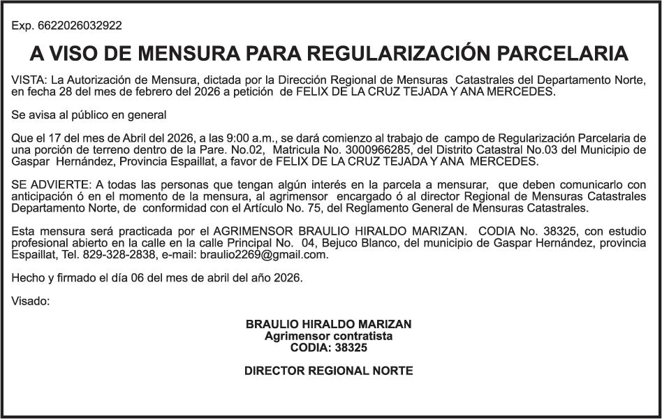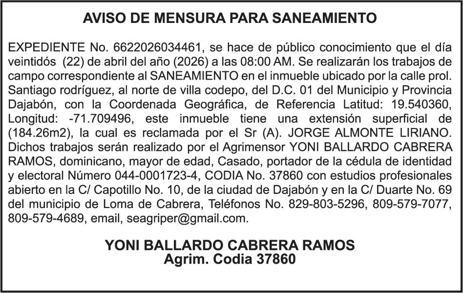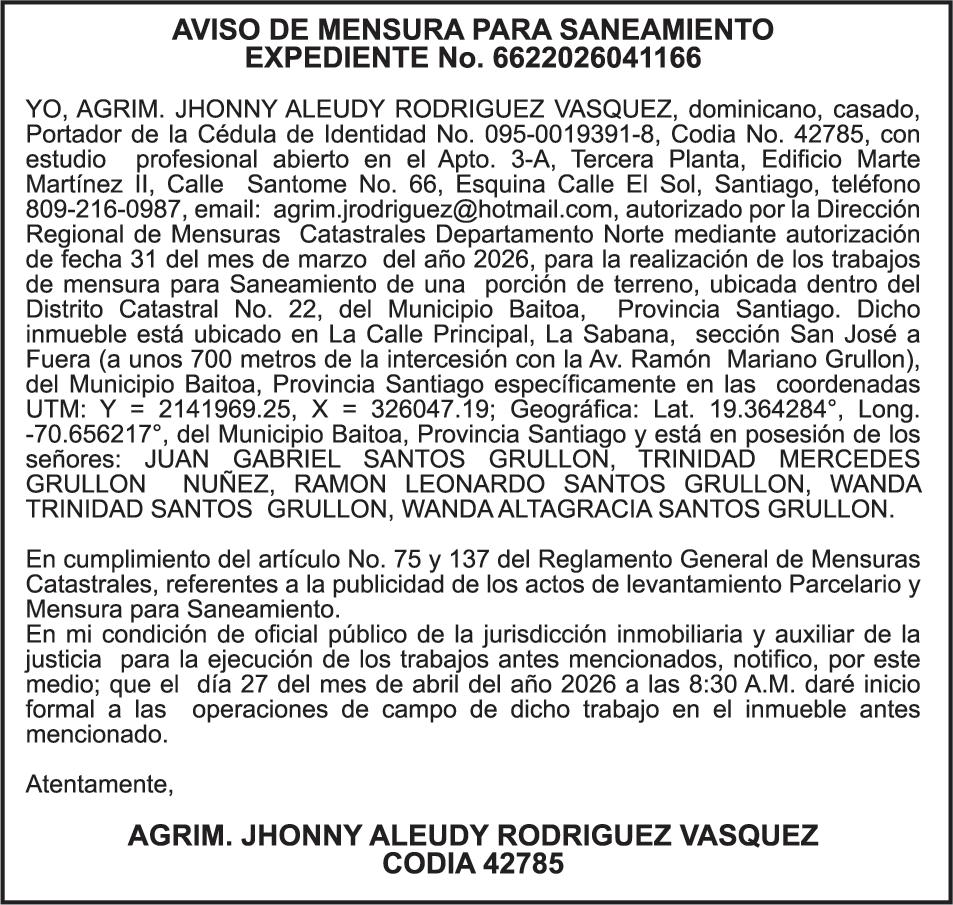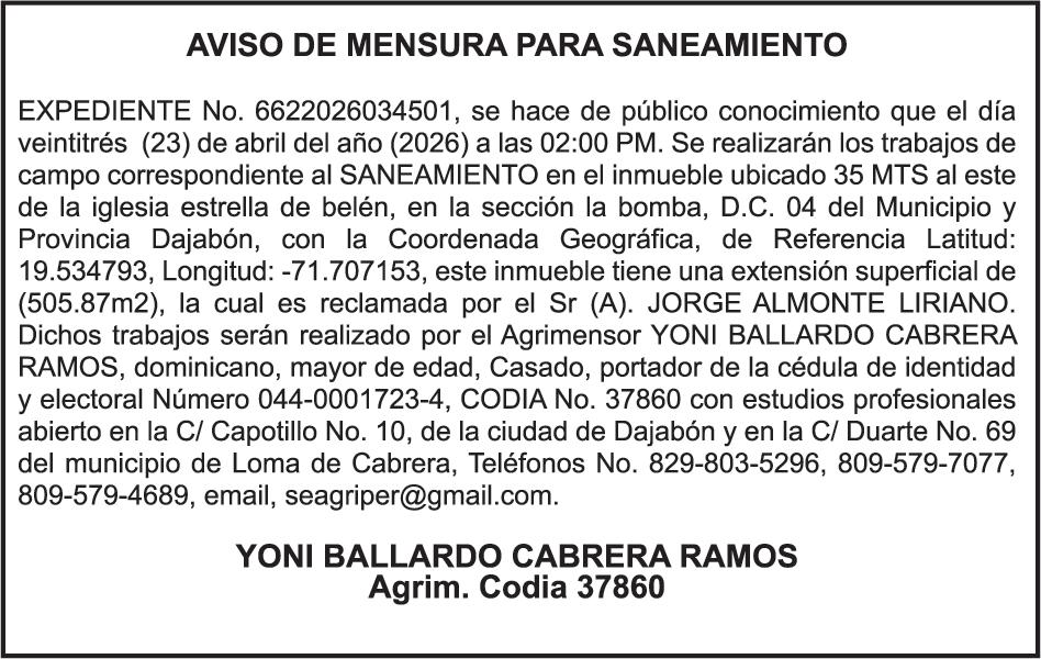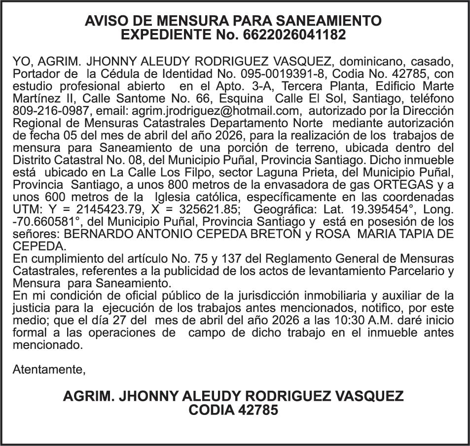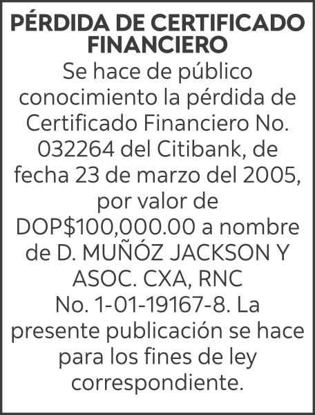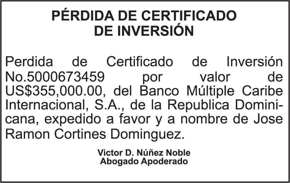 SE hace de público conocimiento la pérdida del Certificado Financiero número 848036166 emitido por Banco Popular Dominicano, S. A. Banco Múltiple, a nombre de WILFREDO HIDALGO UREÑA, portador de la Cédula de Identidad y Electoral número 001-0505604-8 , certificado número 848036166 expedido el 21 de marzo de 2025 por el monto de (USD$22,262.38) más intereses generados a la fecha.