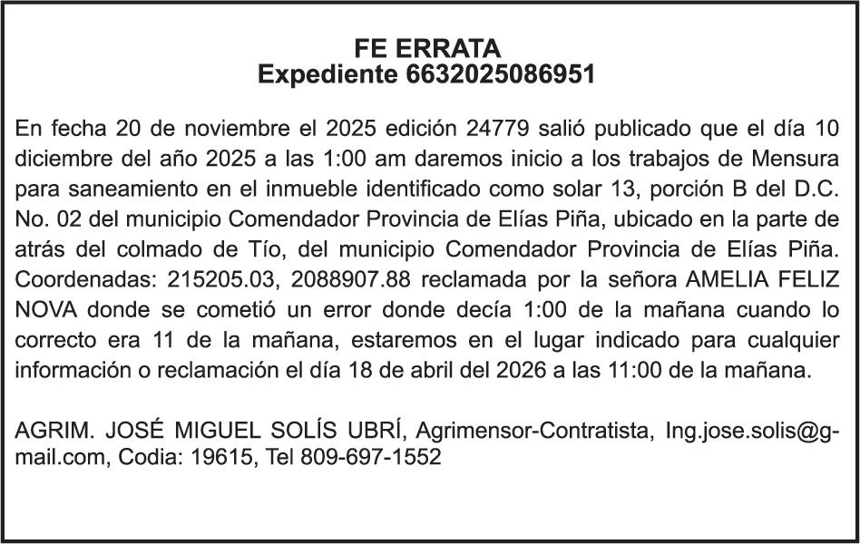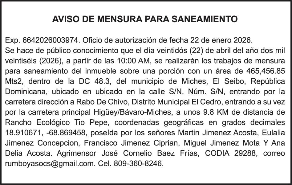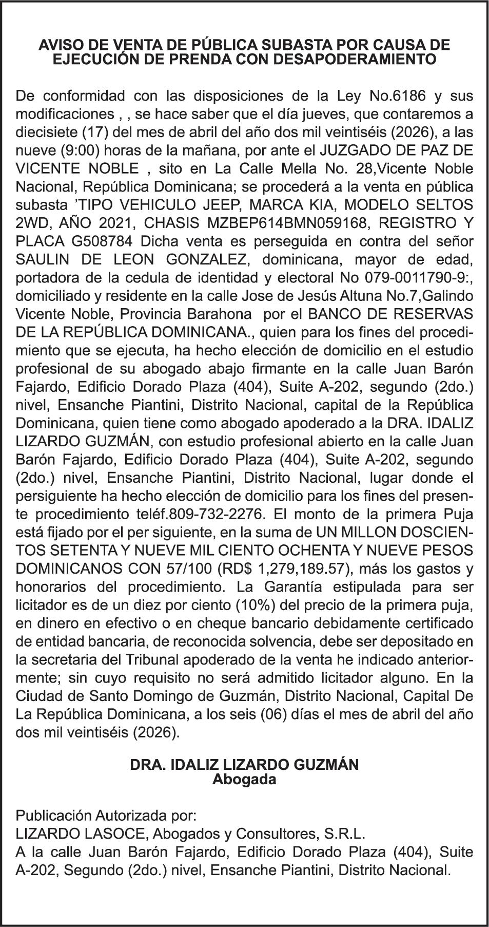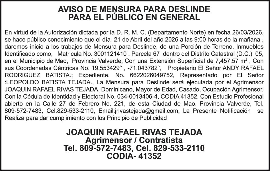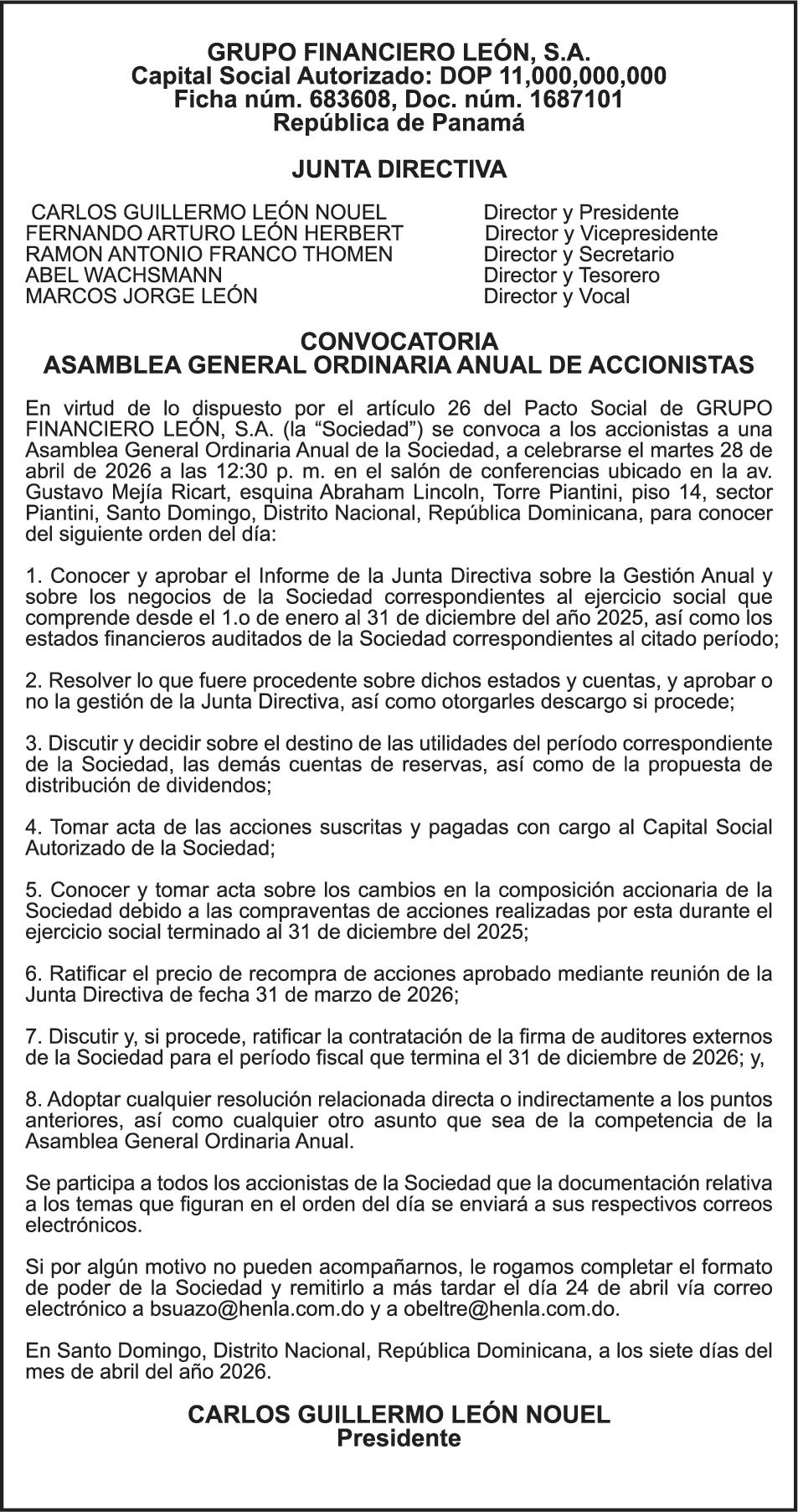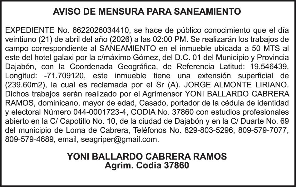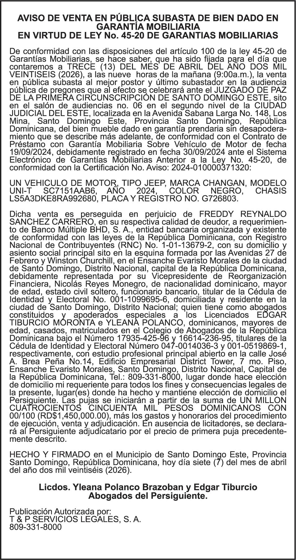 SE hace de público conocimiento la pérdida del Certificado Financiero número 848036166 emitido por Banco Popular Dominicano, S. A. Banco Múltiple, a nombre de WILFREDO HIDALGO UREÑA, portador de la Cédula de Identidad y Electoral número 001-0505604-8 , certificado número 848036166 expedido el 21 de marzo de 2025 por el monto de (USD$22,262.38) más intereses generados a la fecha.