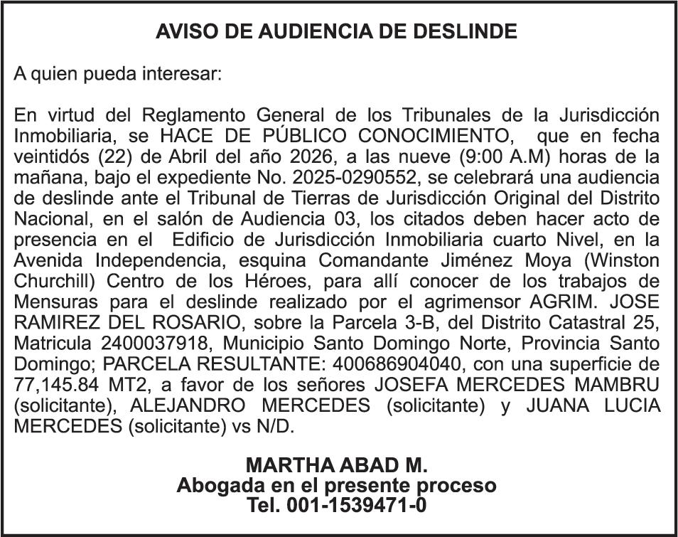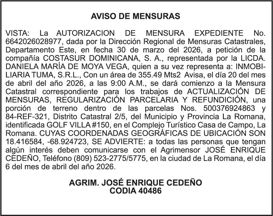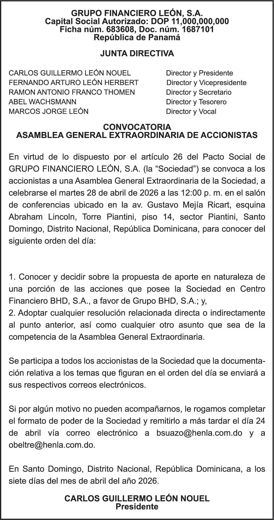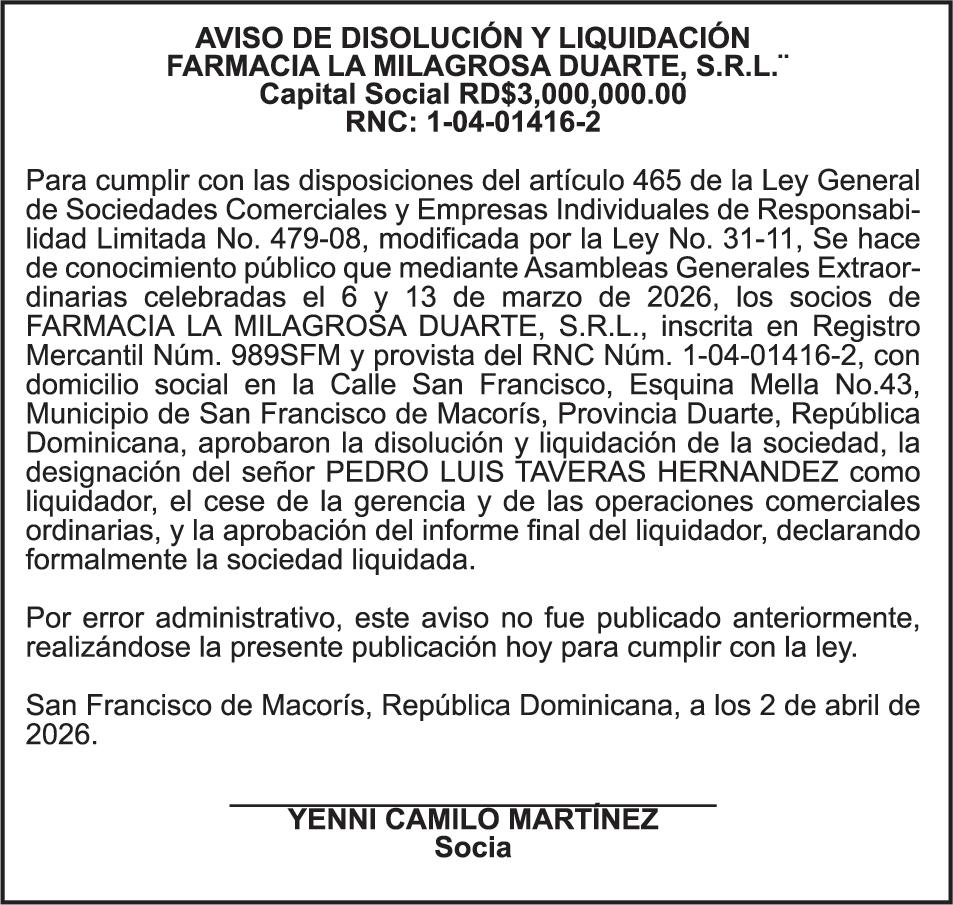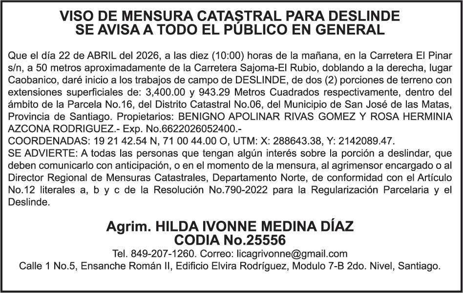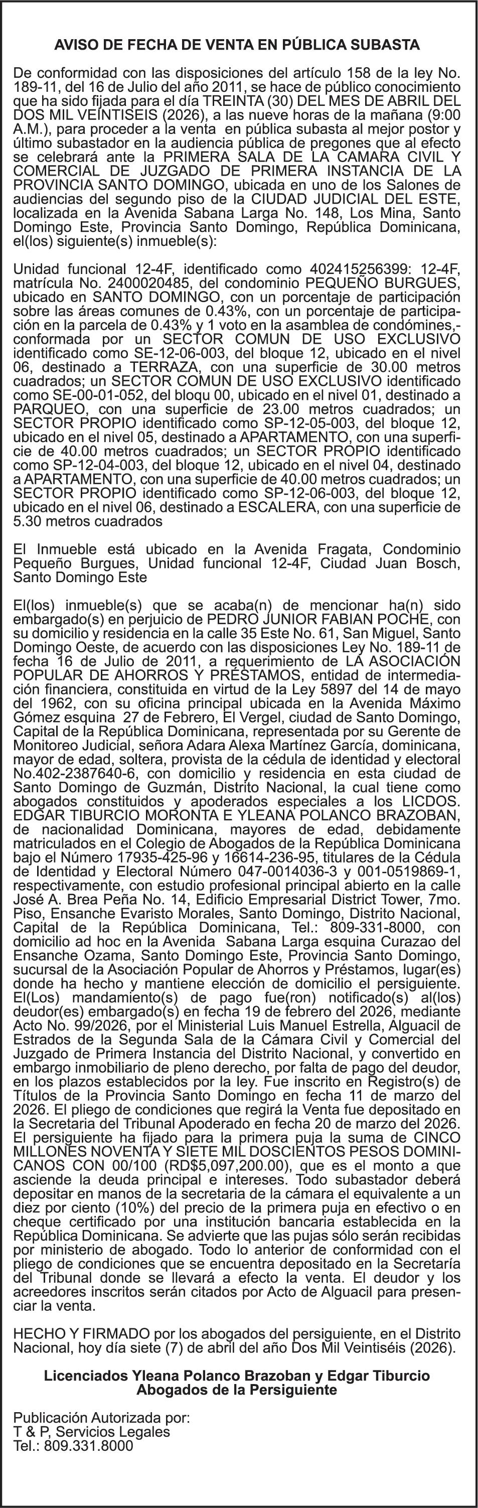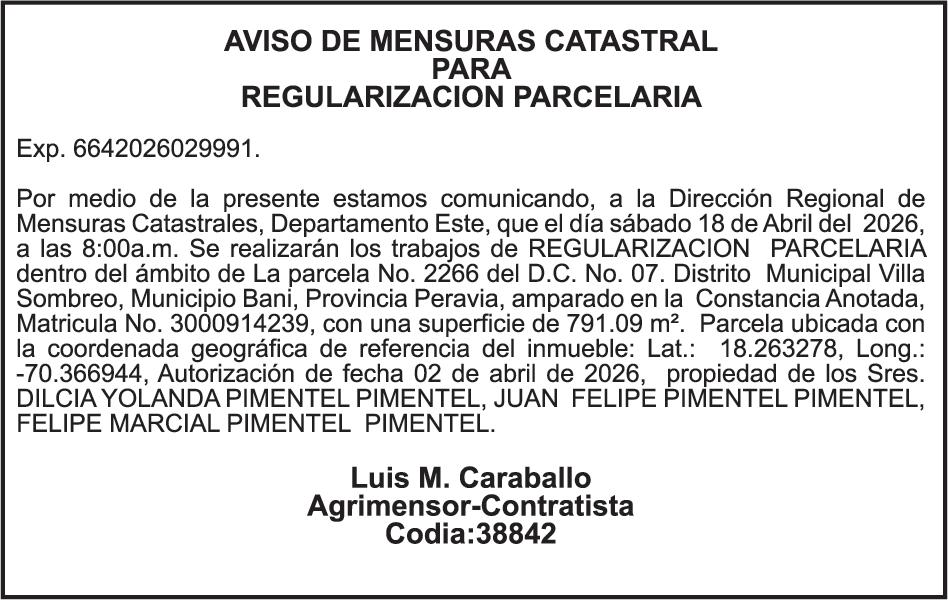 SE hace de público conocimiento la pérdida del Certificado Financiero número 848036166 emitido por Banco Popular Dominicano, S. A. Banco Múltiple, a nombre de WILFREDO HIDALGO UREÑA, portador de la Cédula de Identidad y Electoral número 001-0505604-8 , certificado número 848036166 expedido el 21 de marzo de 2025 por el monto de (USD$22,262.38) más intereses generados a la fecha.