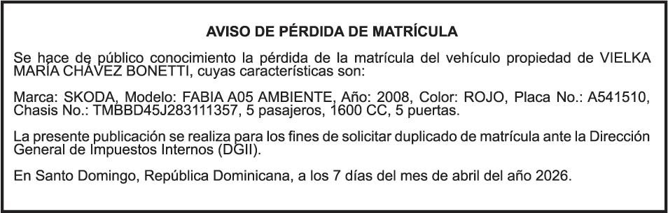 PERDIDA DE MATRICULA Veh. Carga SKODA, modelo FELICIA, color verde, año 1996, placa L257895, chasi s TMBEEA873T5280346, a nombre de HORMIGONES CIBAO S.A