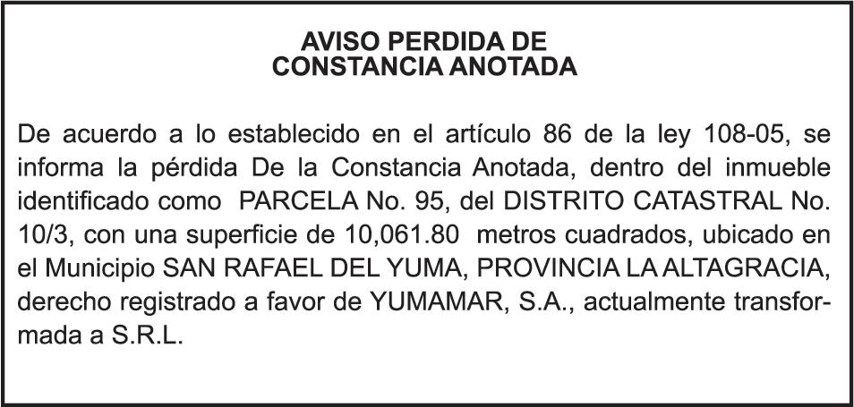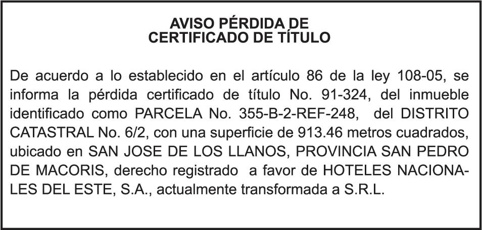 SE hace de público conocimiento la pérdida del Certificado Financiero número 716351101 emitido por Banco Popular Dominicano, S. A. Banco Múltiple, SORAYA VIRGINIA PARDILLA CARTAGENA, portadora de la Cédula de Identidad y Electoral número 001-0955002-0 y HERNAN MARIA PARDILLA FERNANDEZ, portador de la Cédula de Identidad y Electoral número 001-0002169-0 certificado número 716351101, expedido en fecha 11 de marzo de 2004 por el monto de (RD$11,455.94) más intereses generados a la fecha.