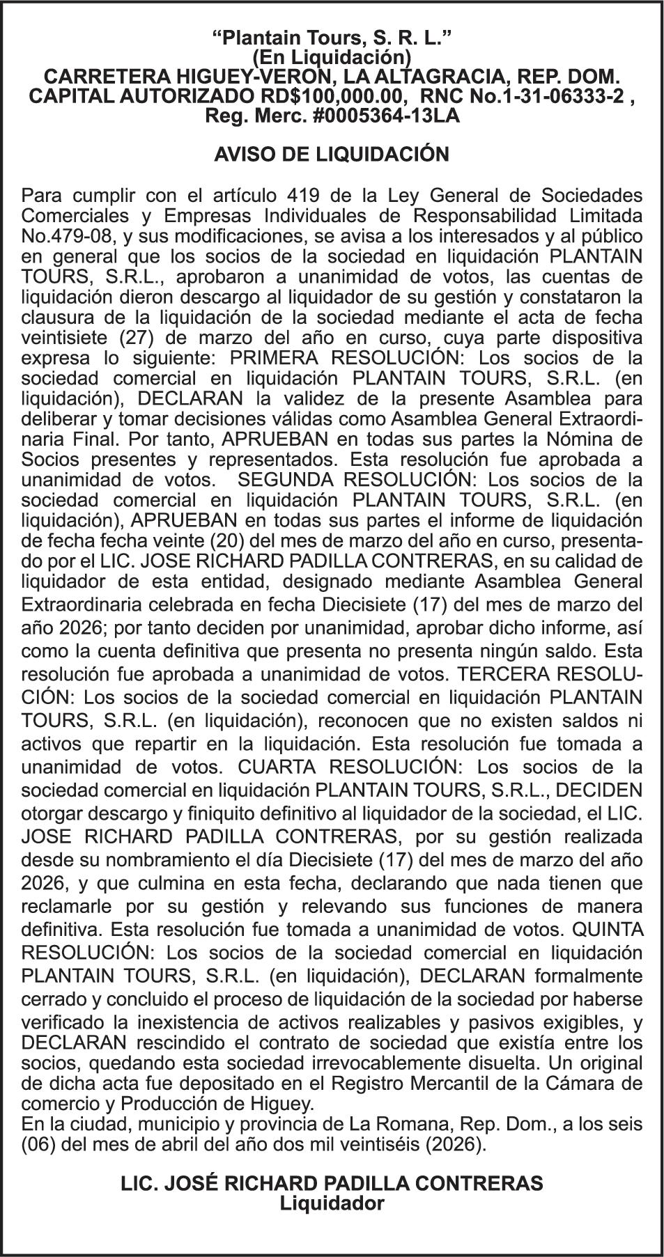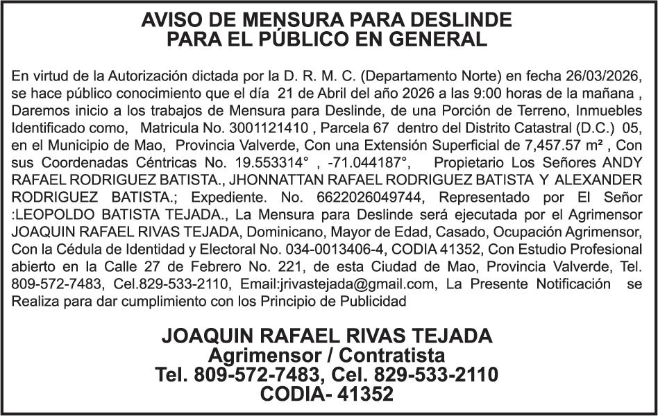 AVISO TRASPASO DE EMBARCACION.EL señor JOSE MIGUEL MATOS CUSTODIO, traspasa el bote de pesca denombre ;LUIS MANUELA” matricula No. BP-L49-446H, de 19.0 pies de eslora, para queen lo adelante figure a nombre del señor VICTOR MANUEL NUÑEZ como nuevo propietario.