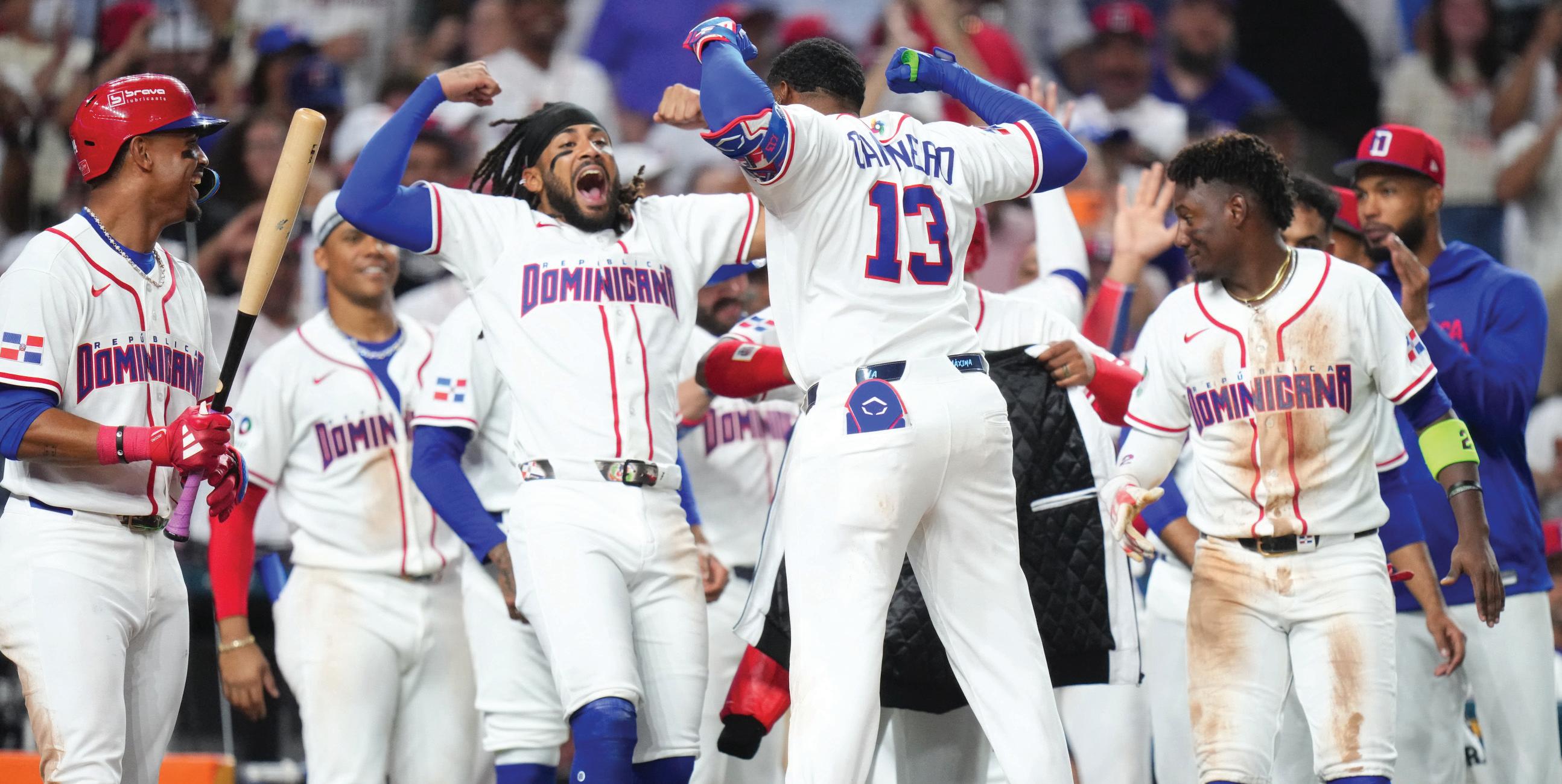 Junior Caminero celebra con sus compañeros tras disparar un jonrón en la sexta entrada en la victoria de su equipo en el inicio del Clásico
