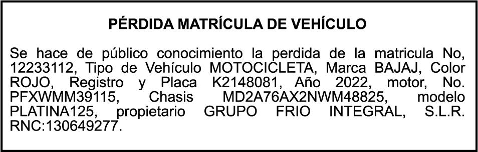 PERDIDA DE MATRICULA Motocicleta HONDA, modelo NVA110M, color azul, año 2022, placa K2594401, chasis ME4JK0993ND061329, a nombre de SHENY BATISTA FELIZ.