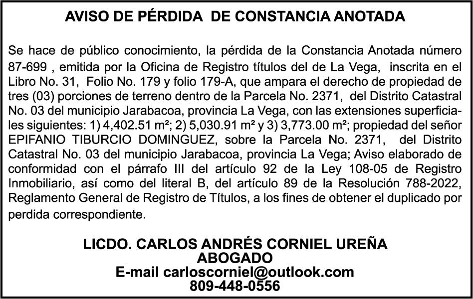 PERDIDA DE PLACA No. L274945, Veh. Carga DAIHATSU, Modelo V11 8L HY, Color rojo, Año 2000, Chasis V118014033, a nombre de ELIAS SAMUEL PLACENCIO MOTA, Ced. 068-0037488-3.