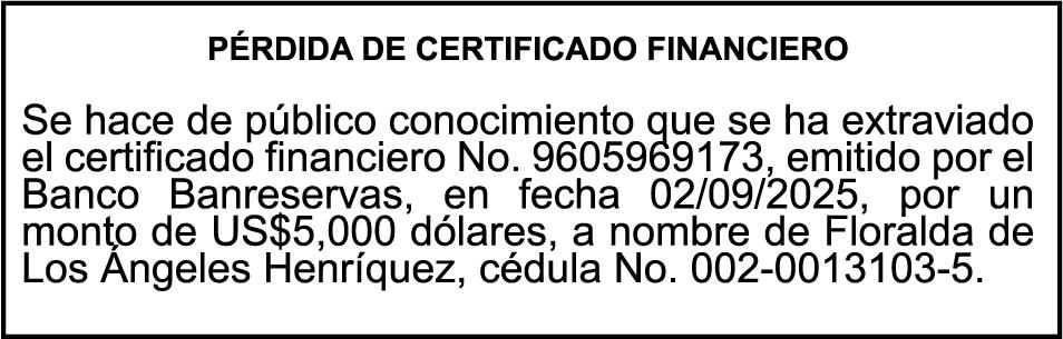 PERDIDA DE PLACA.NO.K2039492,Chasis LBEJLX14TKA127851,Marca TURANO,Modelo CG150,Color NEGRO,Año 2019, a nombre de RAMON FELICIANO PERALTA LUNA,Ced.054-0058561-7