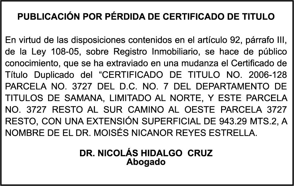 PERDIDA DE PLACA No. K0178551, Motocicleta YAMAHA, Modelo RX-S, Color negro, Año 2002, Chasis MH33HB0082K259084, a nombre de FERMIN ANTONIO PEÑA FELIZ, Ced. 020-0013395-5.