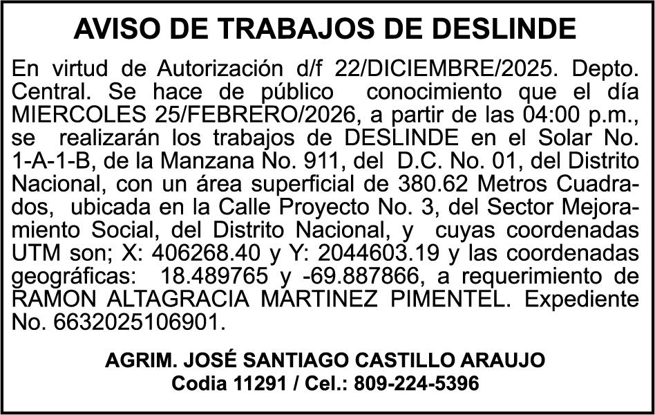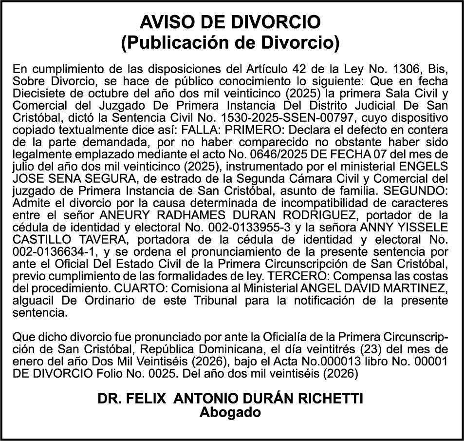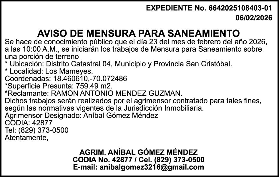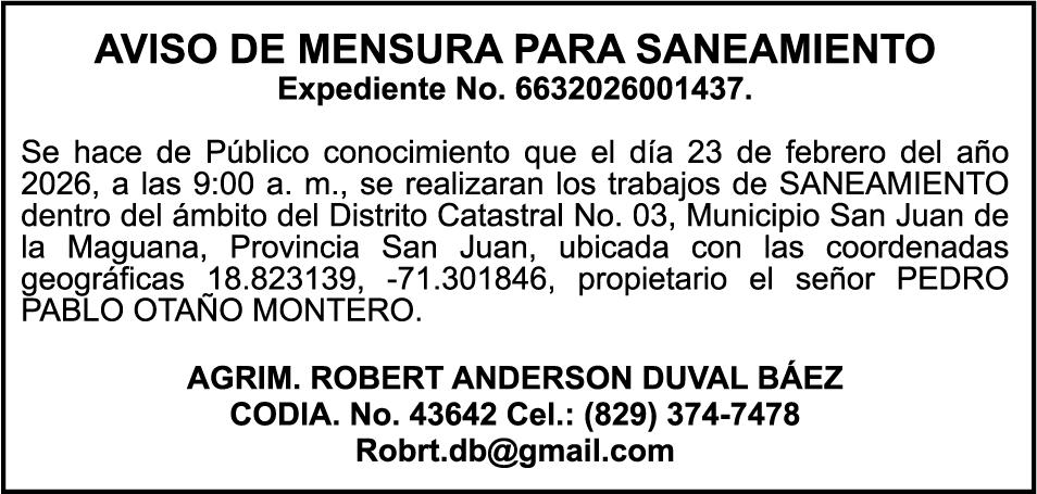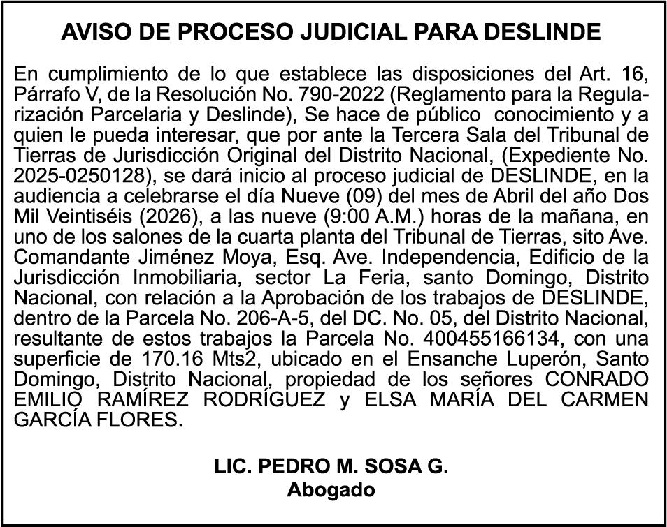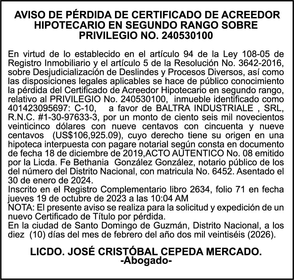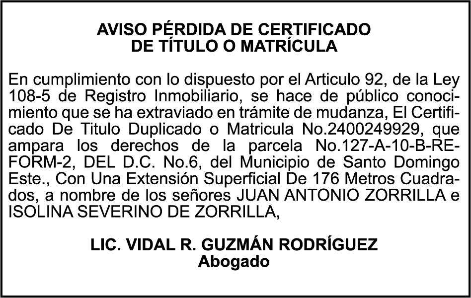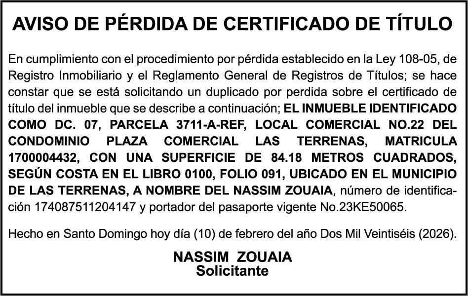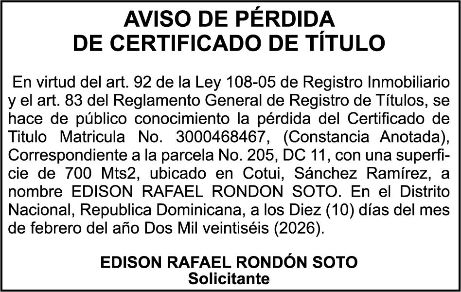 SE hace de público conocimiento la pérdida del Certificado Financiero número 850937046 emitido por Banco Popular Dominicano, S. A. Banco Múltiple, a nombre de ISIDRO ALBERTO SANTANA NUÑEZ, portador de la Cédula de Identidad y Electoral número 001-0102786-0, certificado número 850937046 expedido el 4 de agosto de 2025 por el monto de (RD$6,201,945.37) más intereses generados a la fecha.