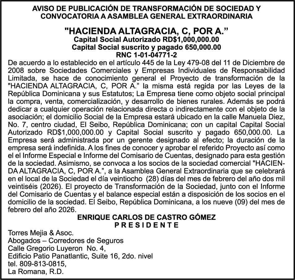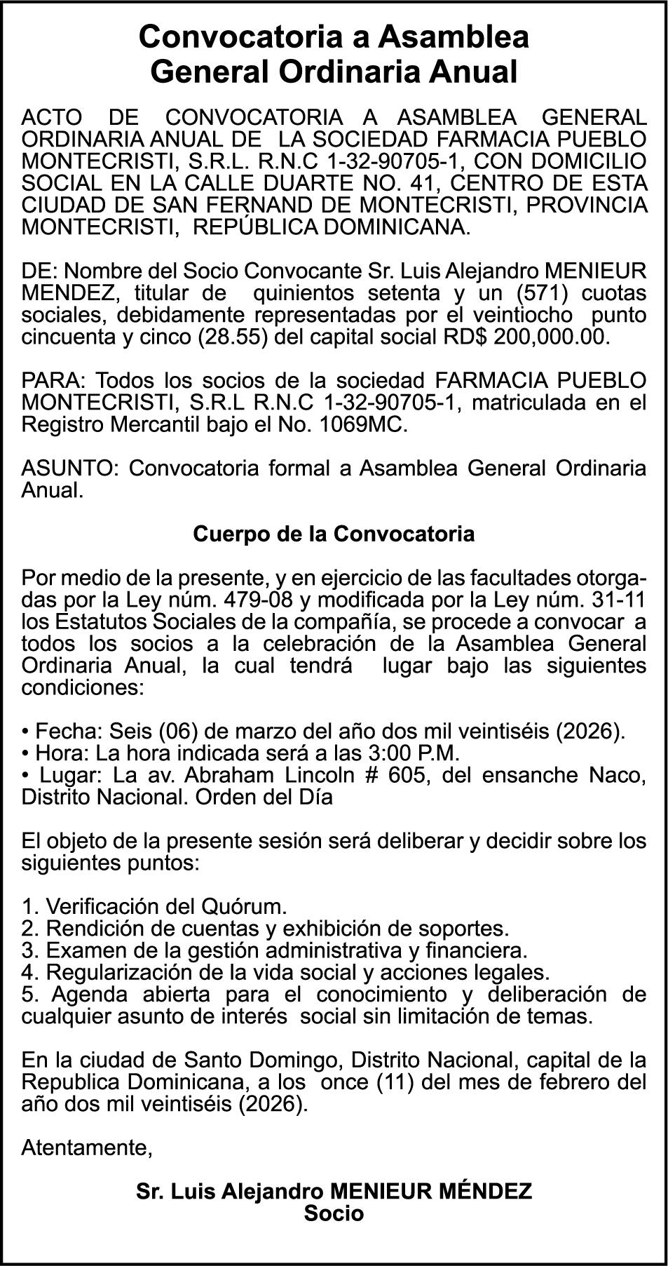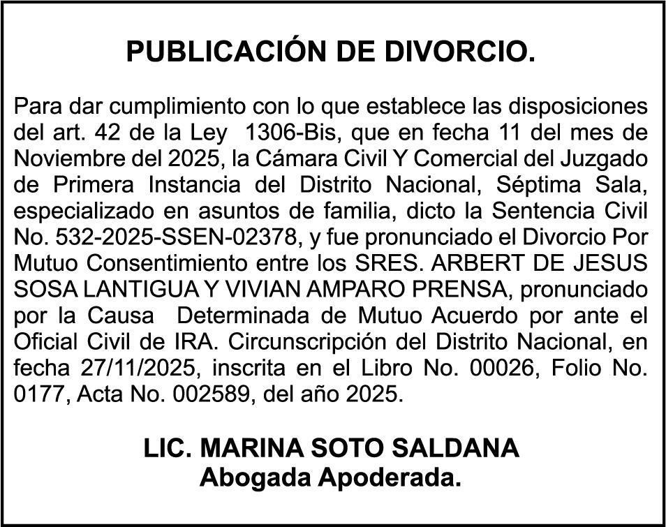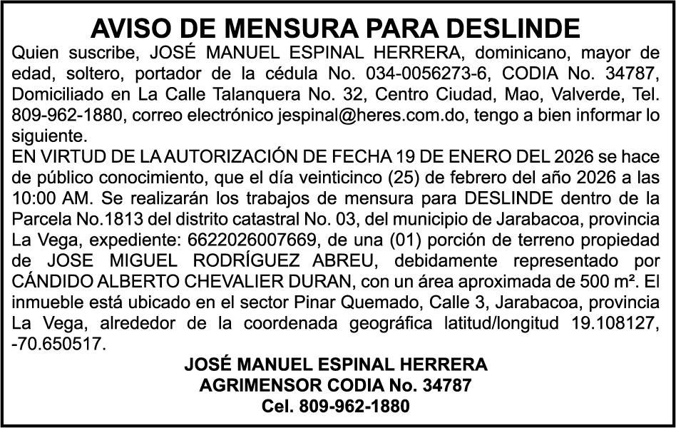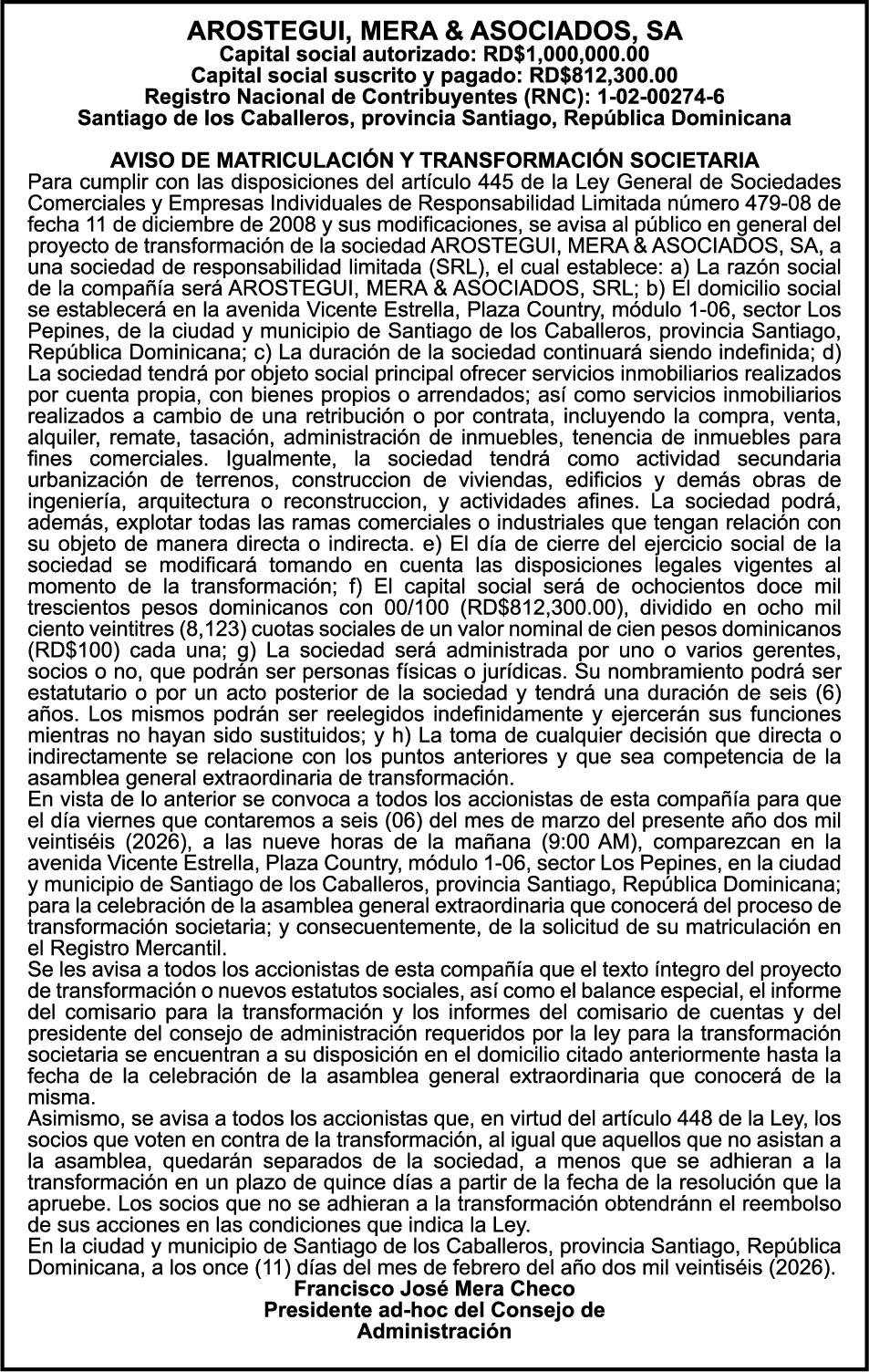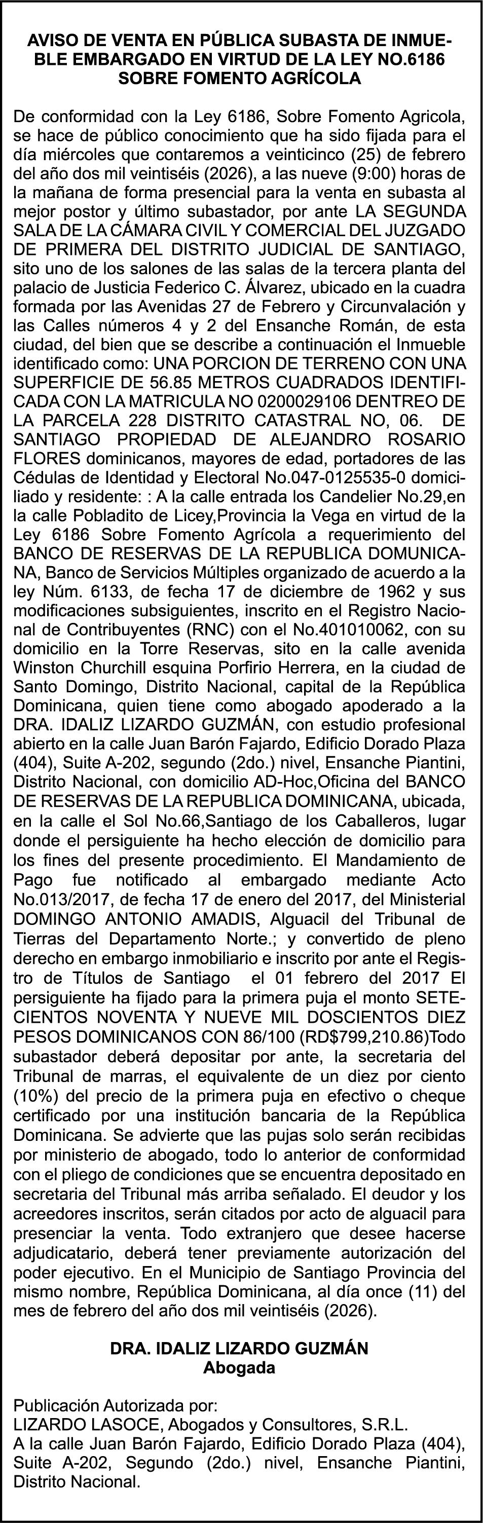 SE hace de público conocimiento la pérdida del Certificado Financiero número 850937046 emitido por Banco Popular Dominicano, S. A. Banco Múltiple, a nombre de ISIDRO ALBERTO SANTANA NUÑEZ, portador de la Cédula de Identidad y Electoral número 001-0102786-0, certificado número 850937046 expedido el 4 de agosto de 2025 por el monto de (RD$6,201,945.37) más intereses generados a la fecha.