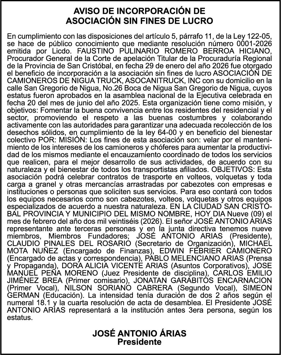 PERDIDA DE MATRICULA:Placa L025620,Chasis VG6BA03B8GB050402,Marca MACK, Color BLANCO, AÑO 1986, a nombre de RAMON ANTONIO GENAO GORIS,Ced. 03100321391