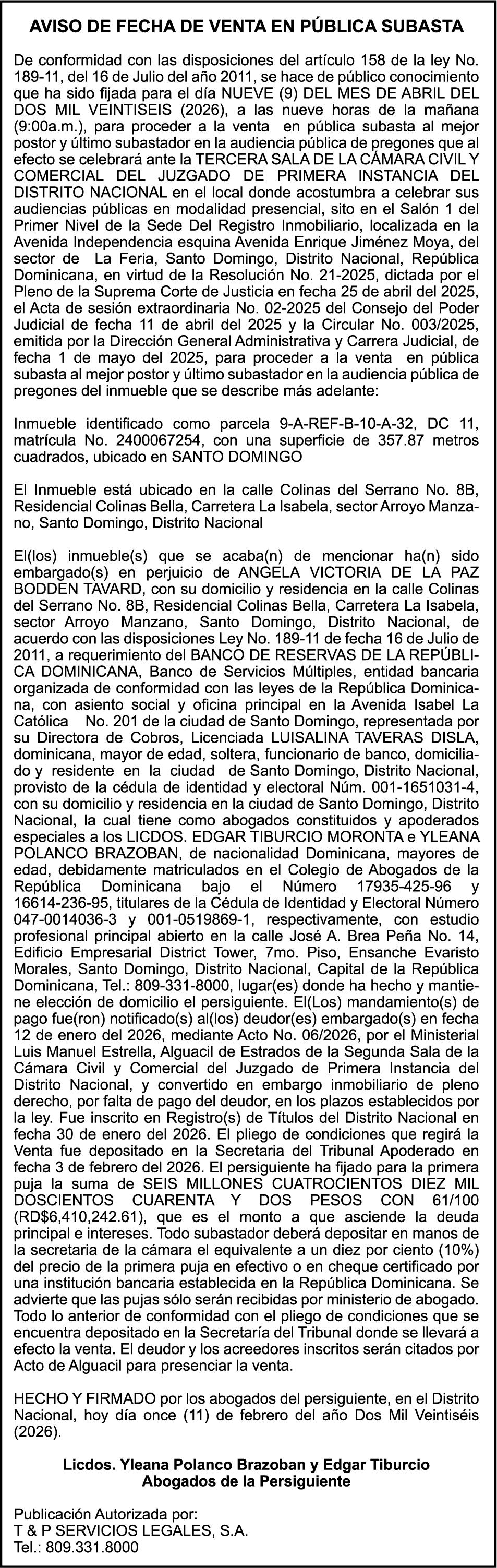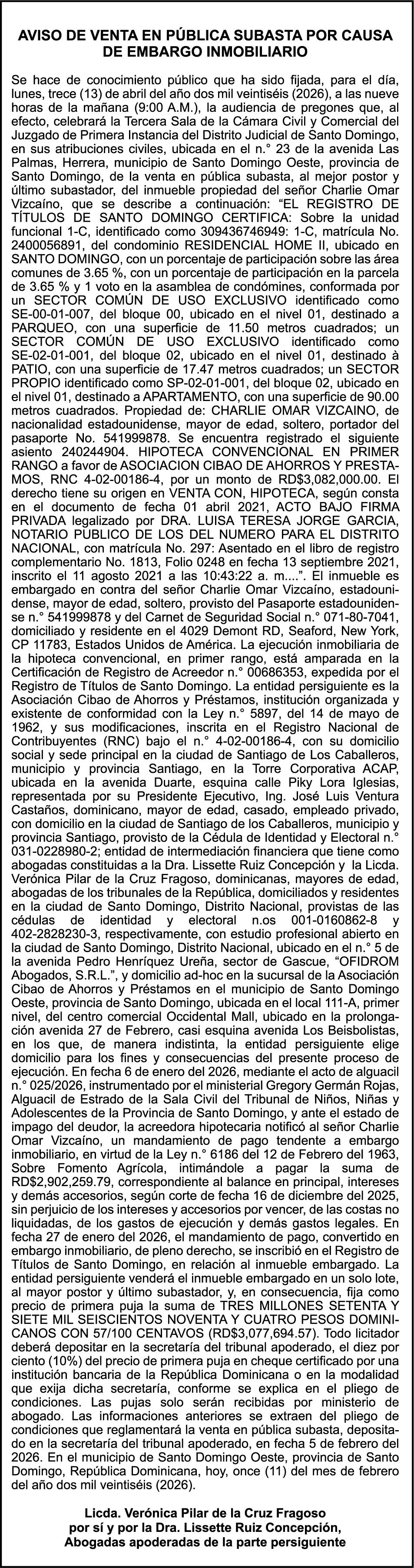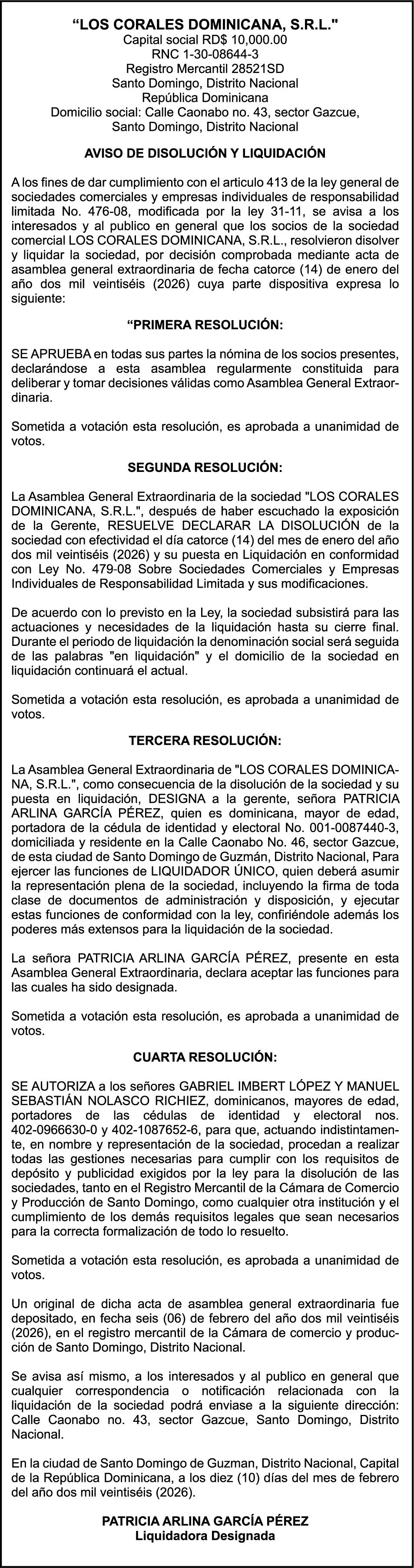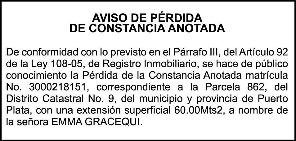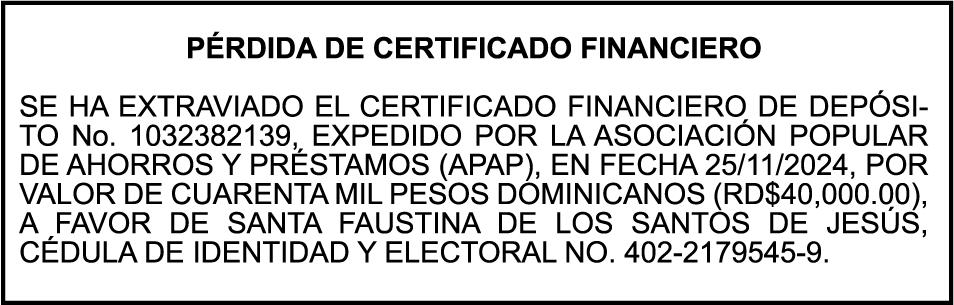 SE hace de público conocimiento la pérdida del Certificado Financiero número 845703313 emitido por Banco Popular Dominicano, S. A. Banco Múltiple, a nombre de MARIA SOLEDAD CARELA ORTIZ, portadora de la Cédula de Identidad y Electoral número 093-0011515-2, certificado número 845703313 expedido en fecha 29 de noviembre de 2024 por el monto de (RD$105,417.90) más intereses generados a la fecha.