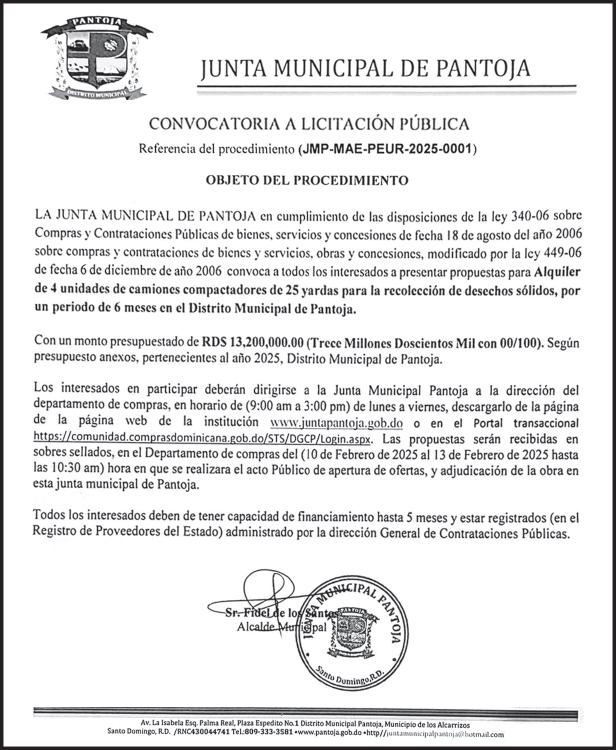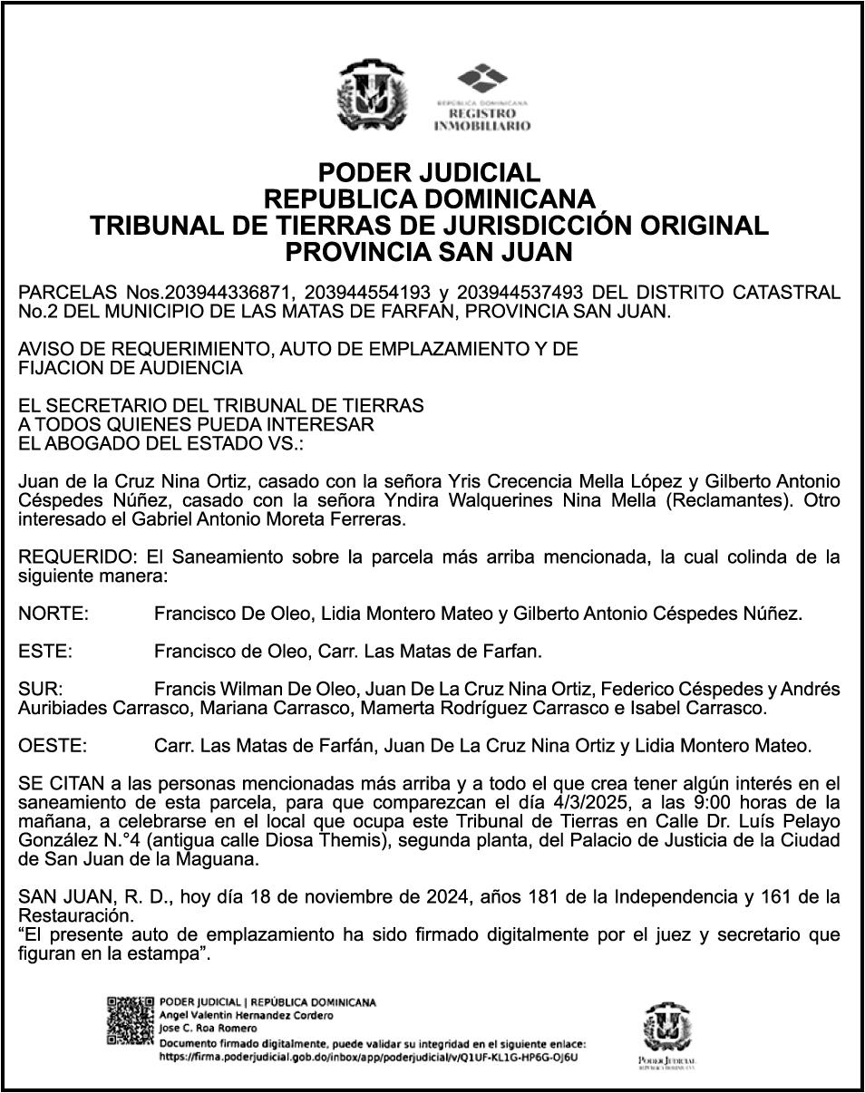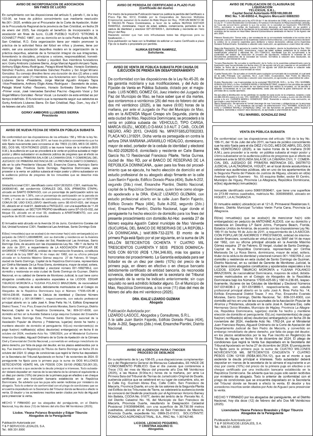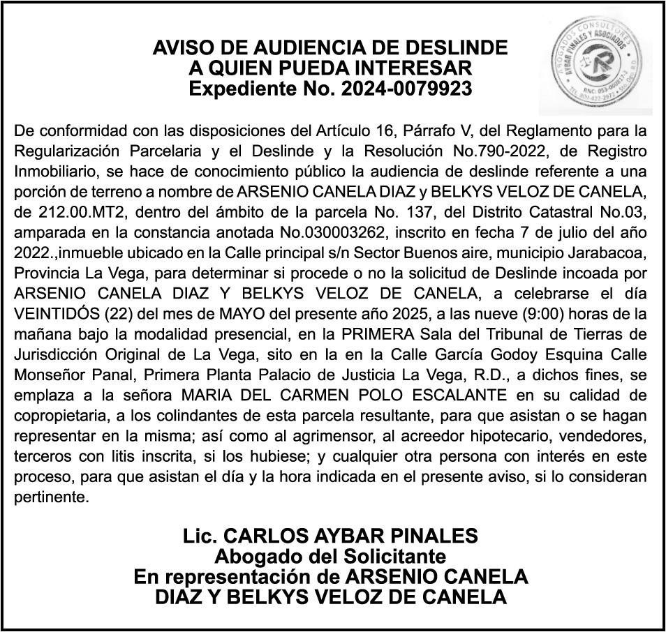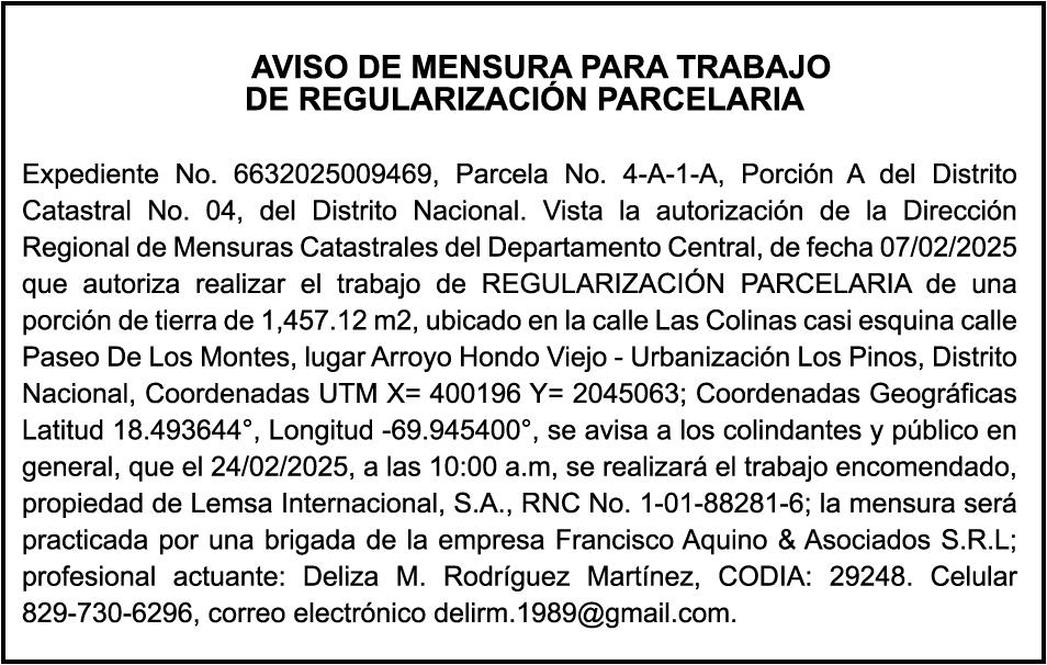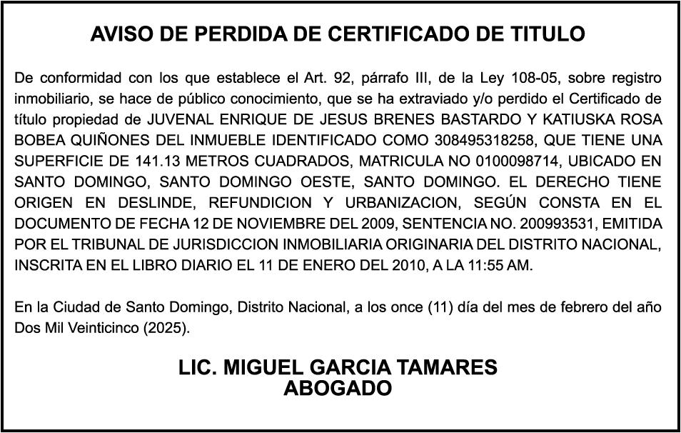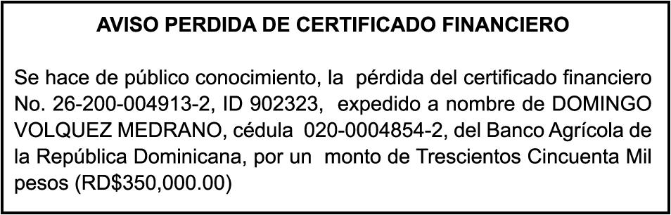 SE hace de público conocimiento la pérdida del Certificado Financiero número 844512798 emitido por Banco Popular Dominicano, S. A., a nombre de RADHAMES PANIAGUA DE LOS SANTOS, portador de la Cédula de Identidad y Electoral número 0011204481-3, certificado número 844512798 expedido en fecha 3 de octubre del 2024 por el monto de (RD$74,533.65), más intereses generados a la fecha.