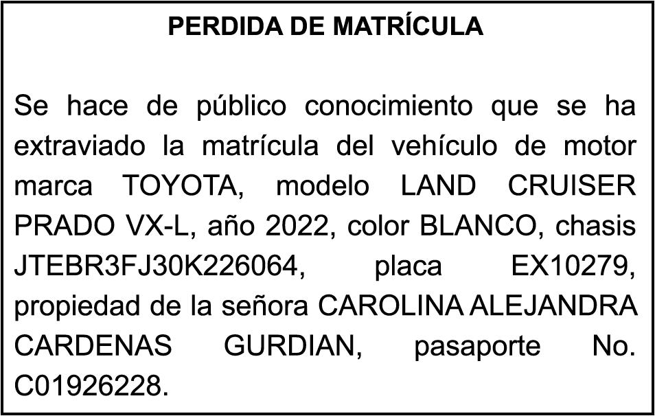 PERDIDA DE MATRICULA, Chasis: RN36010546 , Placa: L304773 , Marca: Toyota , Modelo: Hi lux , Color: Rojo , Año de Fabricación: 1980, Nombre: José Octavio Vasquez Brito Pasaporte: 5-32-29897-1