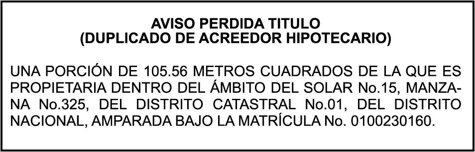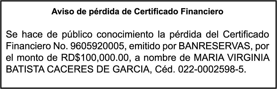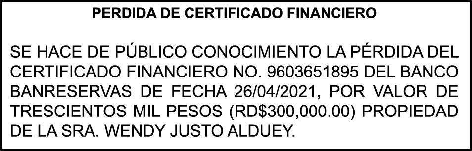 SE hace de público conocimiento la pérdida del Certificado Financiero número 784527566 emitido por Banco Popular Dominicano, S. A., a nombre de CONSEJO DE GOBERNADORES DE LOS CLUBES DE LEONES DISTRITO MULTIPLE R., (RNC 430-050318), certificado número 784527566 expedido en fecha 26 de febrero del 2014 por el monto de (RD$25,000.00), más intereses generados a la fecha.