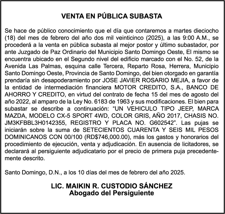 Jeep KIA, Color gris, año 2017, Placa G570914, Chasis 5XYPGDA50HG333610, a nombre de RSAMON ANTONIO VILLANUEVA WESSIN.