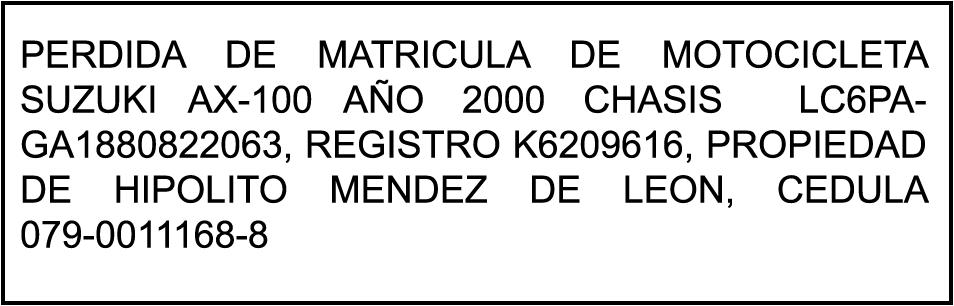 PERDIDA DE PLACA No. K1790597 de la motocicleta marca SUZUKI, Modelo AX100, año 2014, color ROJO, Chasis No. LC6PAGA17E0015934, a nombre de CARLOS MIGUEL DE LA CRUZ