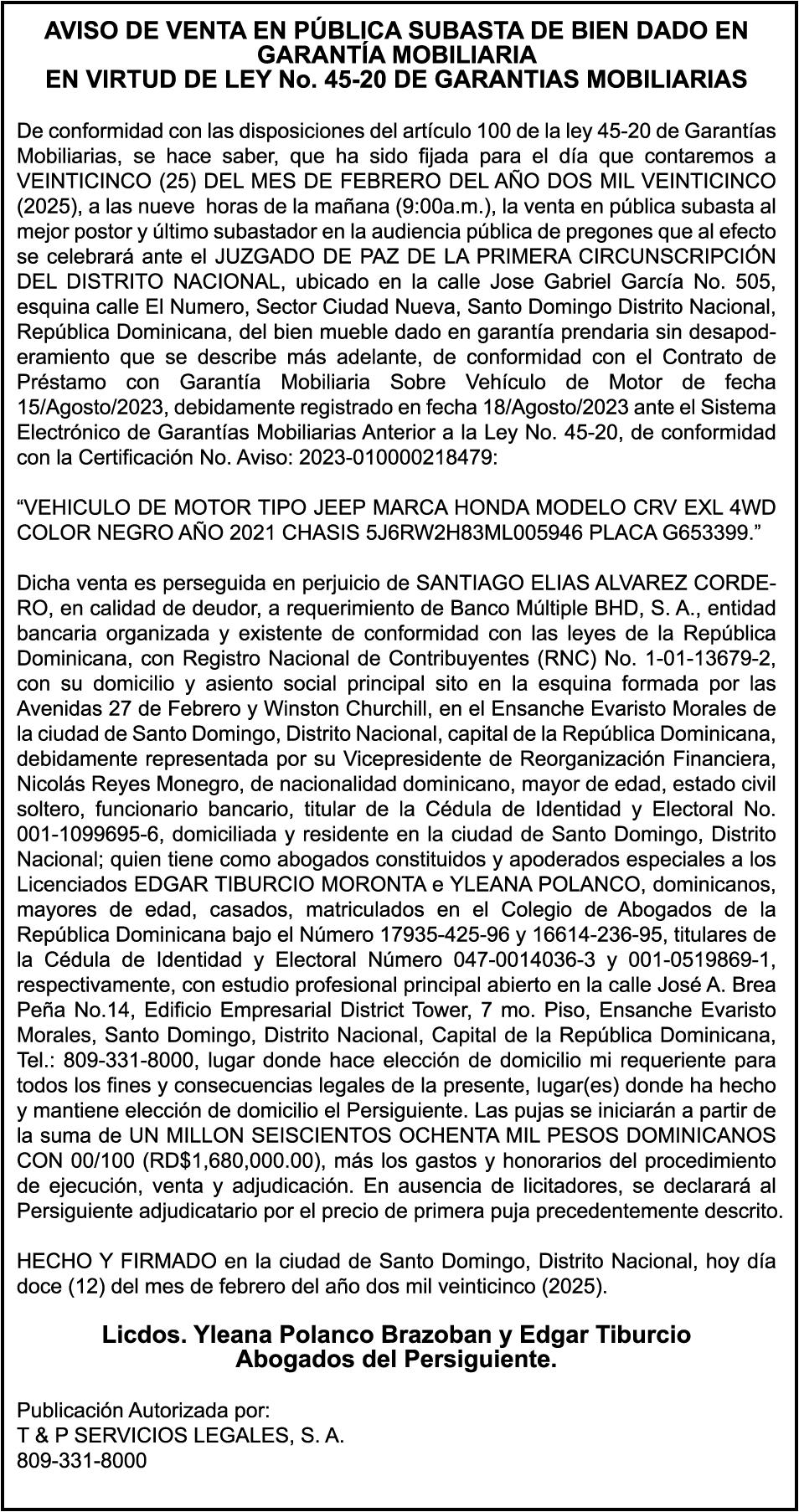 Del Vehiculo, Placa G212320, Chasis 1GNFK36329R237905, Marca CHEVROLET, Modelo CK10906, Color NEGRO, AñO 2009, a nombre de TOMMY ALBERTO GALAN GRULLON, Ced. 00200075562