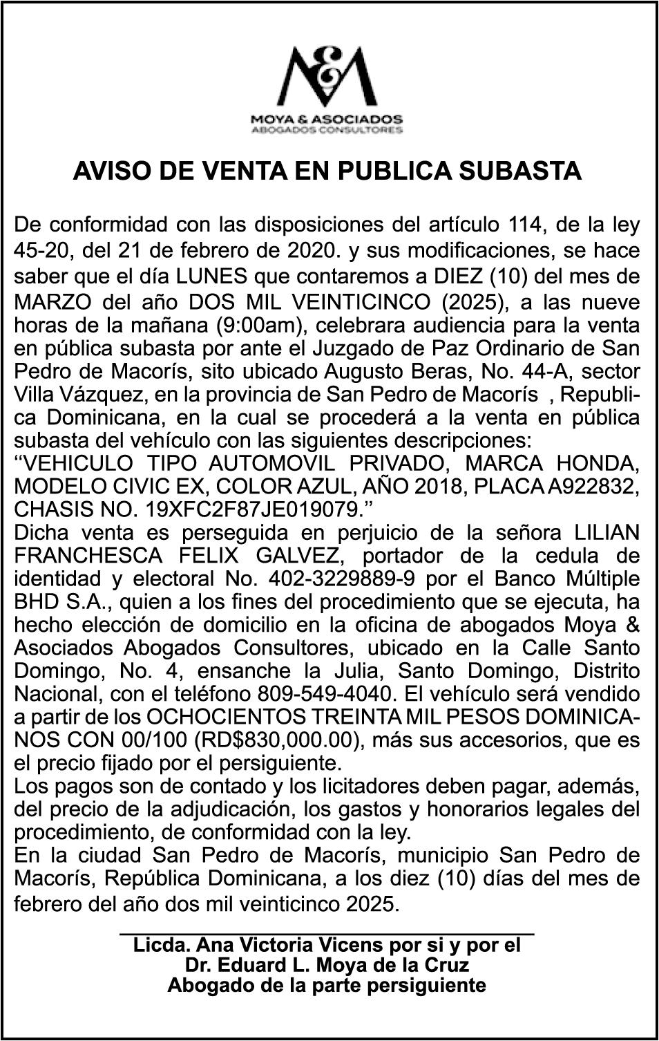 PERDIDA DE MATRICULA Automóvil Privado HONDA, Modelo ACCORD EX L, Color negro, Año 2000, Placa A604452, Chasis 1HGCP36828A028431, a nombre de FAUSTO OLIVIER MORETA SUBERVI.