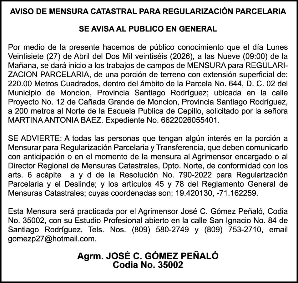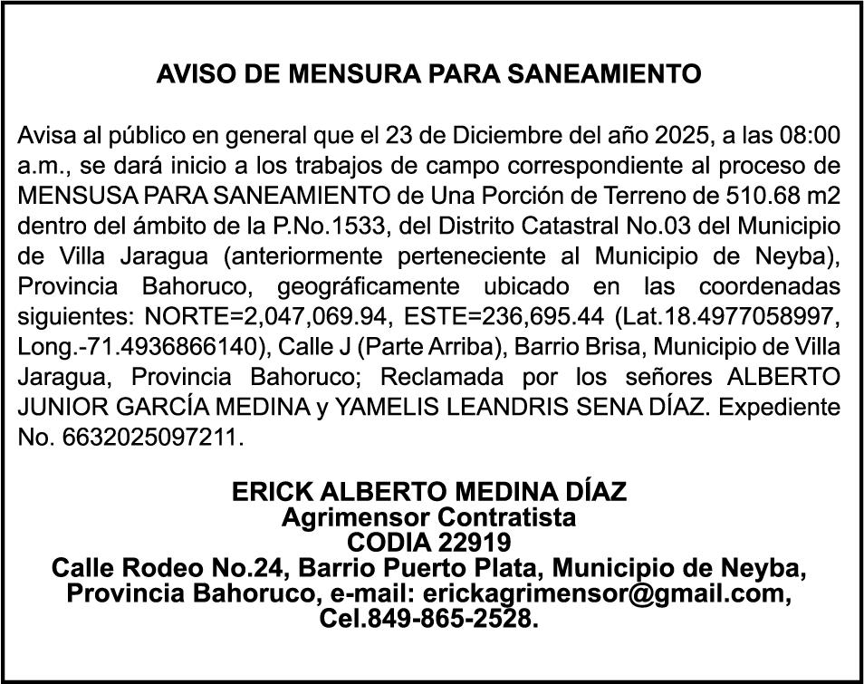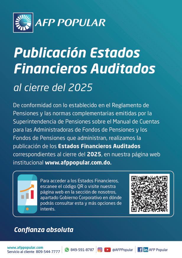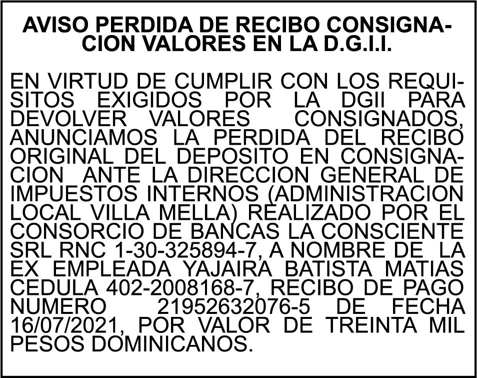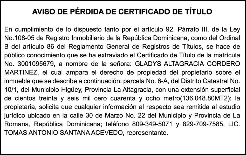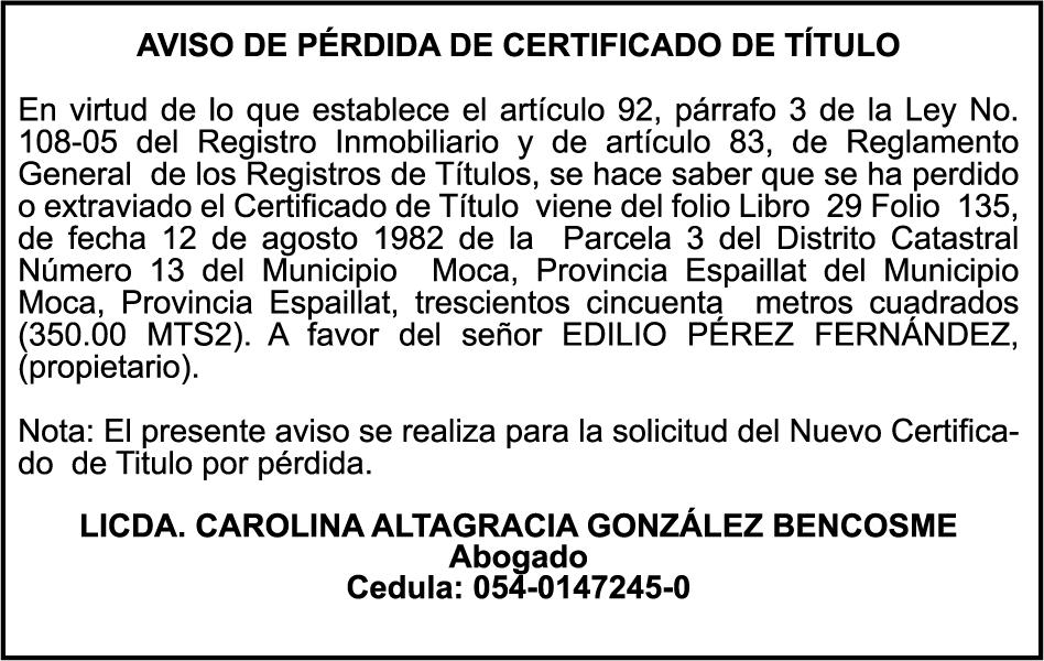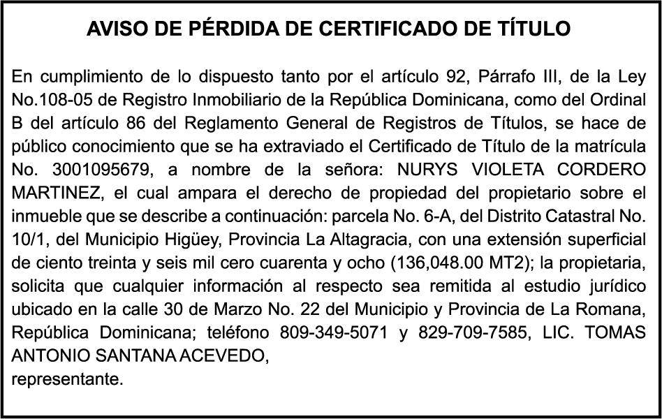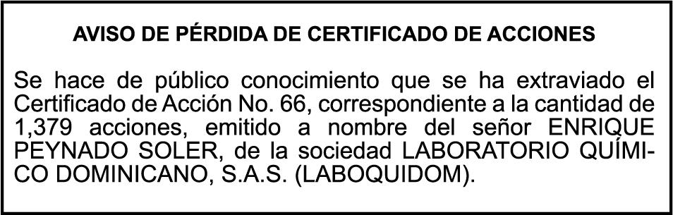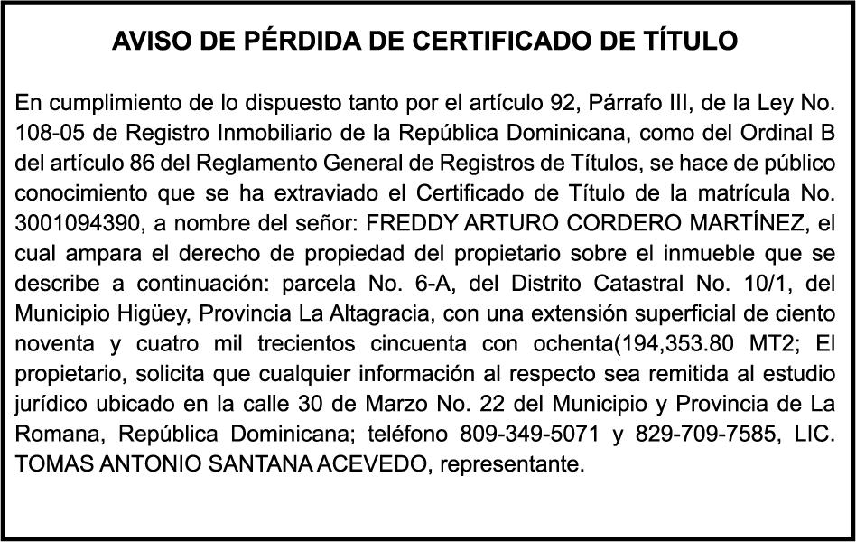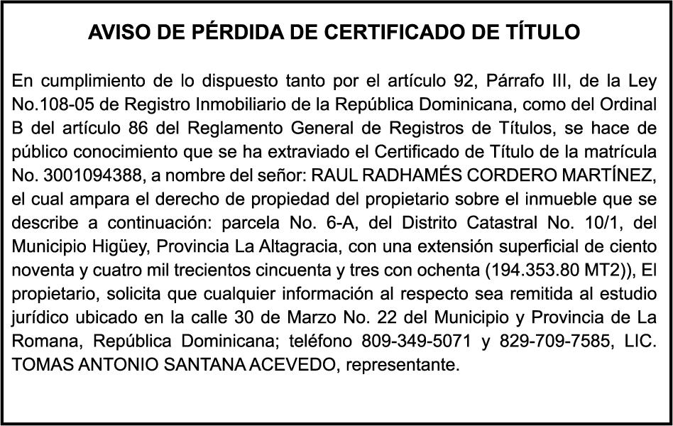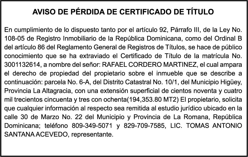 SE HACE de público conocimiento la pérdida del Certificado Financiero número 850227810 emitido por Banco Popular Dominicano, S. A. Banco Múltiple, a nombre de ALBIERIS MIGUEL GRULLON VALERIO, portador de la Cédula de Identidad y Electoral número 402-3855170-5, certificado número 850227810 expedido el 1 de julio de 2025 por el monto de (RD$52,157.22) más intereses generados a la fecha.