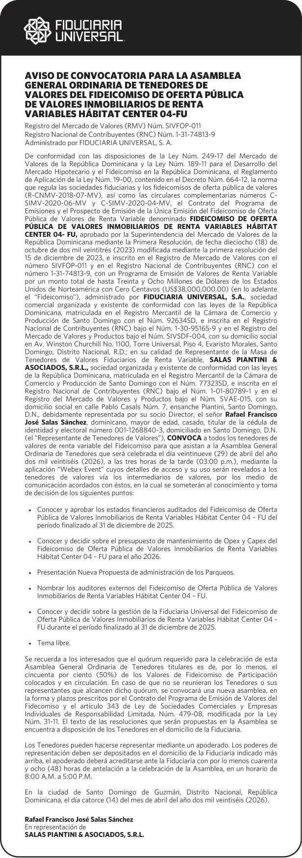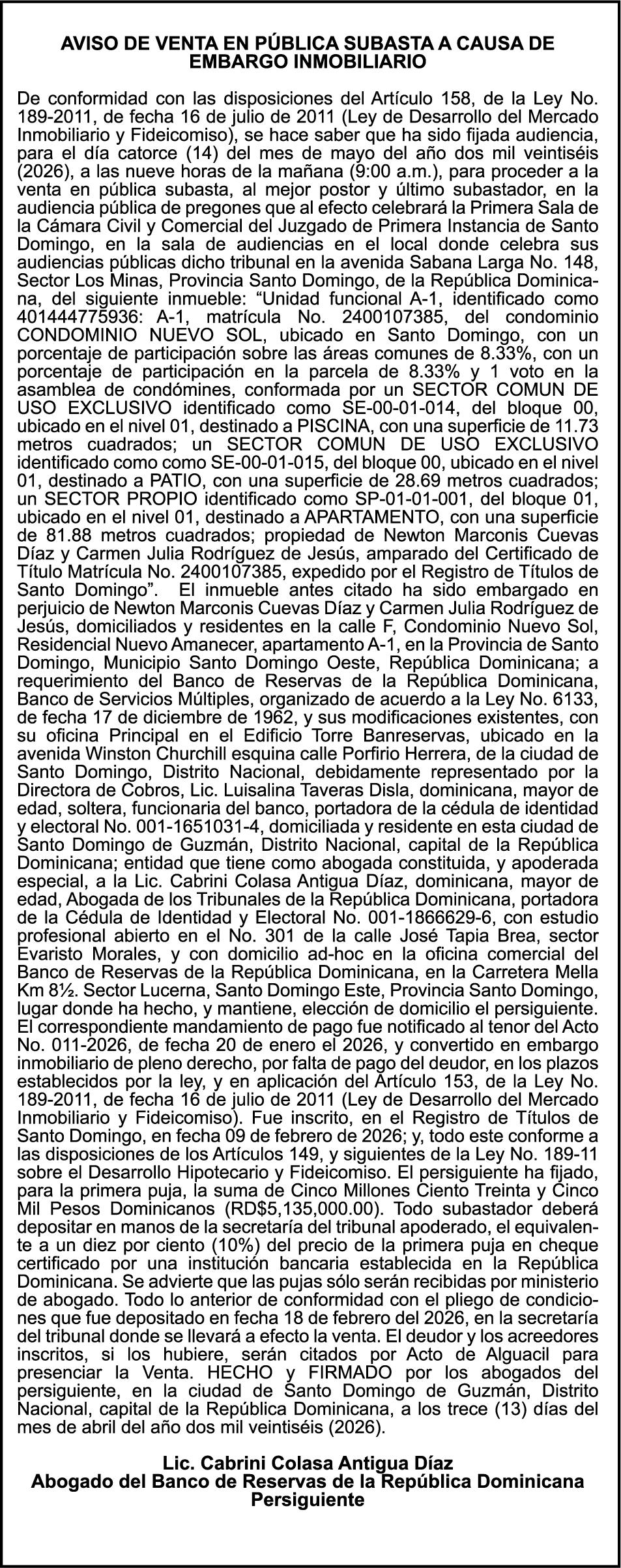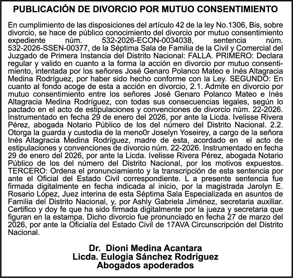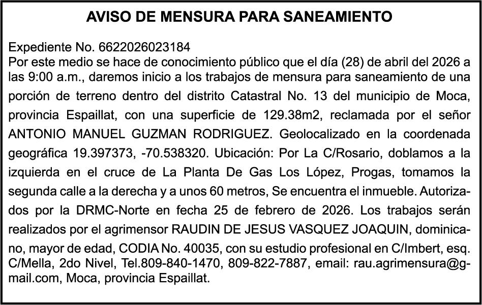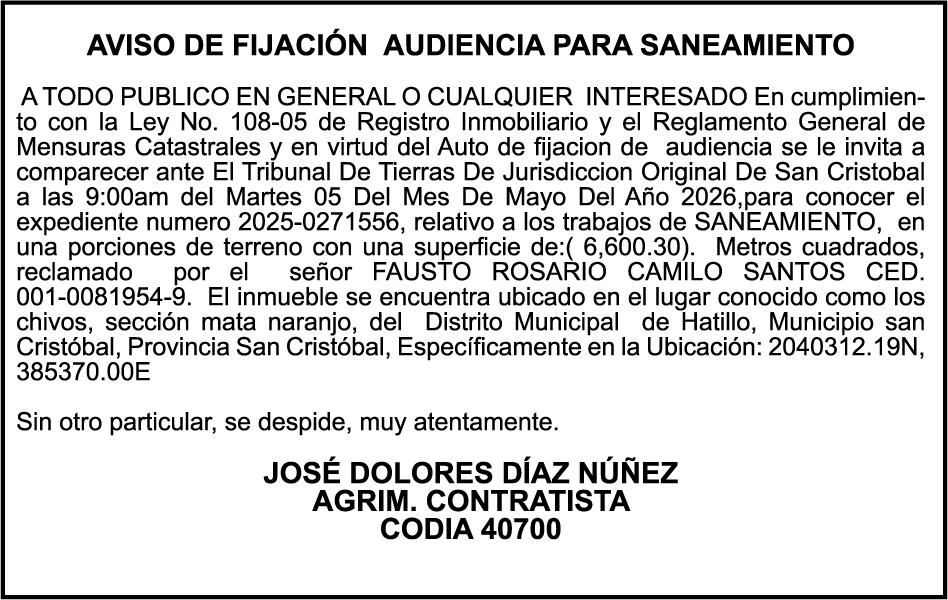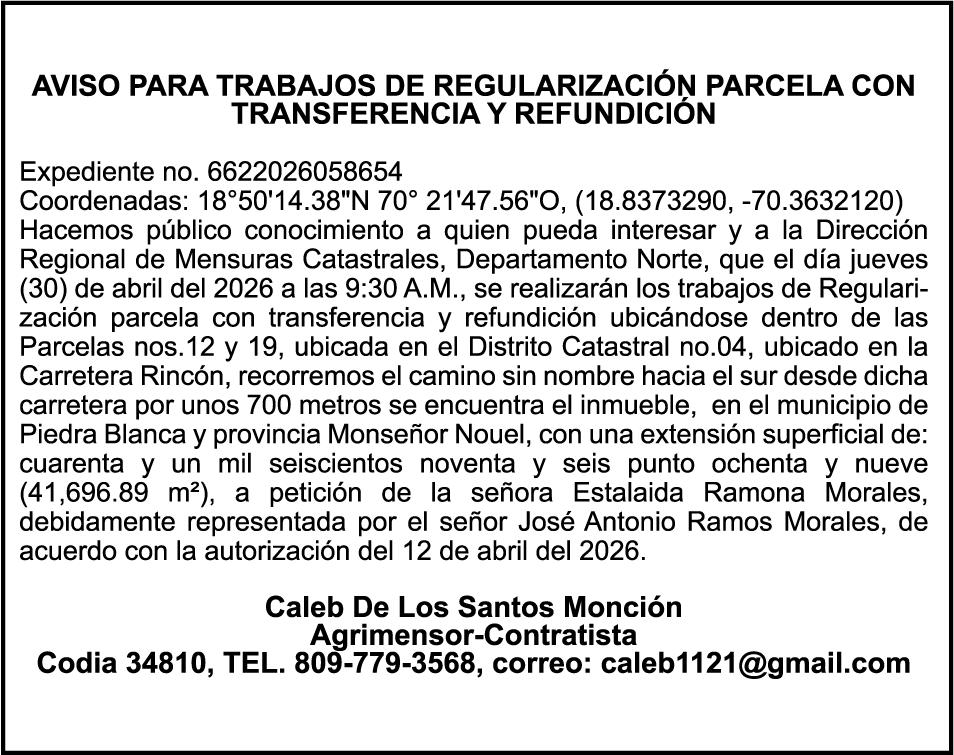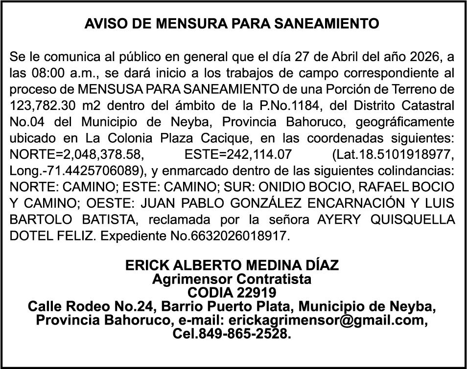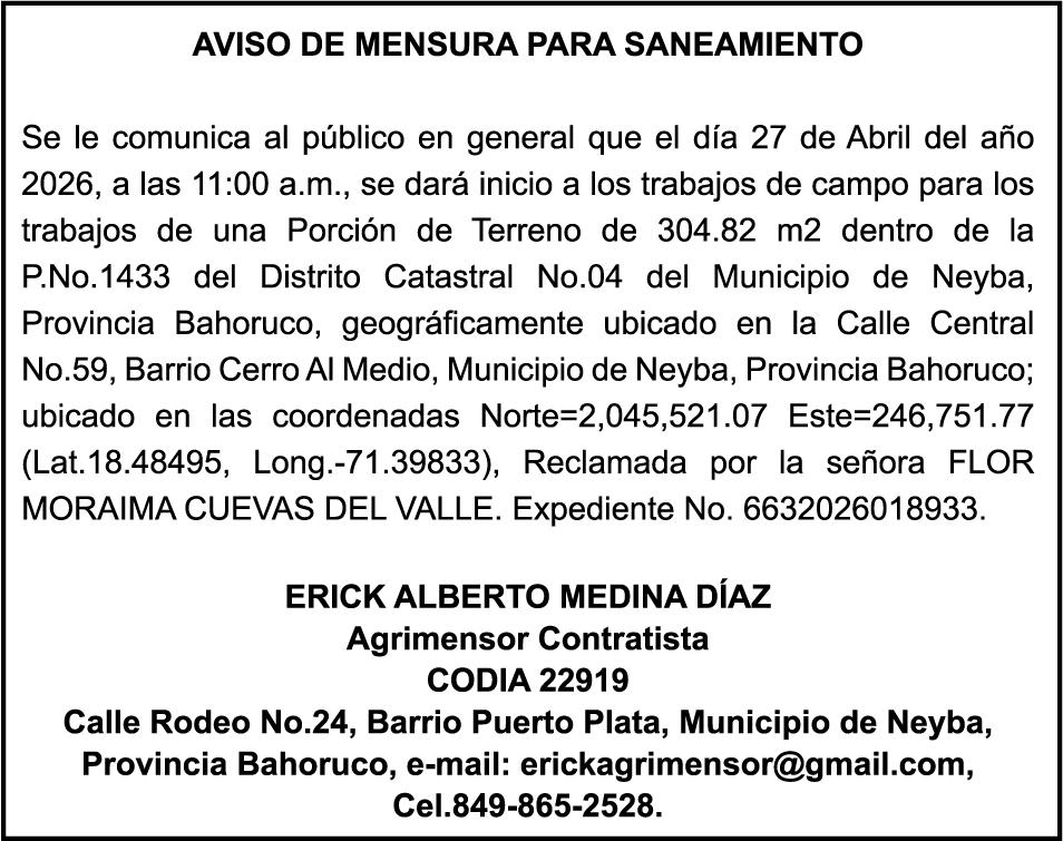 SE HACE de público conocimiento la pérdida del Certificado Financiero número 850227810 emitido por Banco Popular Dominicano, S. A. Banco Múltiple, a nombre de ALBIERIS MIGUEL GRULLON VALERIO, portador de la Cédula de Identidad y Electoral número 402-3855170-5, certificado número 850227810 expedido el 1 de julio de 2025 por el monto de (RD$52,157.22) más intereses generados a la fecha.