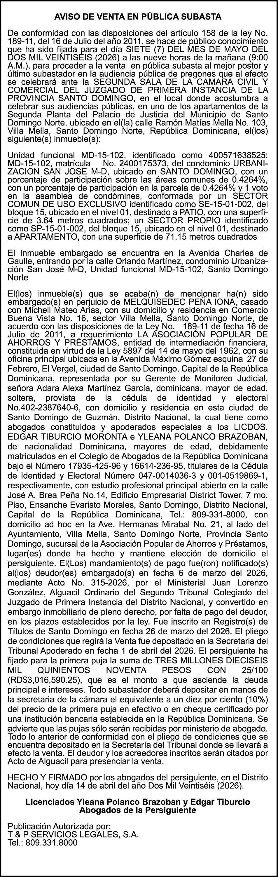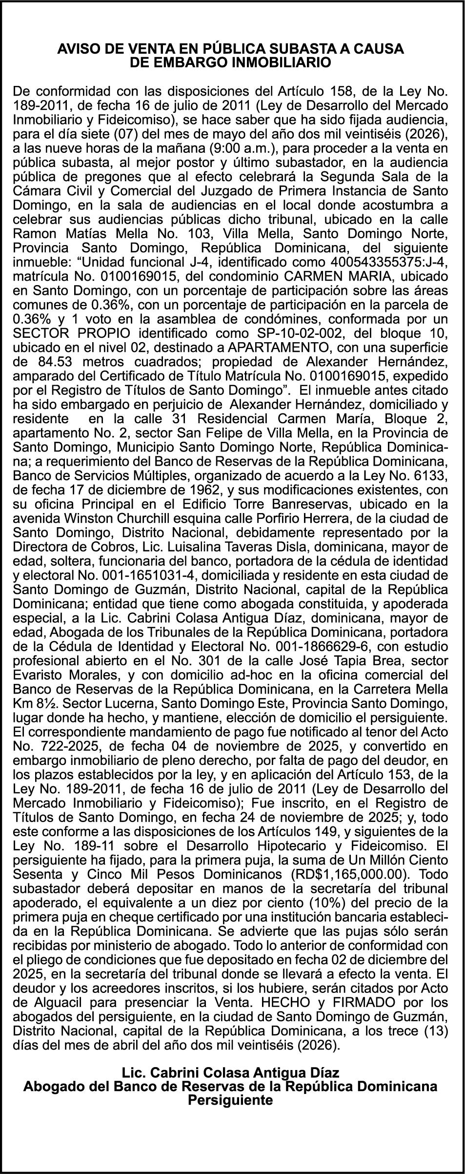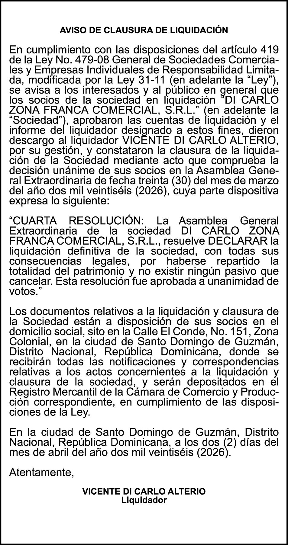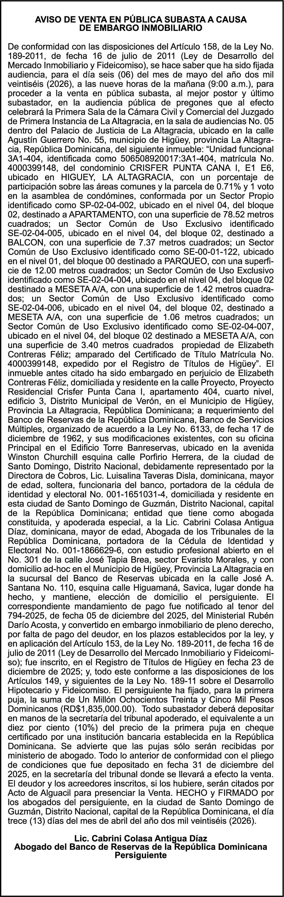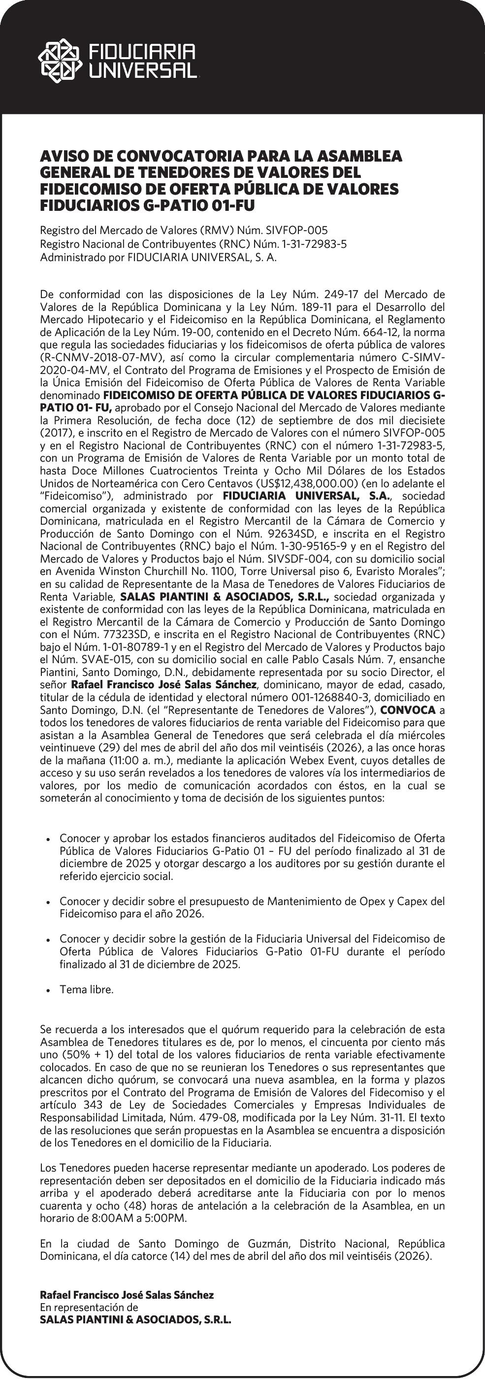 SE HACE de público conocimiento la pérdida del Certificado Financiero número 850227810 emitido por Banco Popular Dominicano, S. A. Banco Múltiple, a nombre de ALBIERIS MIGUEL GRULLON VALERIO, portador de la Cédula de Identidad y Electoral número 402-3855170-5, certificado número 850227810 expedido el 1 de julio de 2025 por el monto de (RD$52,157.22) más intereses generados a la fecha.