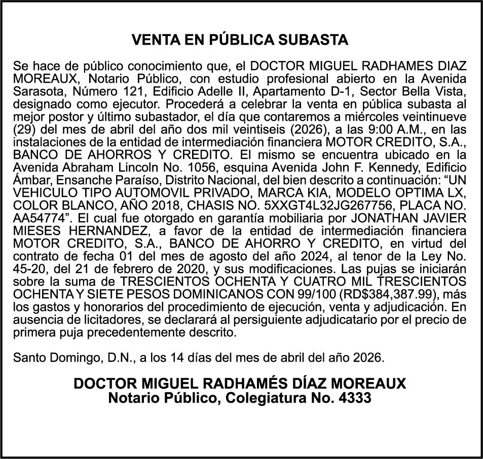 PERDIDA DE PLACA MOTOCICLETA PRIVADA YAMAHA,MODELO DT125,AÑO 1996,COLOR BLANCO,PLACA K0574983,CHASIS 3TT-054838 A NOMBRE DE MANUEL ANTONIO ESPINAL SE HACE de público conocimiento la pérdida del Certificado Financiero número 843424342 emitido por Banco Popular Dominicano, S. A. Banco Múltiple, a nombre de ELIZABETH DIOMERIS DE AZA SANTOS DE DE LA CRUZ, portadora de la Cédula de Identidad y Electoral número 026-0135000-8, certificado número 843424342 expedido en fecha 13 de agosto de 2024 por el monto de (RD$100,000.00) más intereses generados a la fecha.