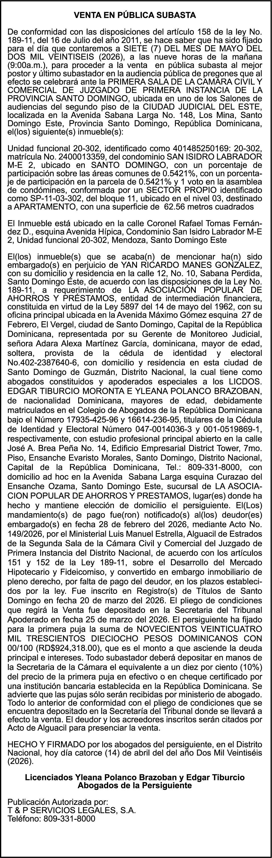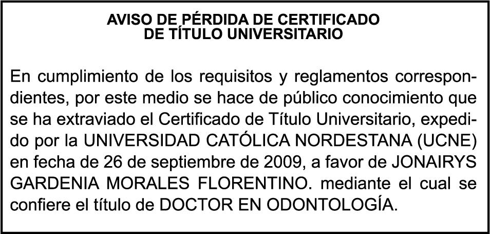 SE hace de público conocimiento la pérdida del Certificado Financiero número 722153038 emitido por Banco Popular Dominicano, S. A. Banco Múltiple, a nombre de SERBULO PATERIO NATERA CANDELARIA, portador de la Cédula de Identidad y Electoral número 001-0722705-0, y MAGALYS MONTAS DE NATERA, portadora de la Cédula de Identidad y Electoral número 001-0726696-7, certificado número 722153038 expedido en fecha 3 de enero de 2005 por el monto de (RD$403,629.77) más intereses generados a la fecha.