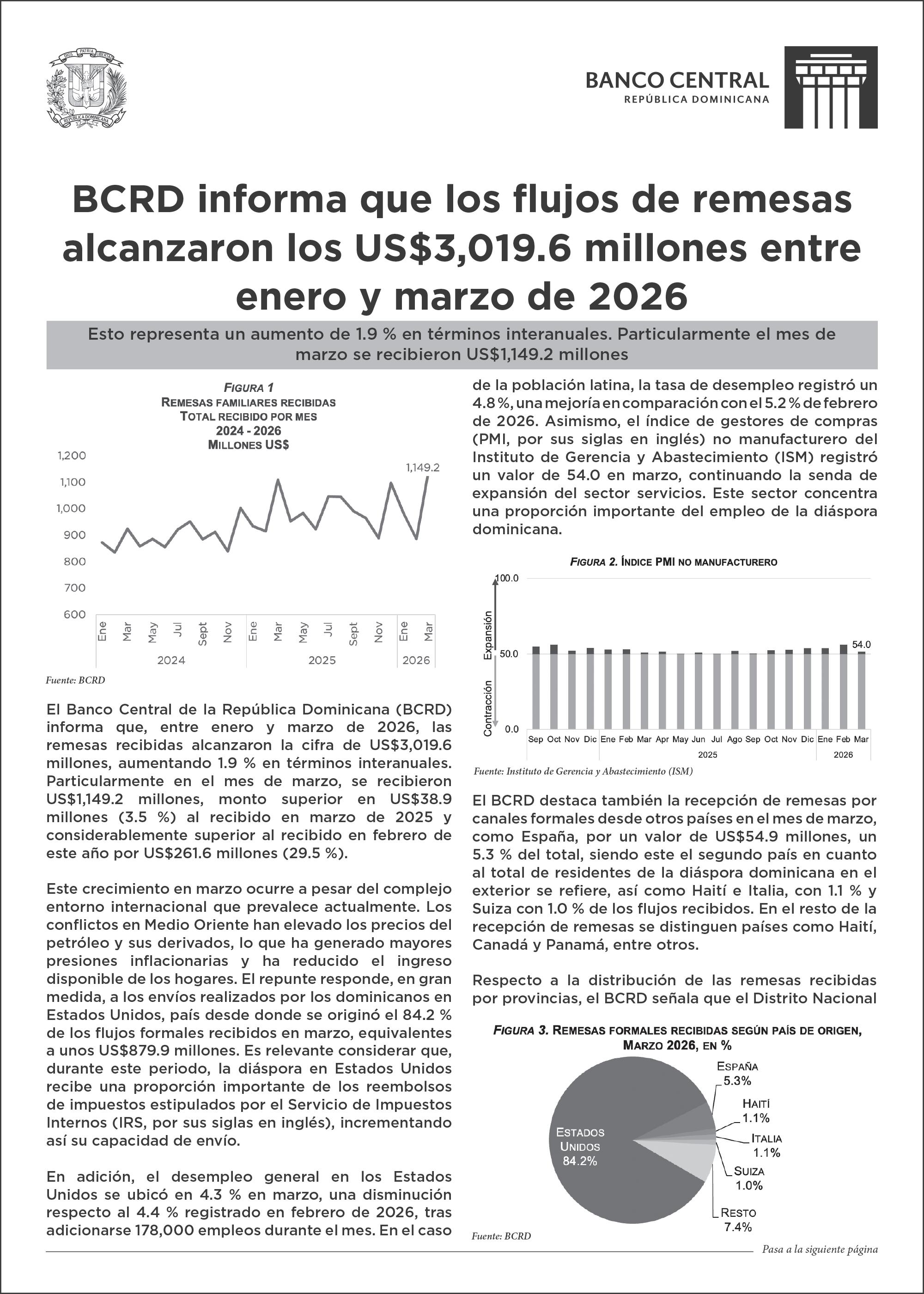 LAS REMESAS ALCANZAN LOS US$3,019.6 MILLONES EN EL PRIMER TRIMESTRE