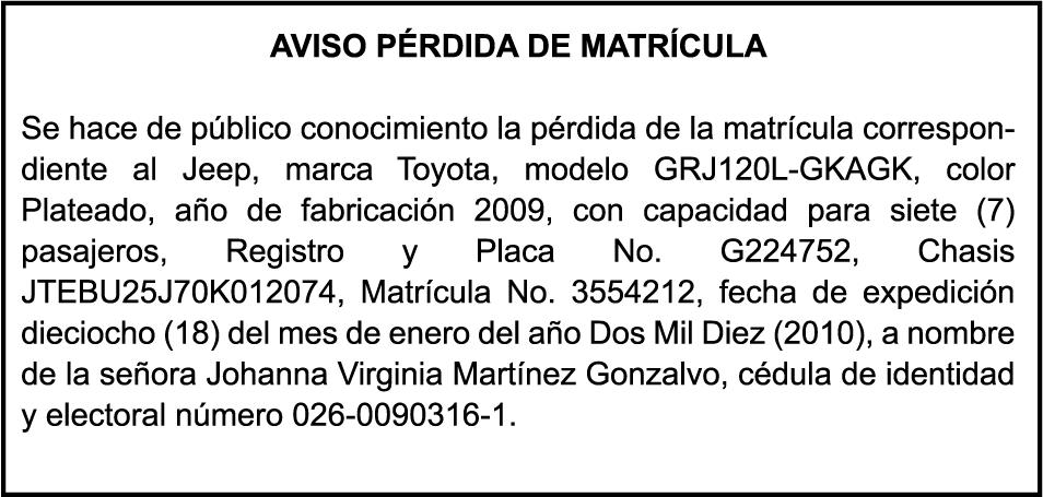 PERDIDA DE MATRICULA Veh. Carga ISUZU, color blanco, año 2010, placa L223799, chasis MPATFS54HAH20725, a nombre de VICTOR ANTONIO LOPEZ ROQUE.