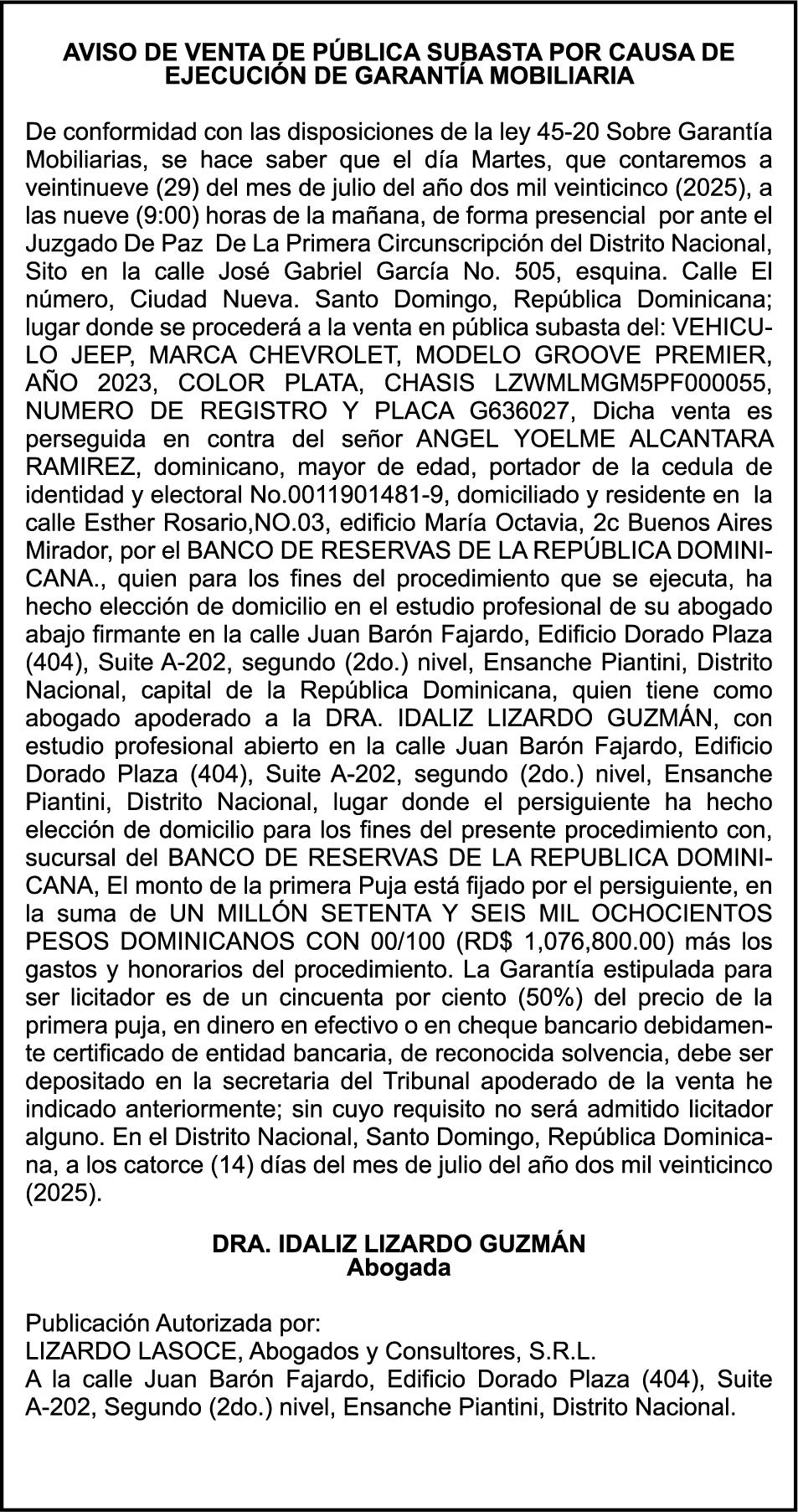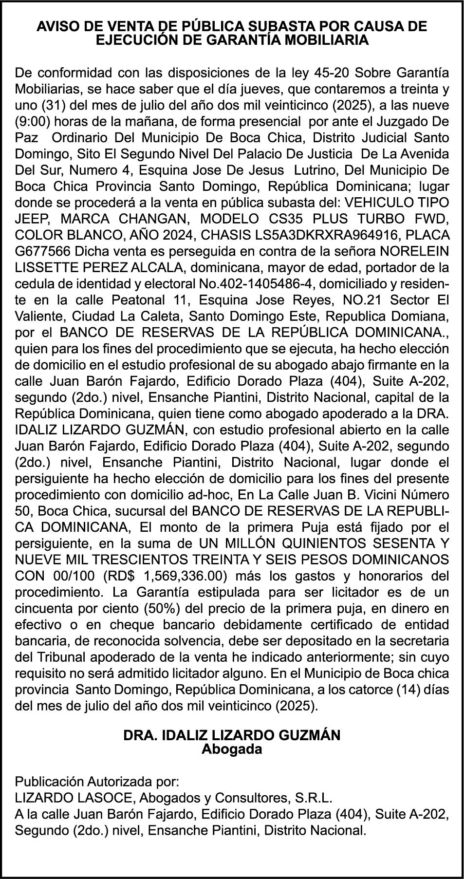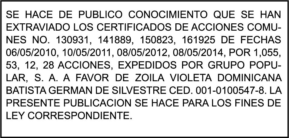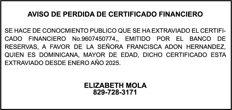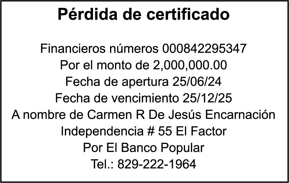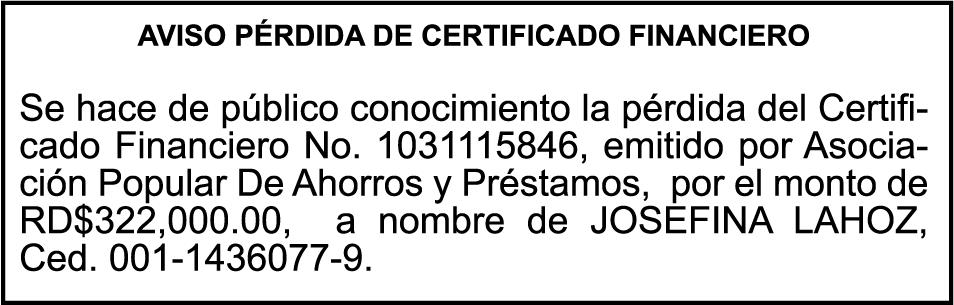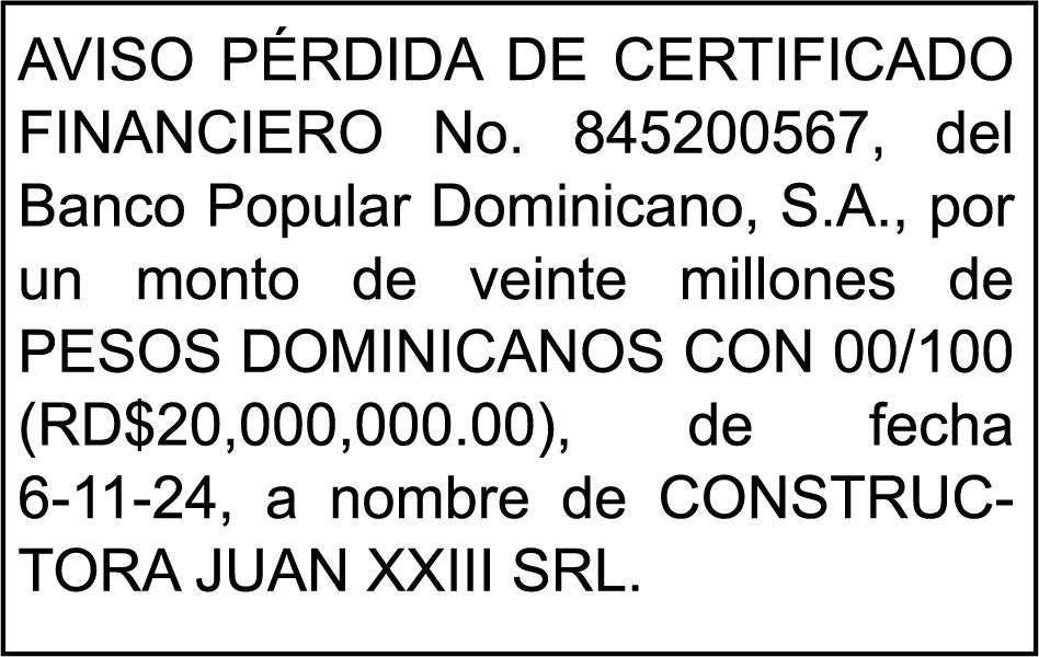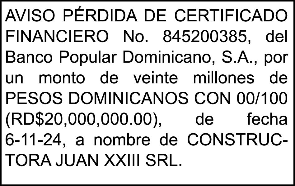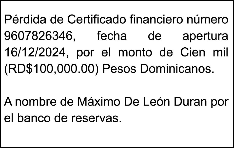 SE hace de público conocimiento la pérdida del Certificado Financiero número 846169670 emitido por Banco Popular Dominicano, S. A. Banco Múltiple, a nombre de LIA ALEXANDRA VILLAR HERNANDEZ, portadora de la Cédula de Identidad y Electoral número 402-1242480-4, certificado número 846169670 expedido en fecha 23 de diciembre de 2024 por el monto de (RD$294,630.45) más intereses generados a la fecha.