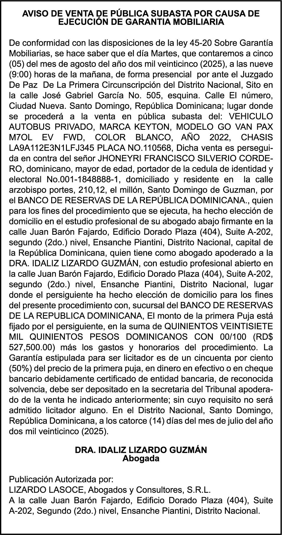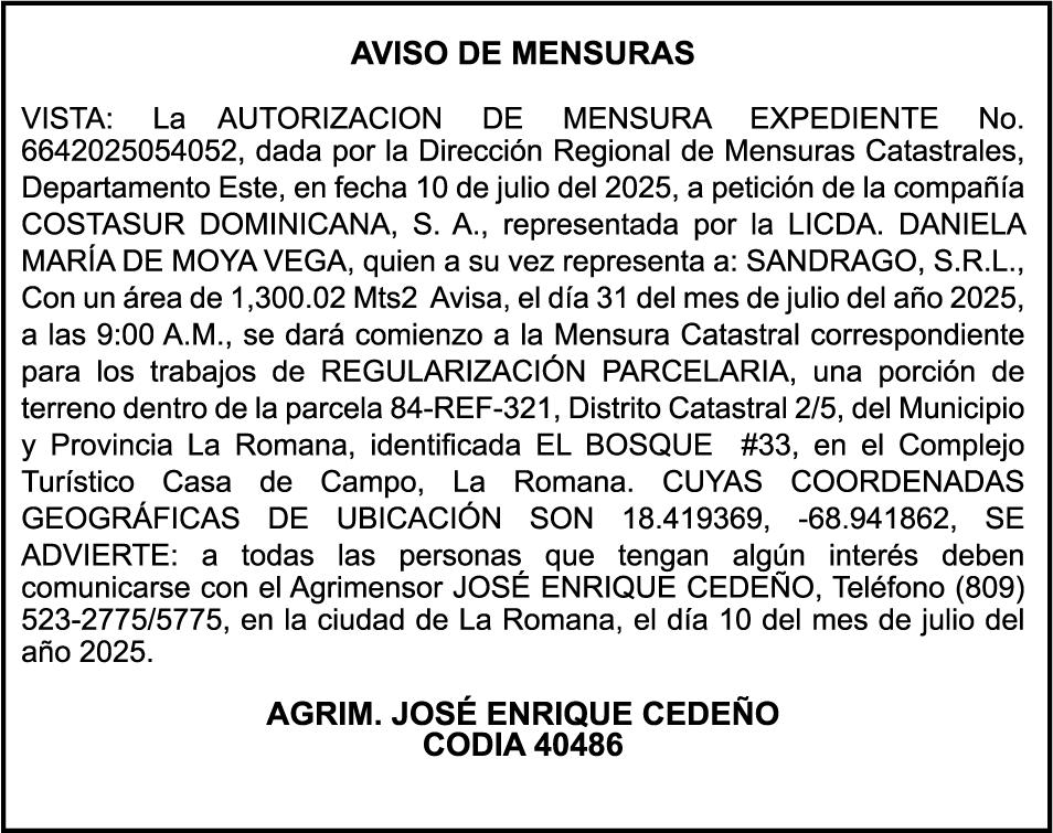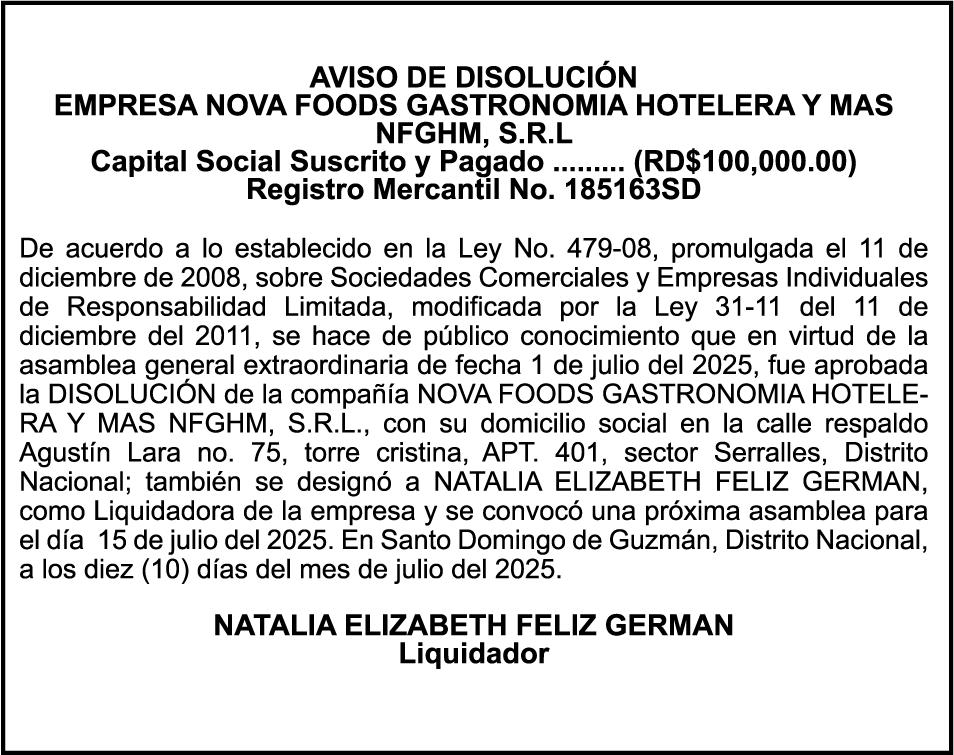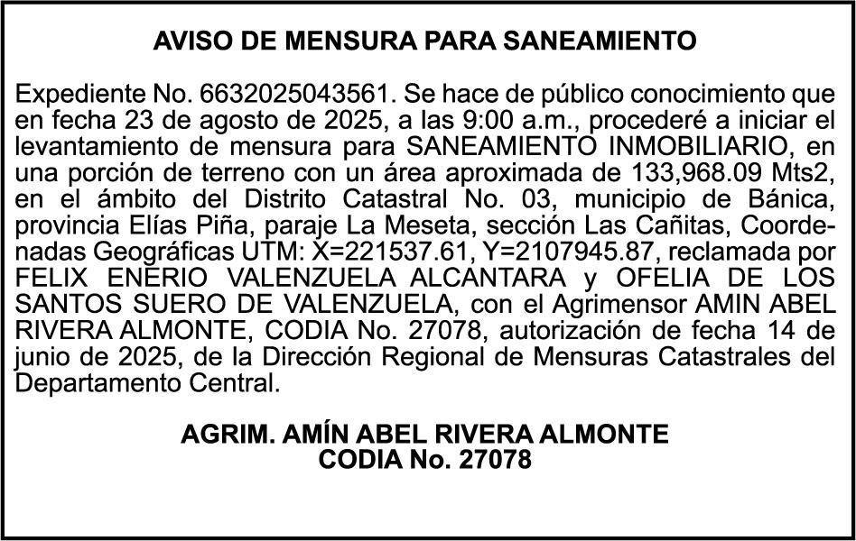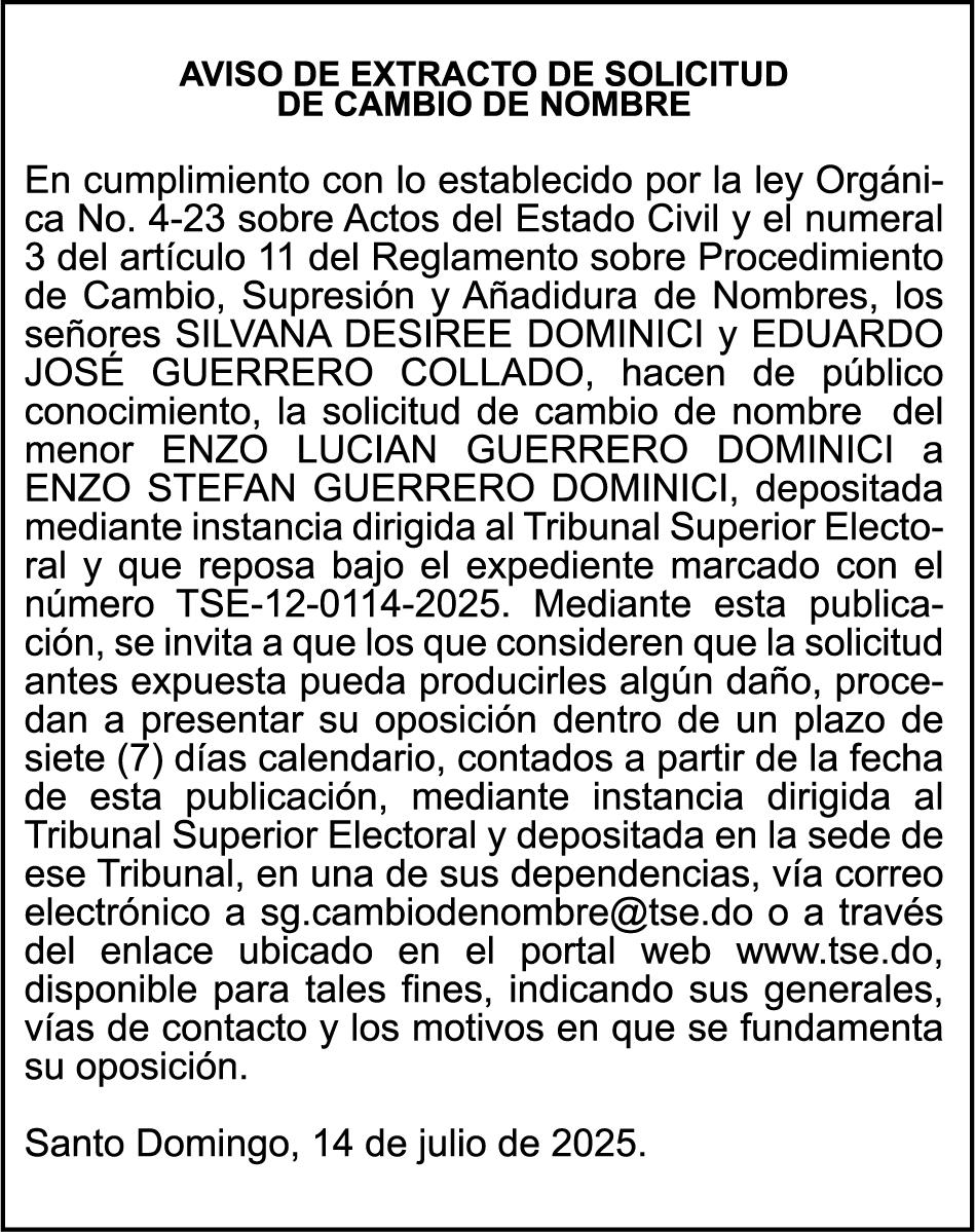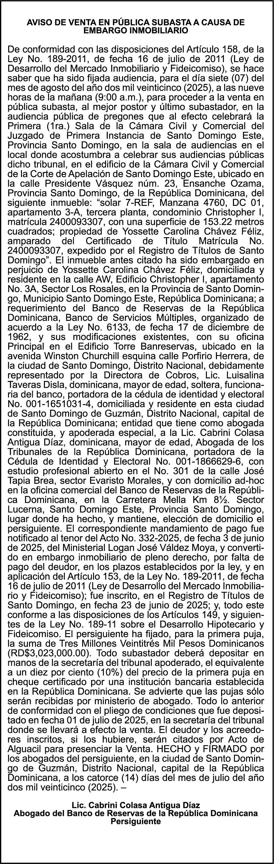 SE hace de público conocimiento la pérdida del Certificado Financiero número 846169670 emitido por Banco Popular Dominicano, S. A. Banco Múltiple, a nombre de LIA ALEXANDRA VILLAR HERNANDEZ, portadora de la Cédula de Identidad y Electoral número 402-1242480-4, certificado número 846169670 expedido en fecha 23 de diciembre de 2024 por el monto de (RD$294,630.45) más intereses generados a la fecha.