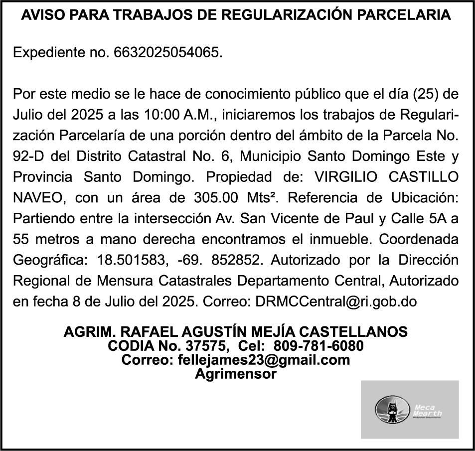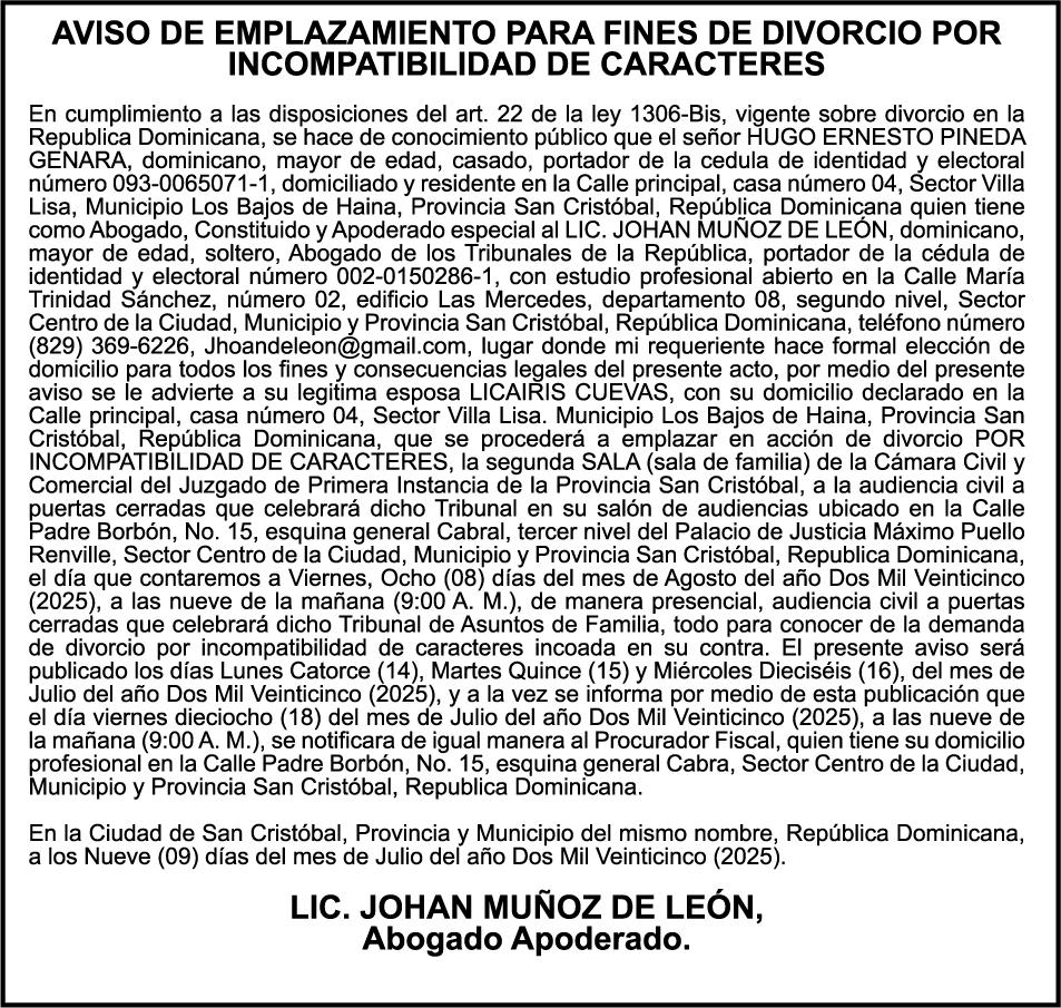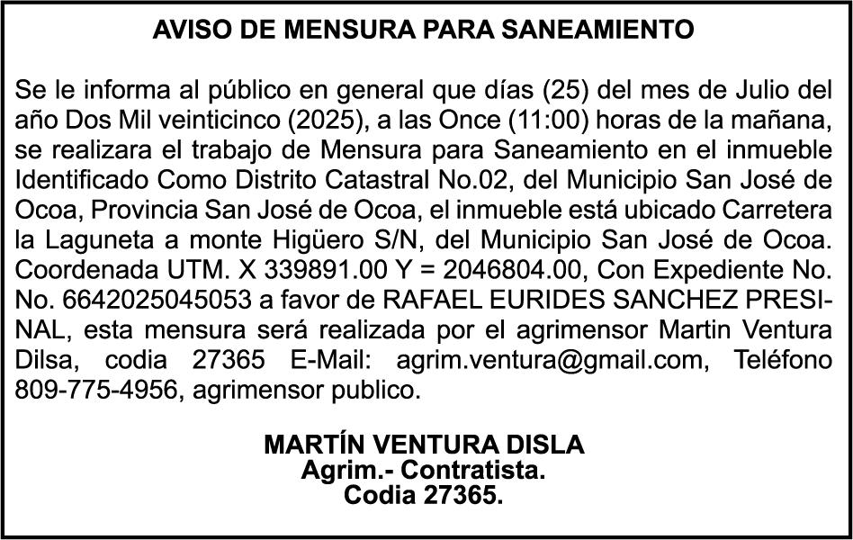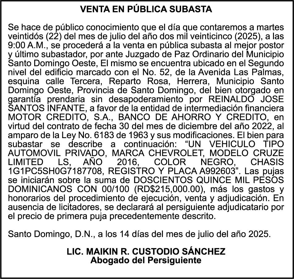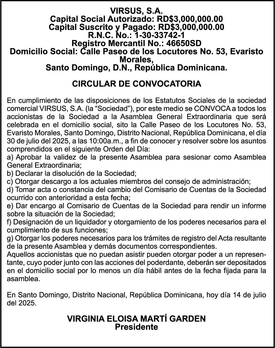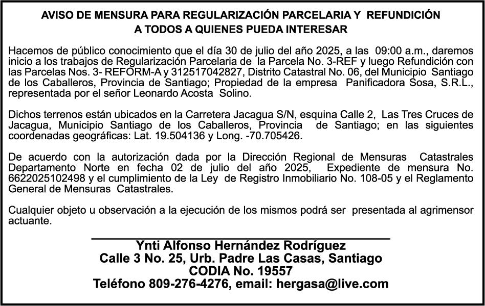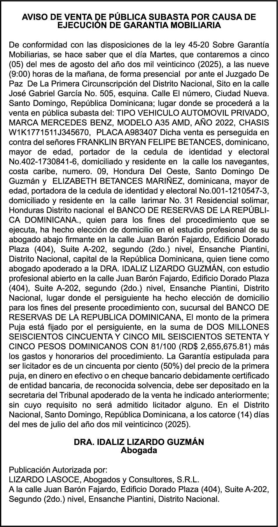 SE hace de público conocimiento la pérdida del Certificado Financiero número 846169670 emitido por Banco Popular Dominicano, S. A. Banco Múltiple, a nombre de LIA ALEXANDRA VILLAR HERNANDEZ, portadora de la Cédula de Identidad y Electoral número 402-1242480-4, certificado número 846169670 expedido en fecha 23 de diciembre de 2024 por el monto de (RD$294,630.45) más intereses generados a la fecha.