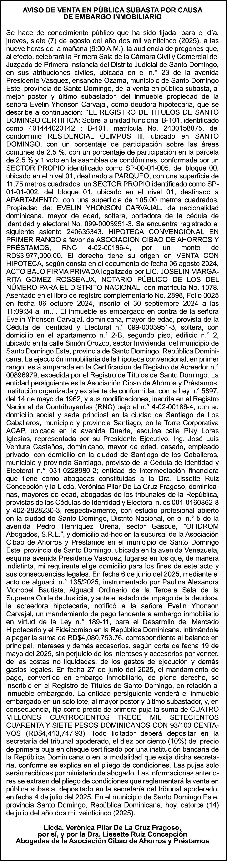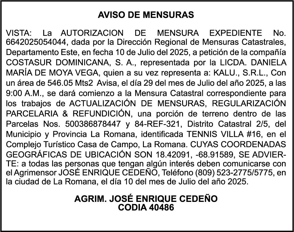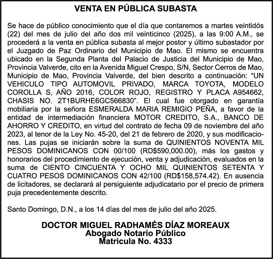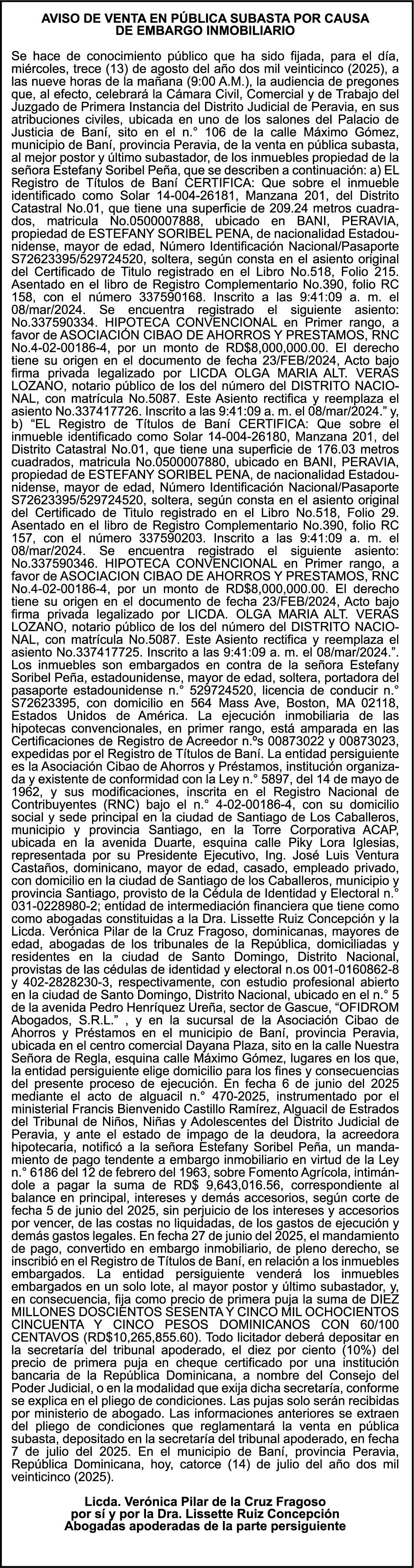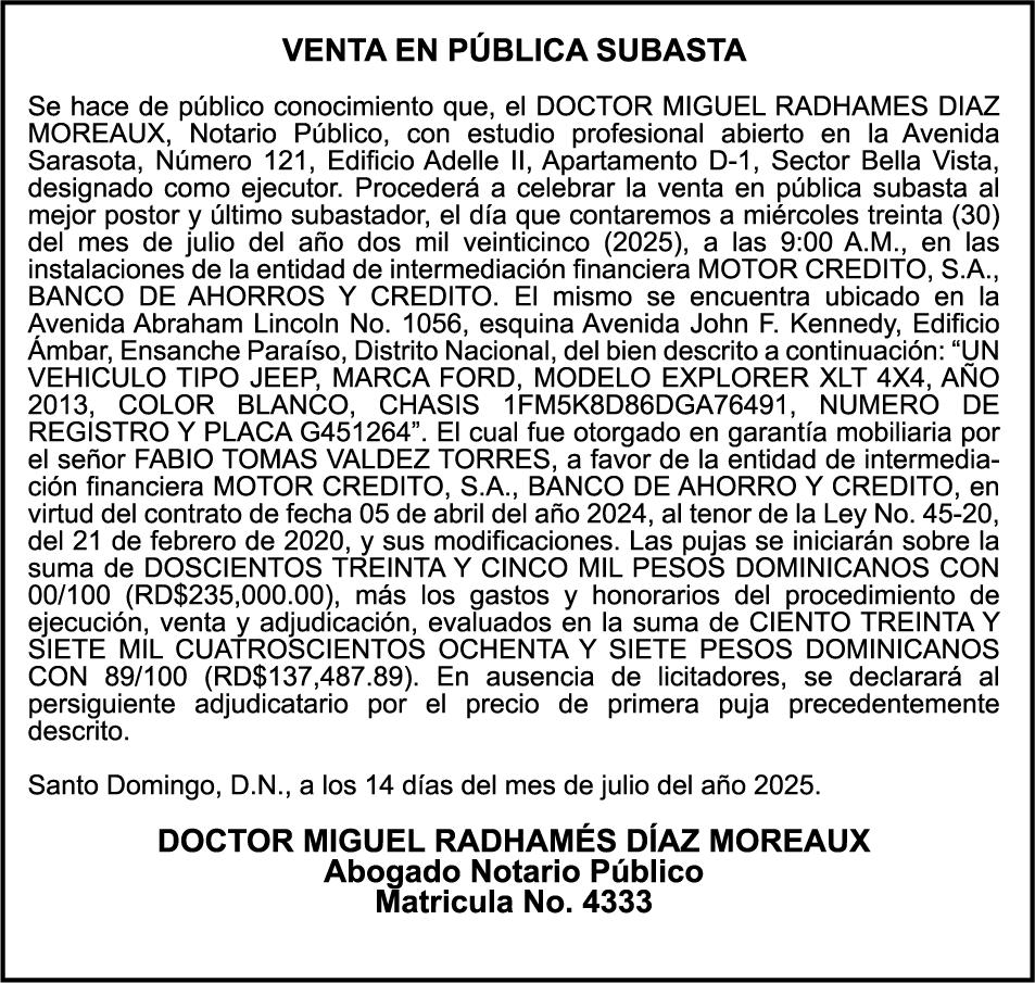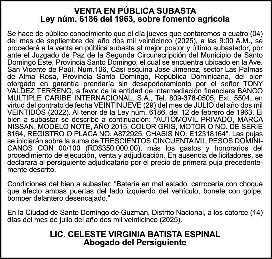 SE hace de público conocimiento la pérdida del Certificado Financiero número 846169670 emitido por Banco Popular Dominicano, S. A. Banco Múltiple, a nombre de LIA ALEXANDRA VILLAR HERNANDEZ, portadora de la Cédula de Identidad y Electoral número 402-1242480-4, certificado número 846169670 expedido en fecha 23 de diciembre de 2024 por el monto de (RD$294,630.45) más intereses generados a la fecha.