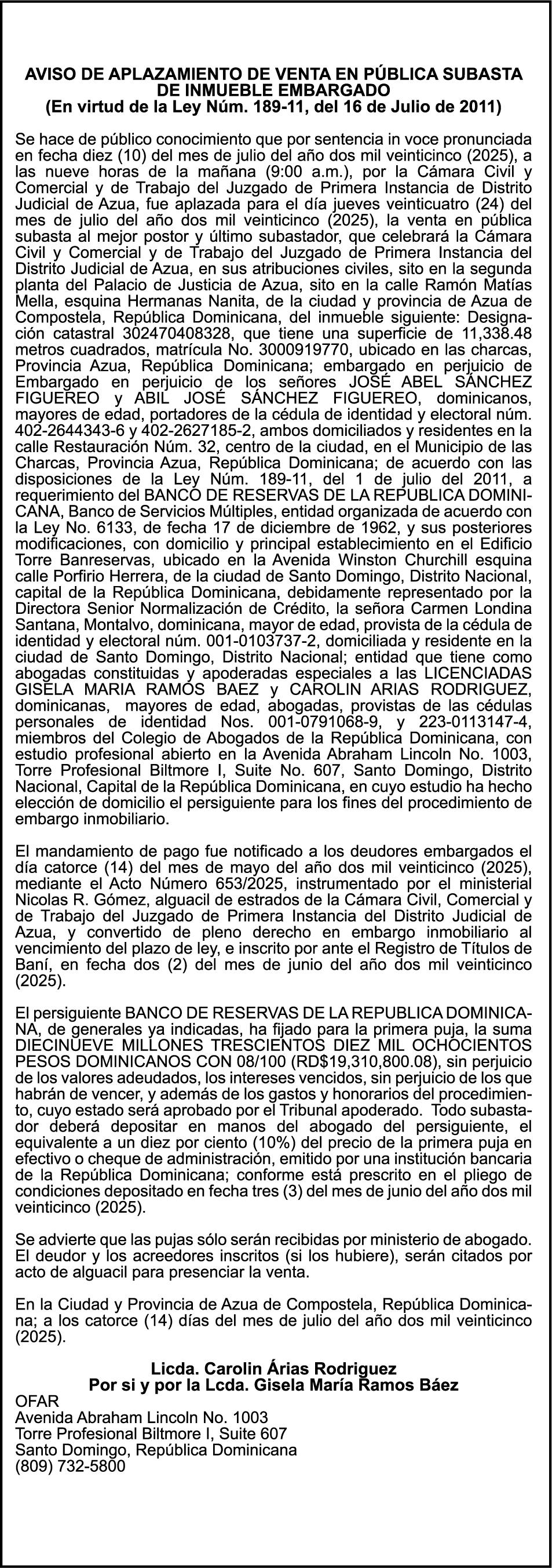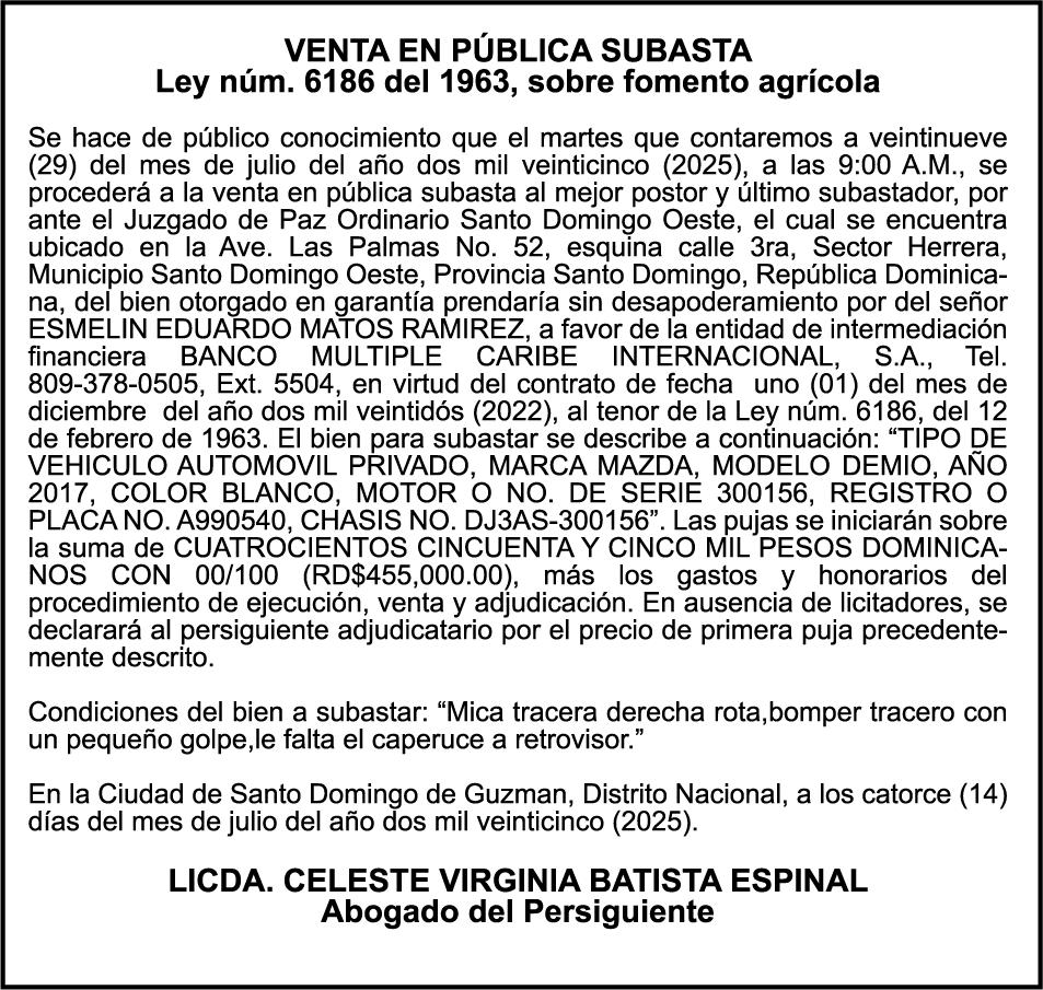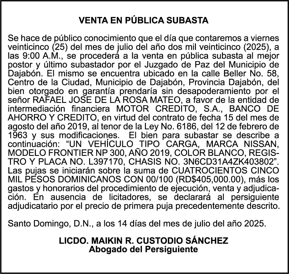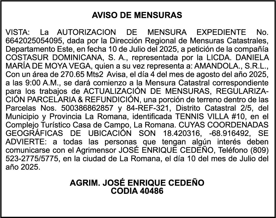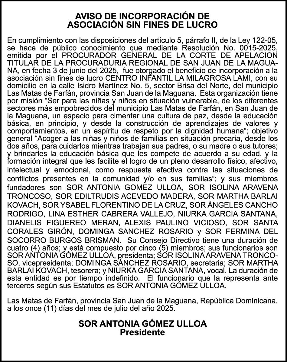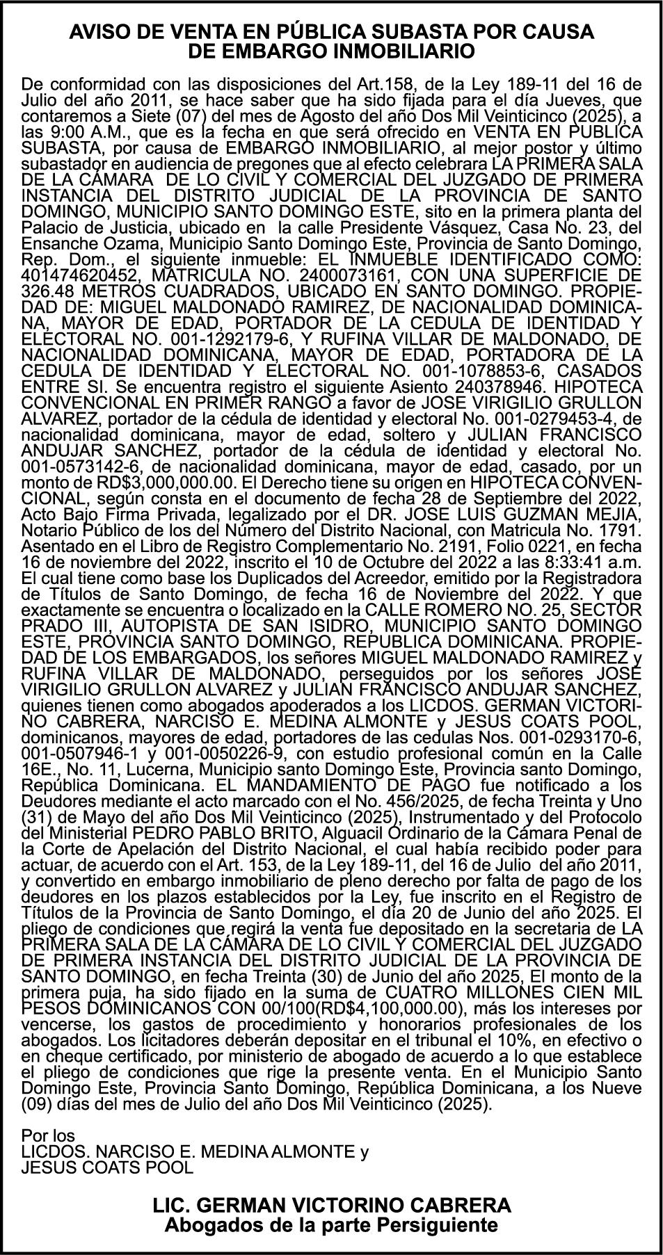 SE hace de público conocimiento la pérdida del Certificado Financiero número 846169670 emitido por Banco Popular Dominicano, S. A. Banco Múltiple, a nombre de LIA ALEXANDRA VILLAR HERNANDEZ, portadora de la Cédula de Identidad y Electoral número 402-1242480-4, certificado número 846169670 expedido en fecha 23 de diciembre de 2024 por el monto de (RD$294,630.45) más intereses generados a la fecha.