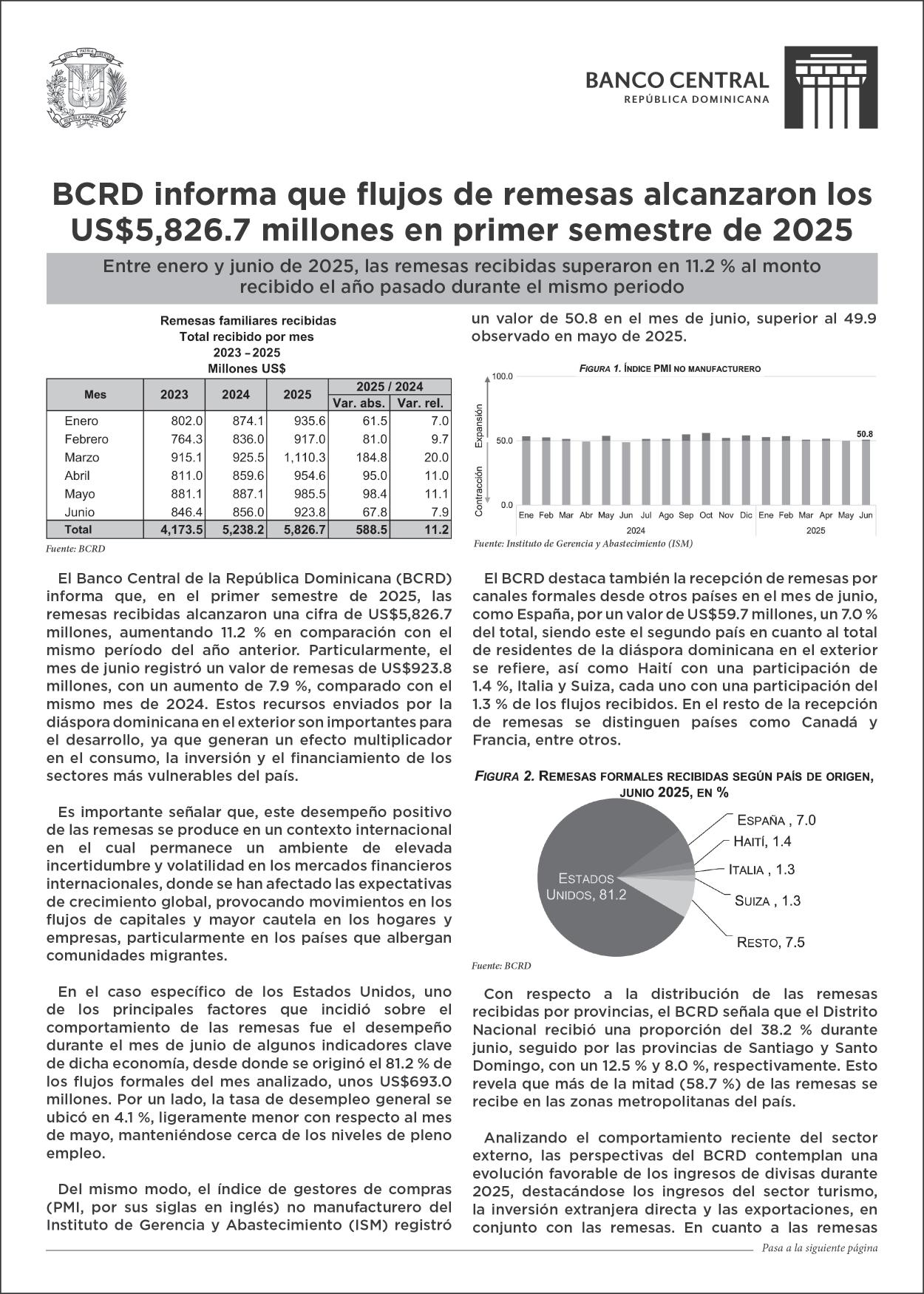 DIÁSPORA. Alcanzan una cifra de US$5,826.7 millones. En el mes de junio registraron un valor de US$923.8 millones, 7.9% más que 2024. P.22