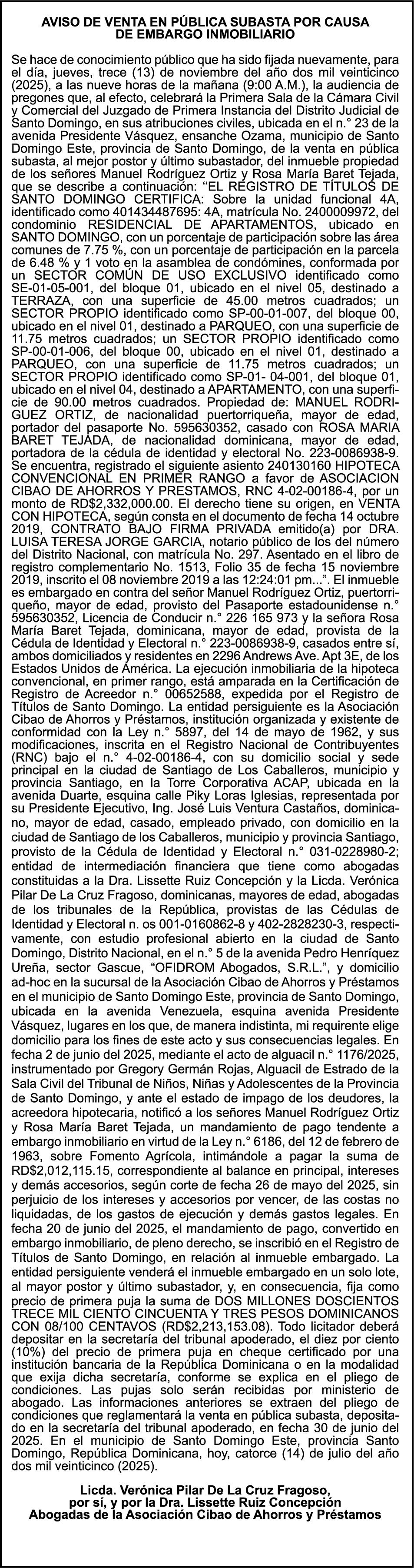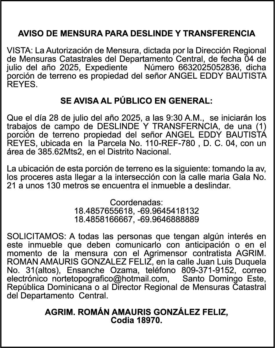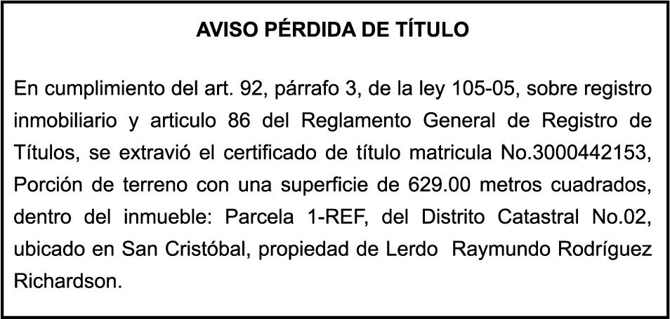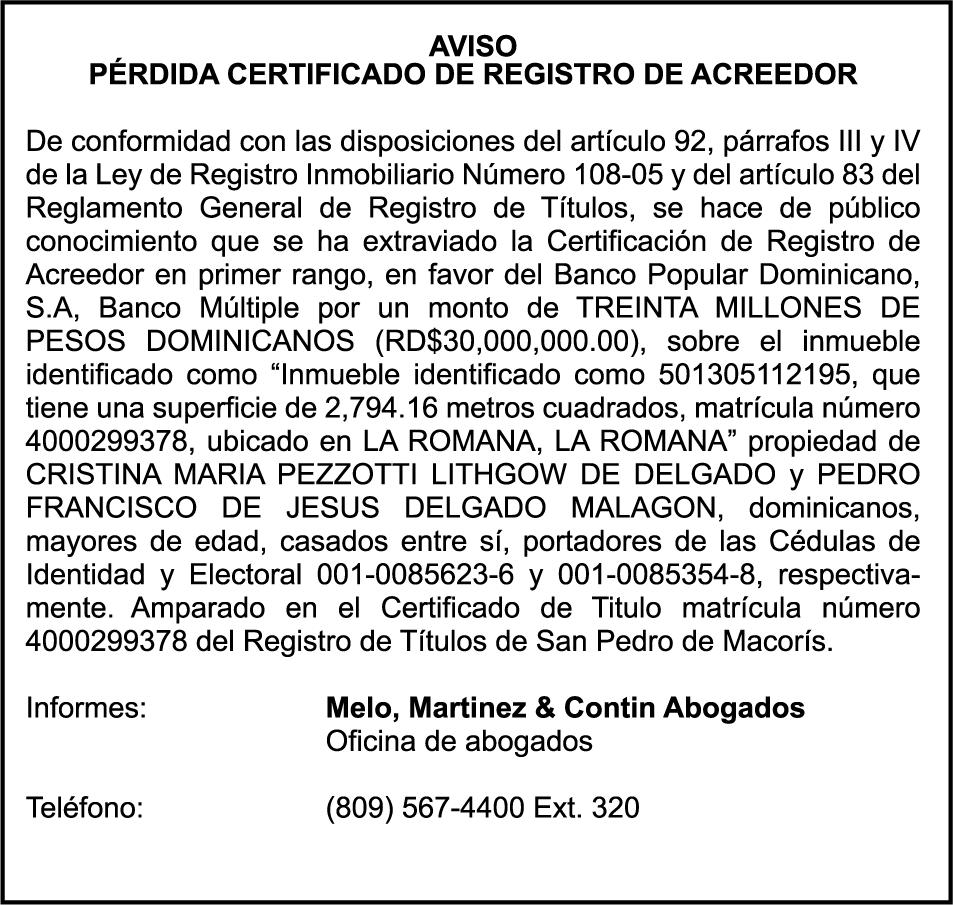 SE hace de público conocimiento la pérdida del Certificado Financiero número 844975607 emitido por Banco Popular Dominicano, S. A. Banco Múltiple, a nombre de OSCAR MANAURY RODRIGUEZ GOMEZ, portador de la Cédula de Identidad y Electoral número 001-1745397-7, certificado número 844975607 expedido en fecha 5 de octubre de 2024 por el monto de (RD$311,408.11) más intereses generados a la fecha.