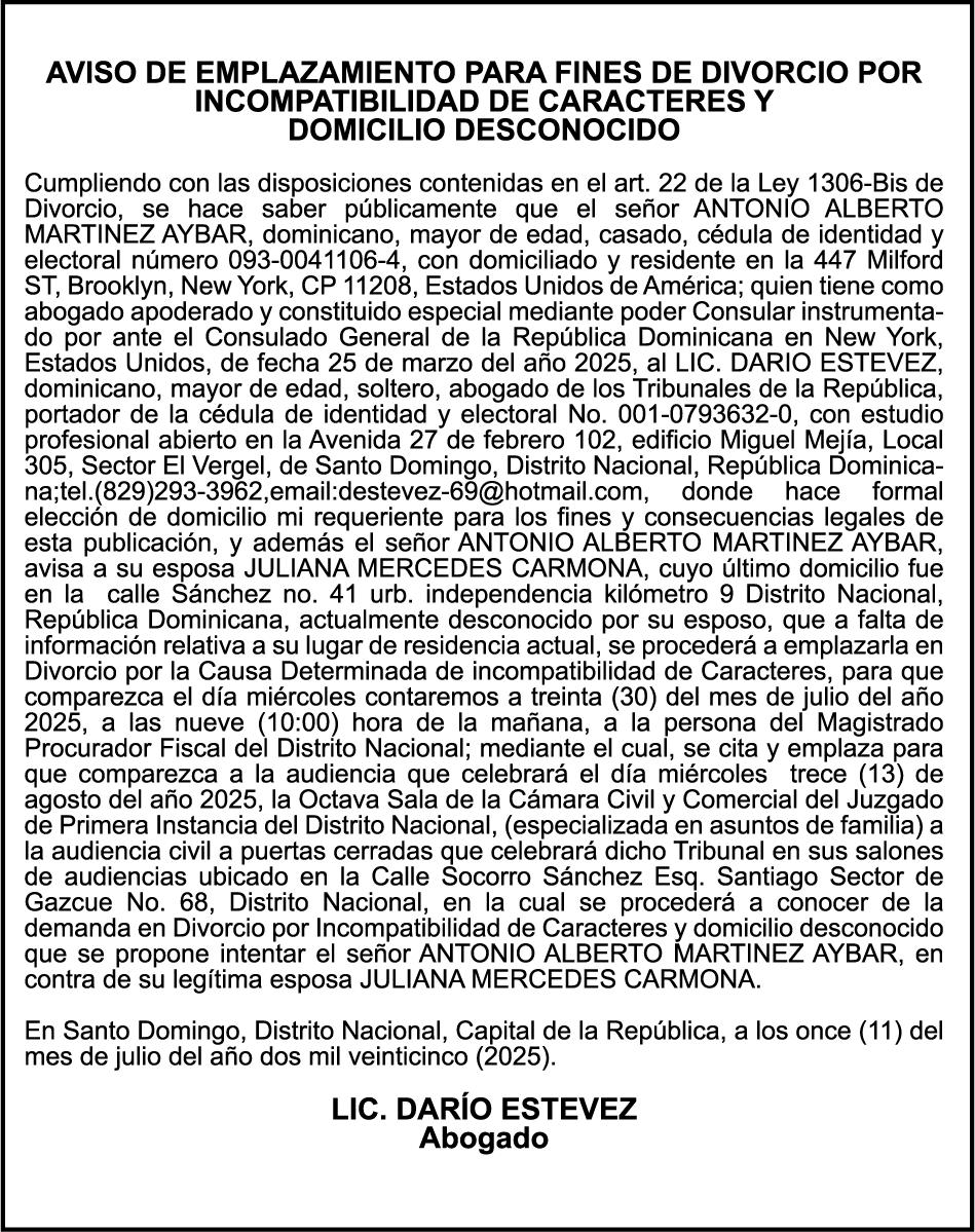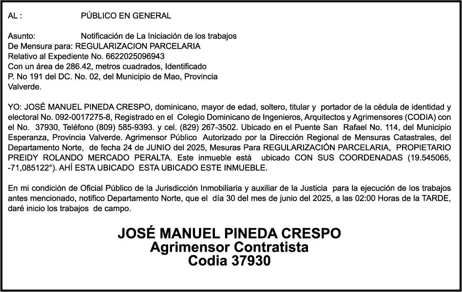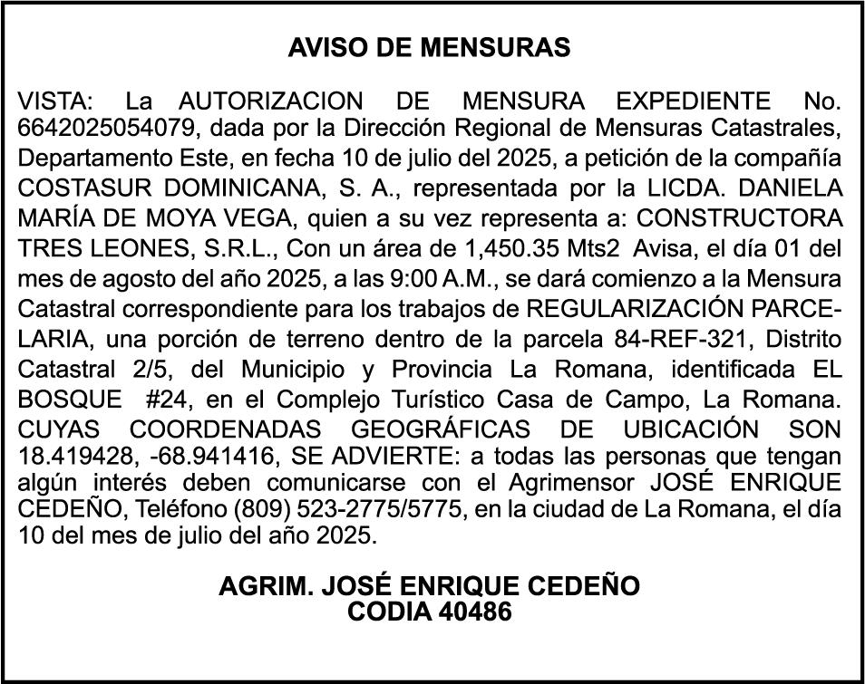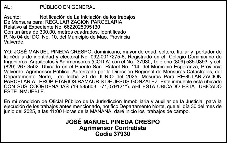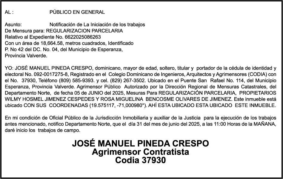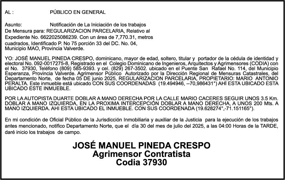 SE hace de público conocimiento la pérdida del Certificado Financiero número 841724966 emitido por Banco Popular Dominicano, S. A. Banco Múltiple, a nombre de BERTO ENRIQUE GUILLEN AZCONA, portador de la Cédula de Identidad y Electoral número 023-0085748-5, certificado número 841724966 expedido en fecha en fecha 29 de mayo de 2024 por el monto de (RD$1,000,000.00) más intereses generados a la fecha