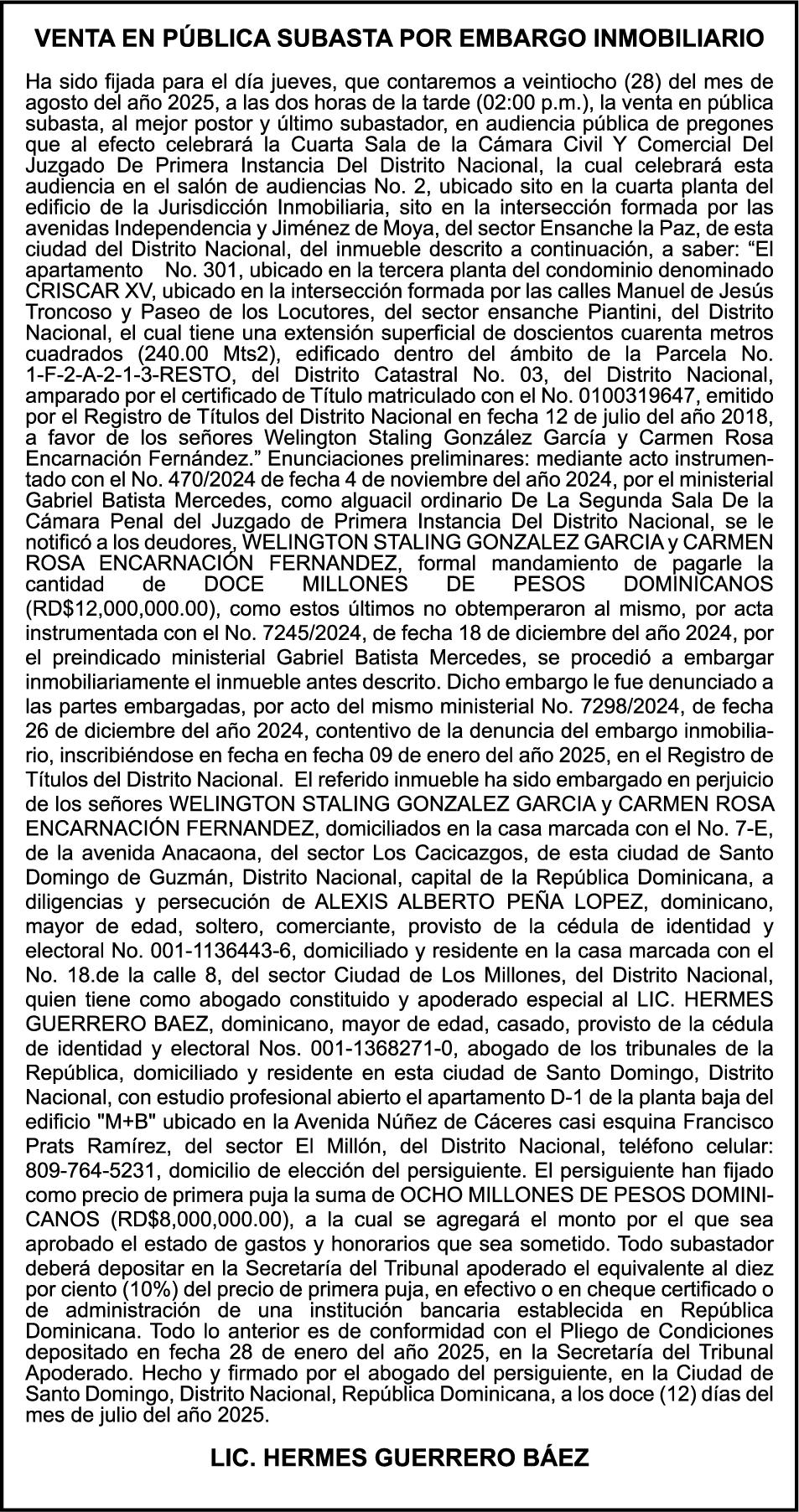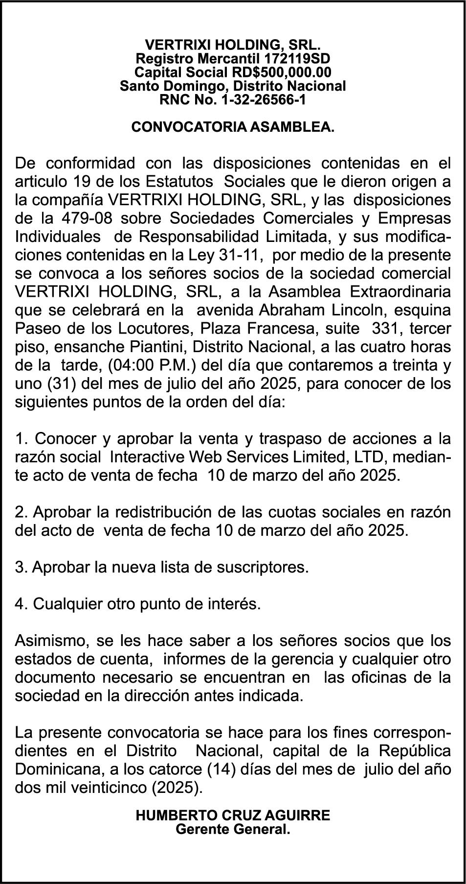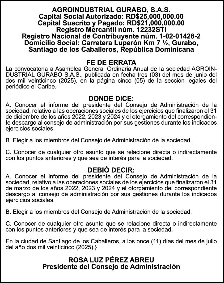SE hace de público conocimiento la pérdida del Certificado Financiero número 841724966 emitido por Banco Popular Dominicano, S. A. Banco Múltiple, a nombre de BERTO ENRIQUE GUILLEN AZCONA, portador de la Cédula de Identidad y Electoral número 023-0085748-5, certificado número 841724966 expedido en fecha en fecha 29 de mayo de 2024 por el monto de (RD$1,000,000.00) más intereses generados a la fecha