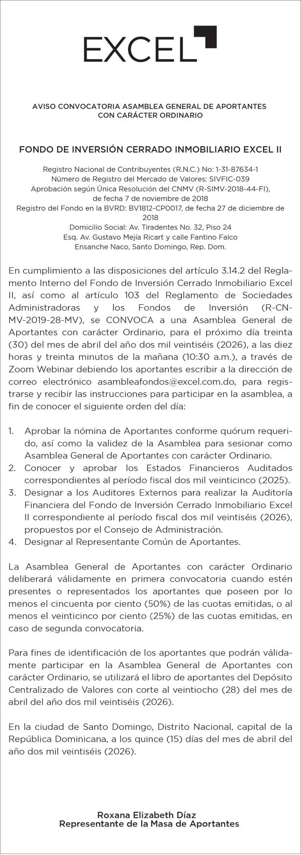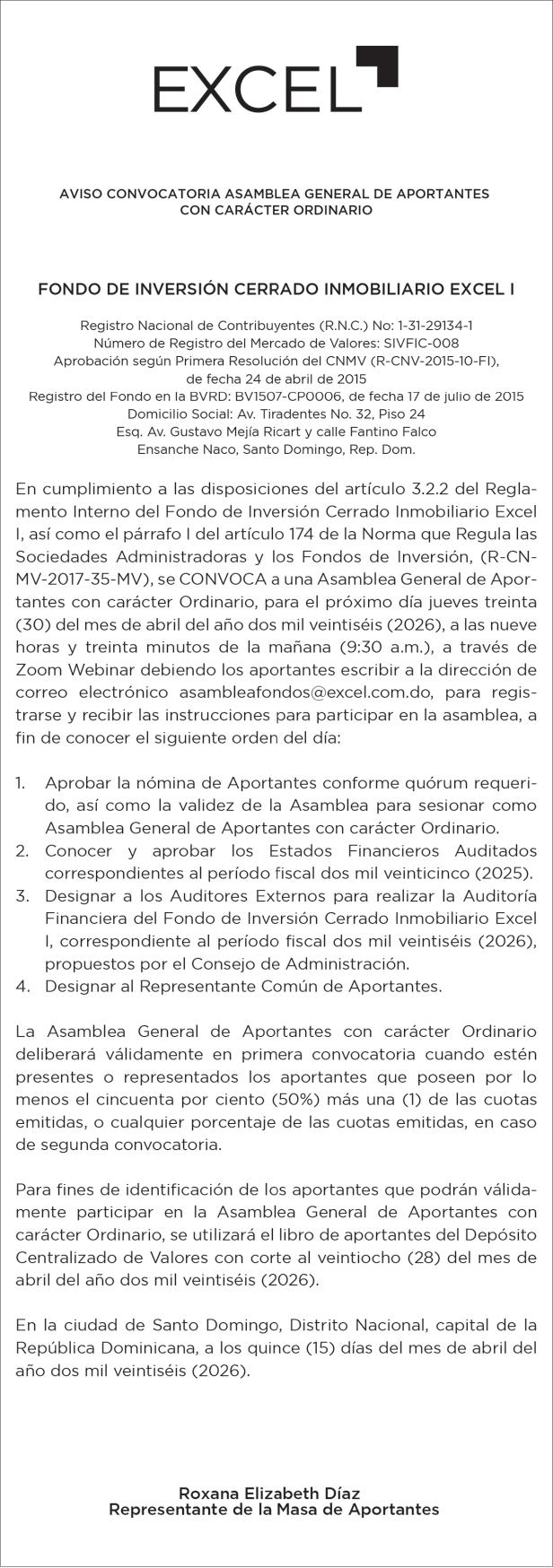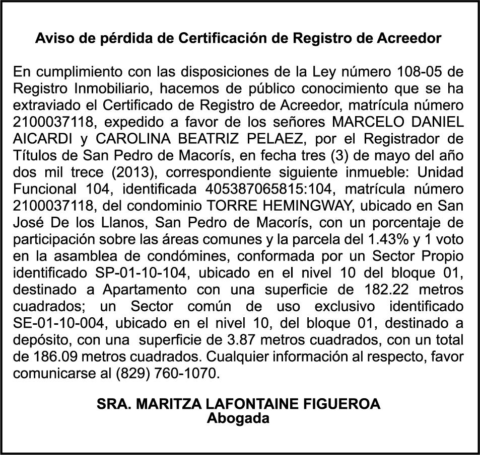 SE HACE de público conocimiento la pérdida del Certificado Financiero número 843424342 emitido por Banco Popular Dominicano, S. A. Banco Múltiple, a nombre de ELIZABETH DIOMERIS DE AZA SANTOS DE DE LA CRUZ, portadora de la Cédula de Identidad y Electoral número 026-0135000-8, certificado número 843424342 expedido en fecha 13 de agosto de 2024 por el monto de (RD$100,000.00) más intereses generados a la fecha.