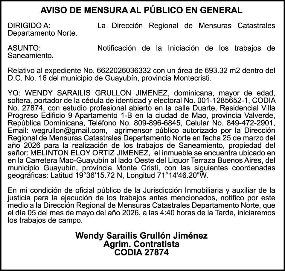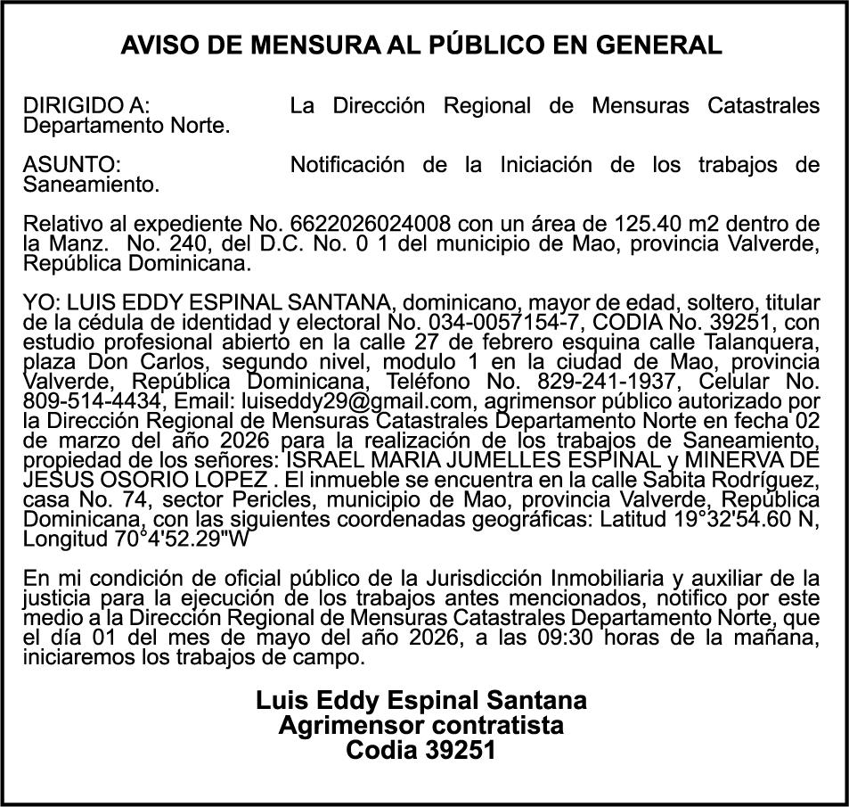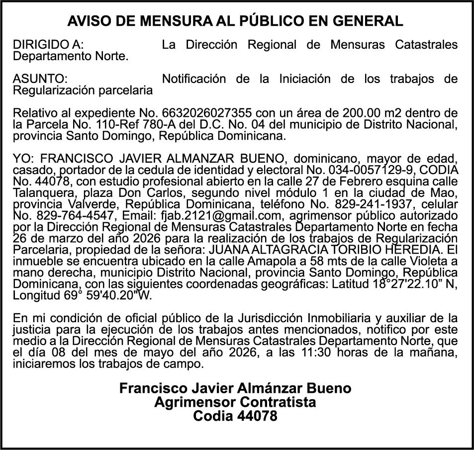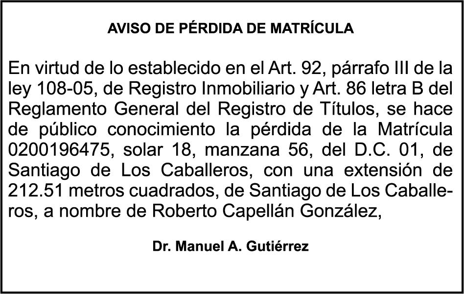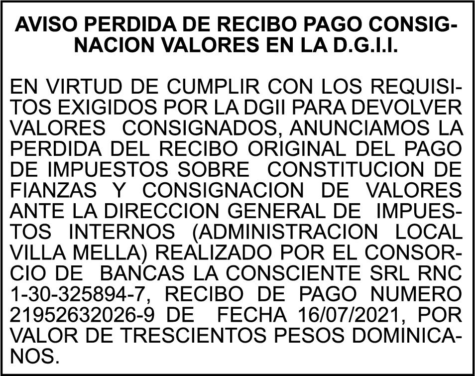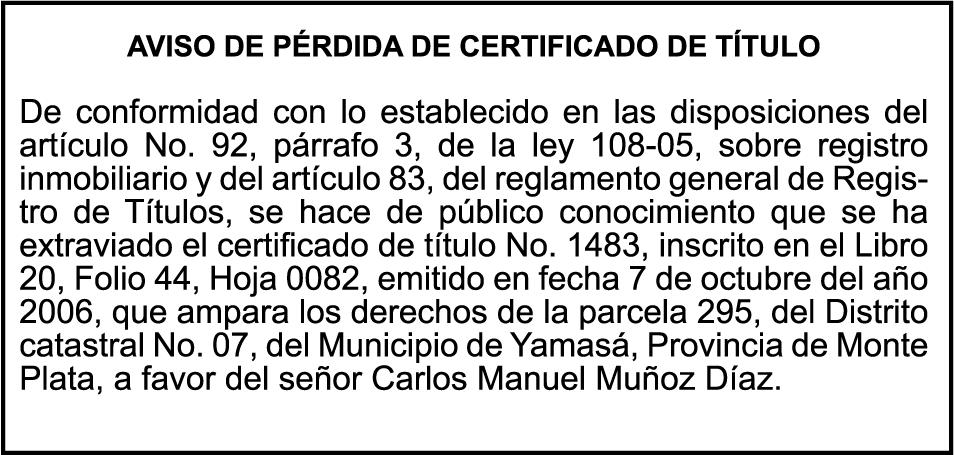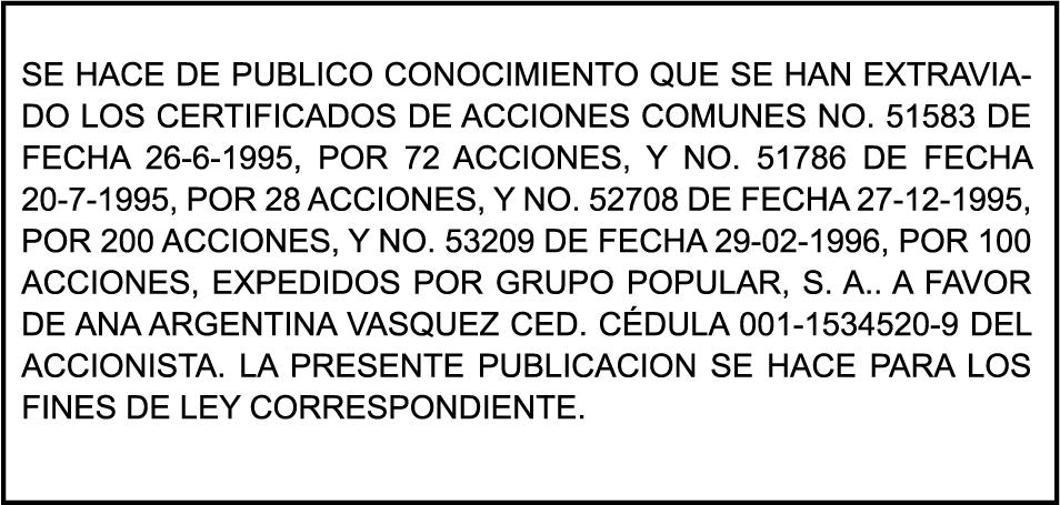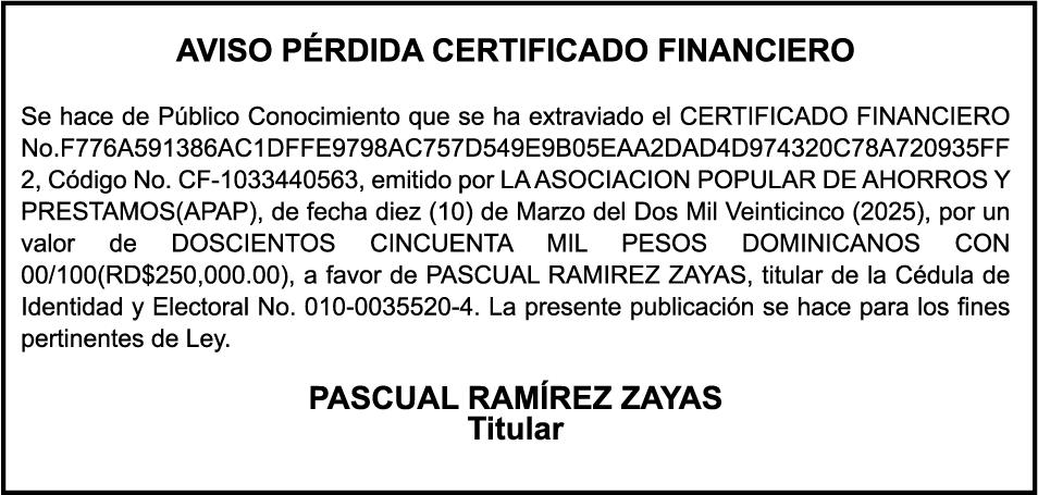 SE HACE de público conocimiento la pérdida del Certificado Financiero número 850227810 emitido por Banco Popular Dominicano, S. A. Banco Múltiple, a nombre de ALBIERIS MIGUEL GRULLON VALERIO, portador de la Cédula de Identidad y Electoral número 402-3855170-5, certificado número 850227810 expedido el 1 de julio de 2025 por el monto de (RD$52,157.22) más intereses generados a la fecha.
