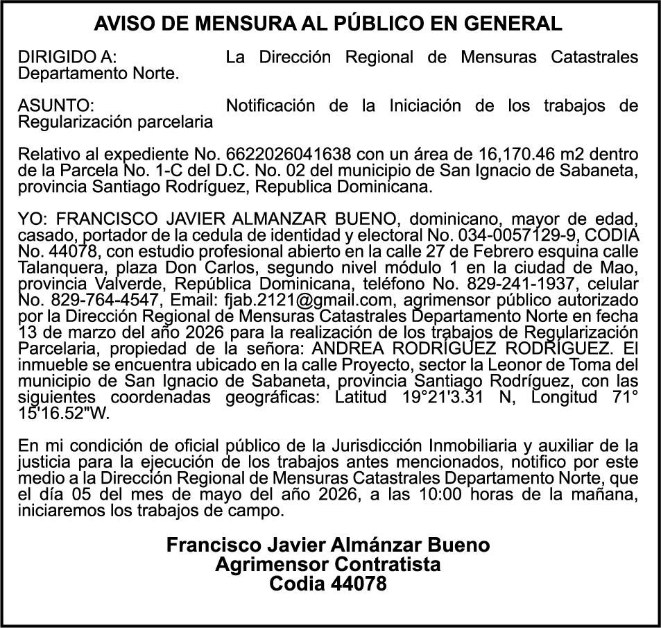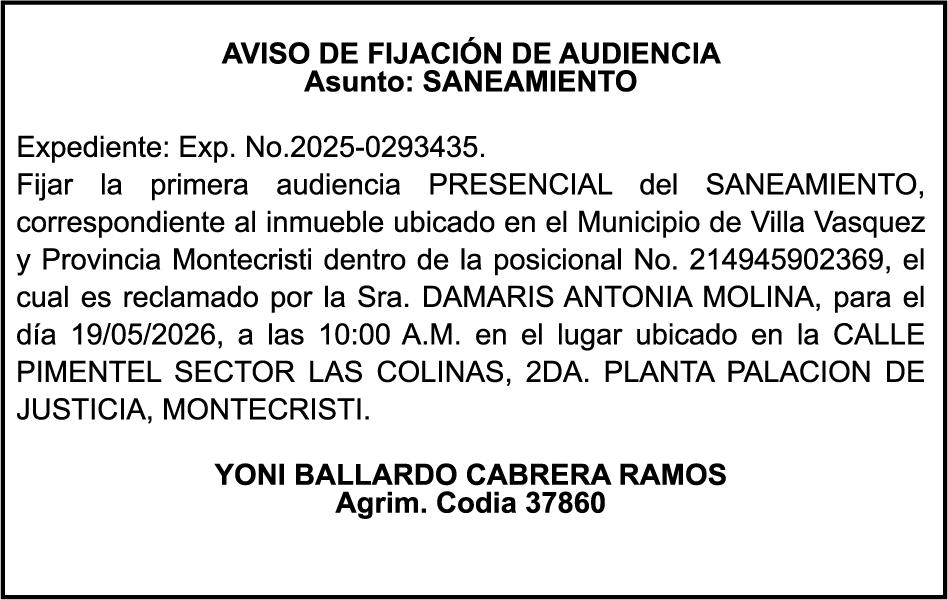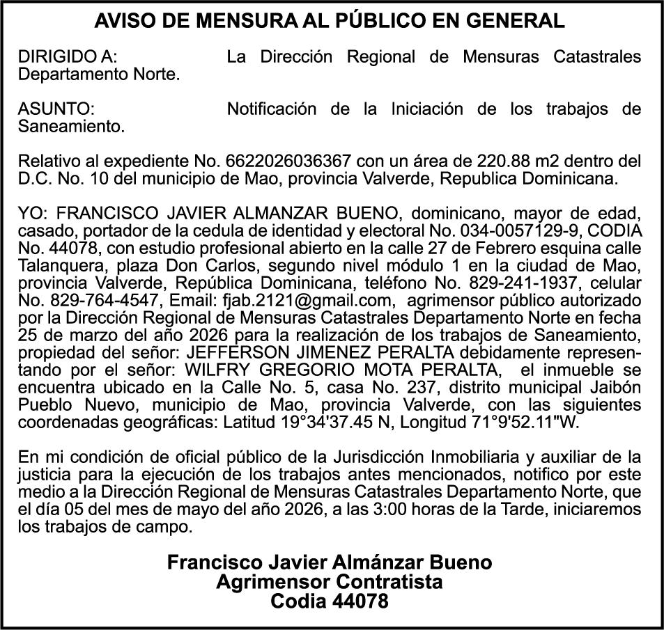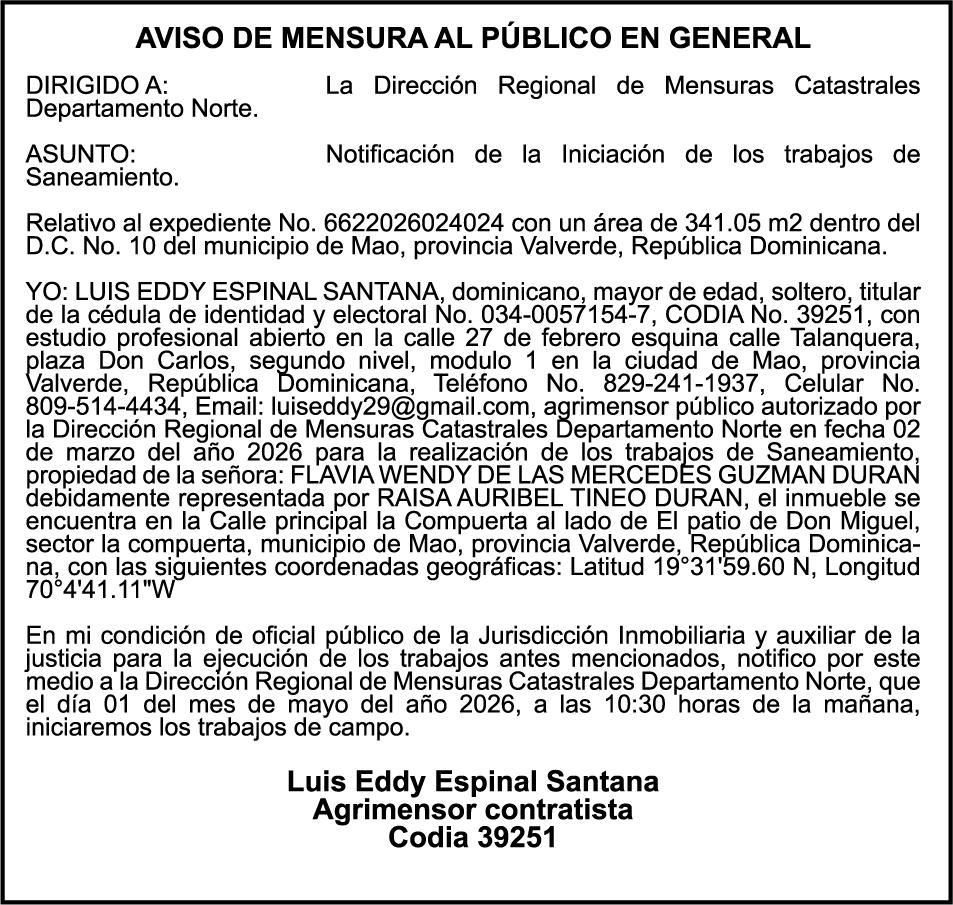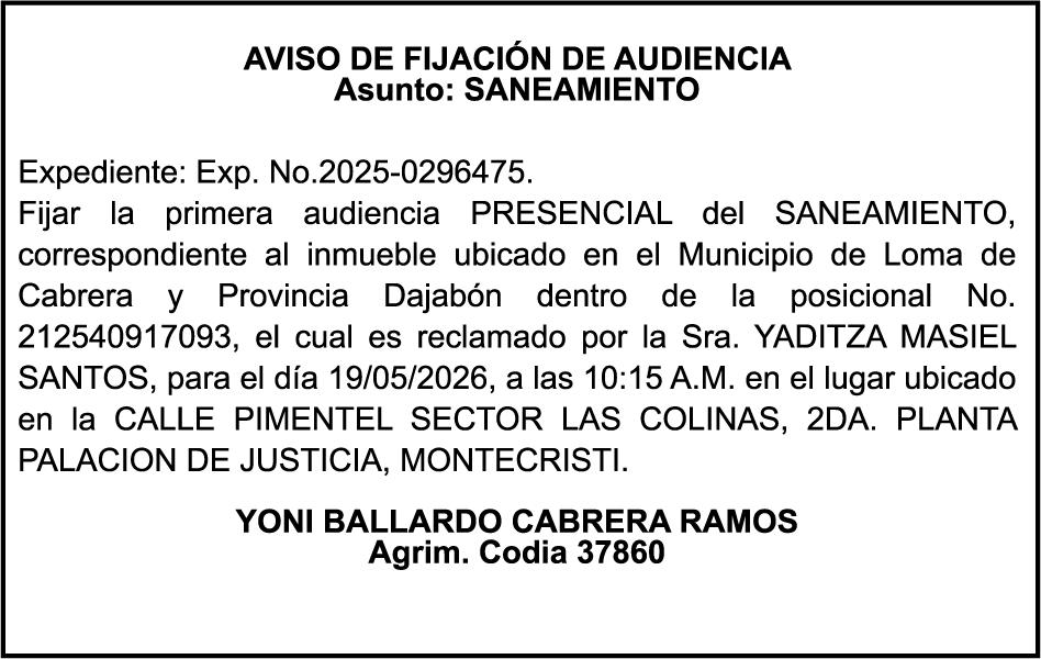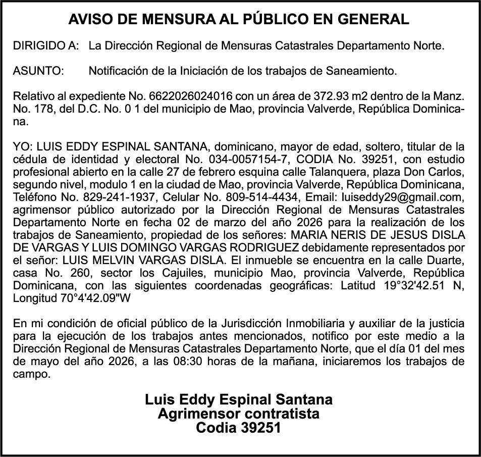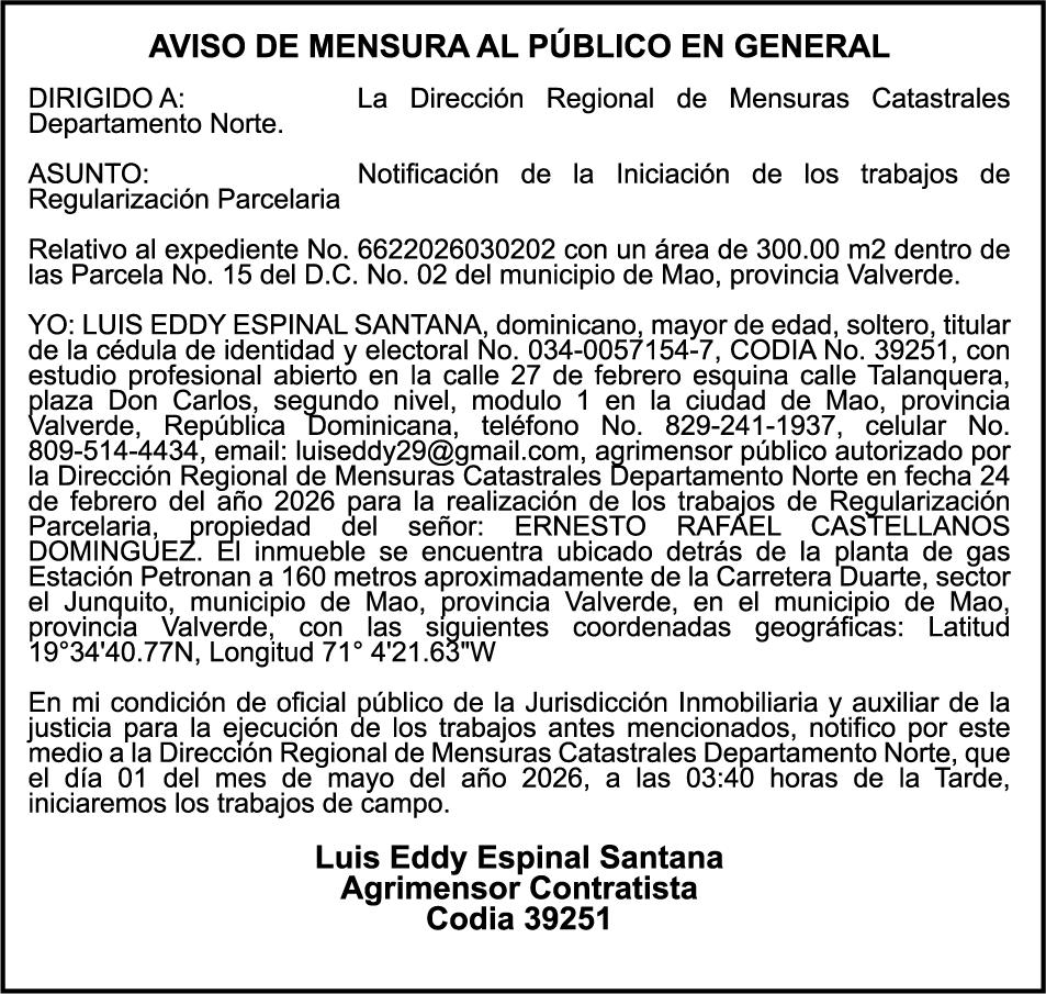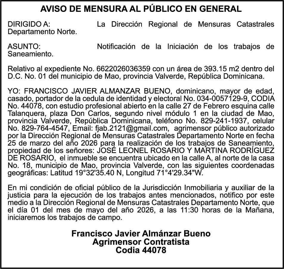 SE HACE de público conocimiento la pérdida del Certificado Financiero número 850227810 emitido por Banco Popular Dominicano, S. A. Banco Múltiple, a nombre de ALBIERIS MIGUEL GRULLON VALERIO, portador de la Cédula de Identidad y Electoral número 402-3855170-5, certificado número 850227810 expedido el 1 de julio de 2025 por el monto de (RD$52,157.22) más intereses generados a la fecha.