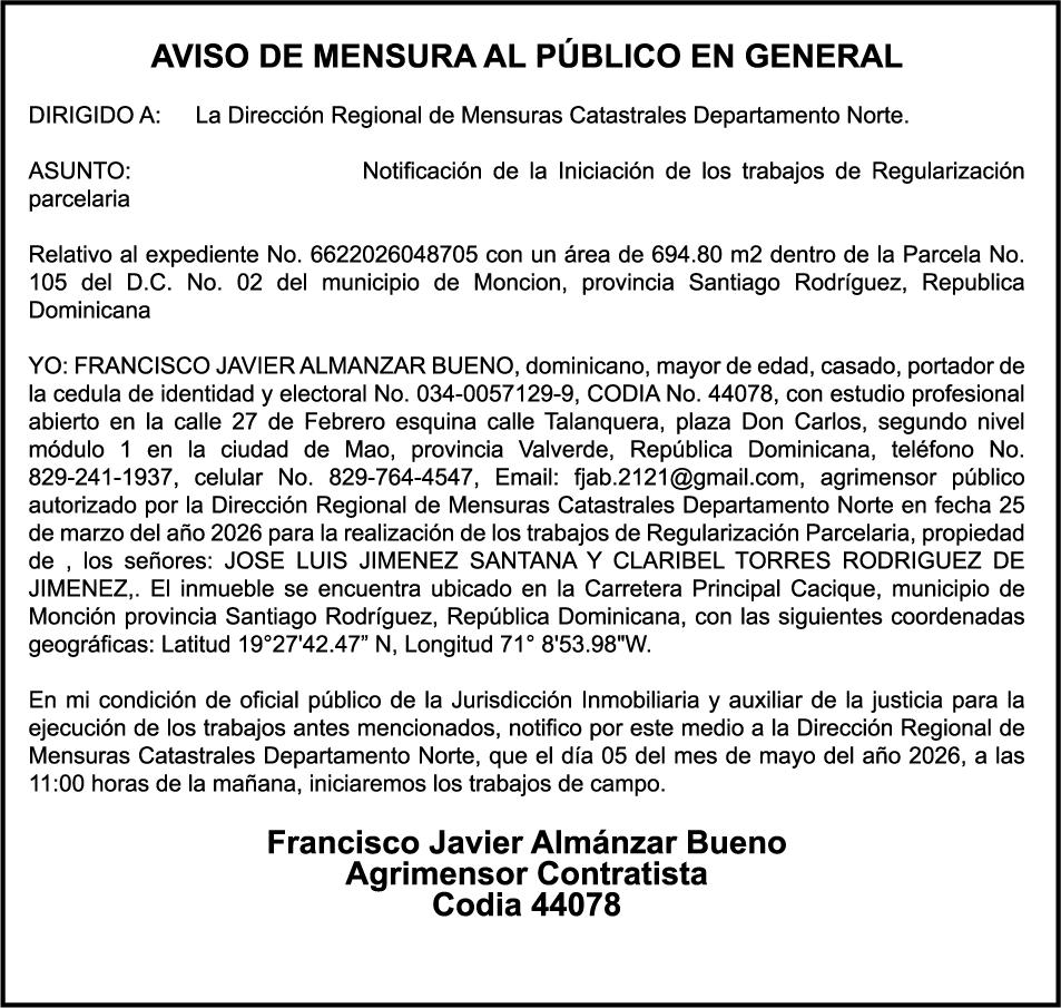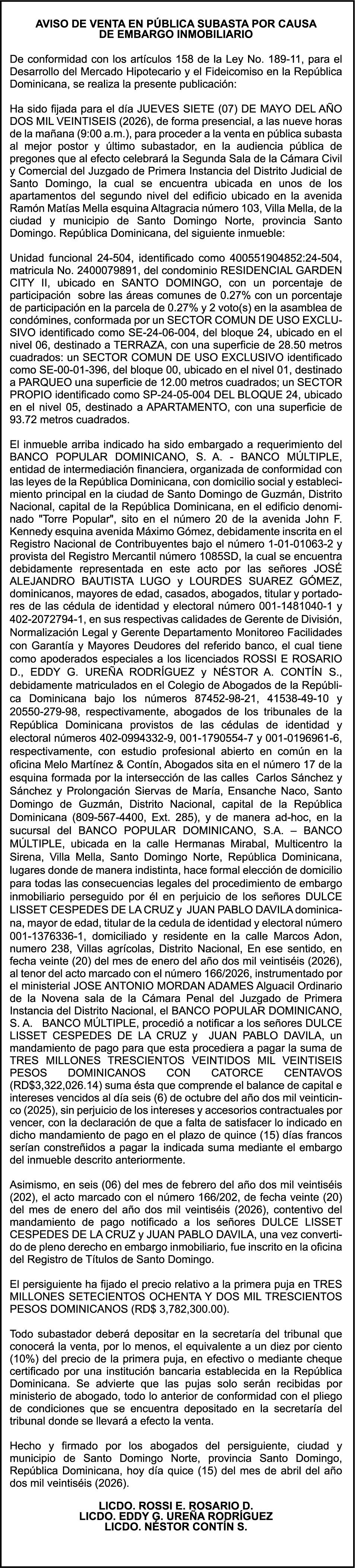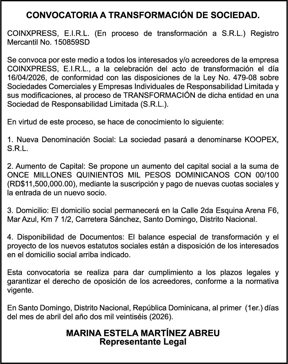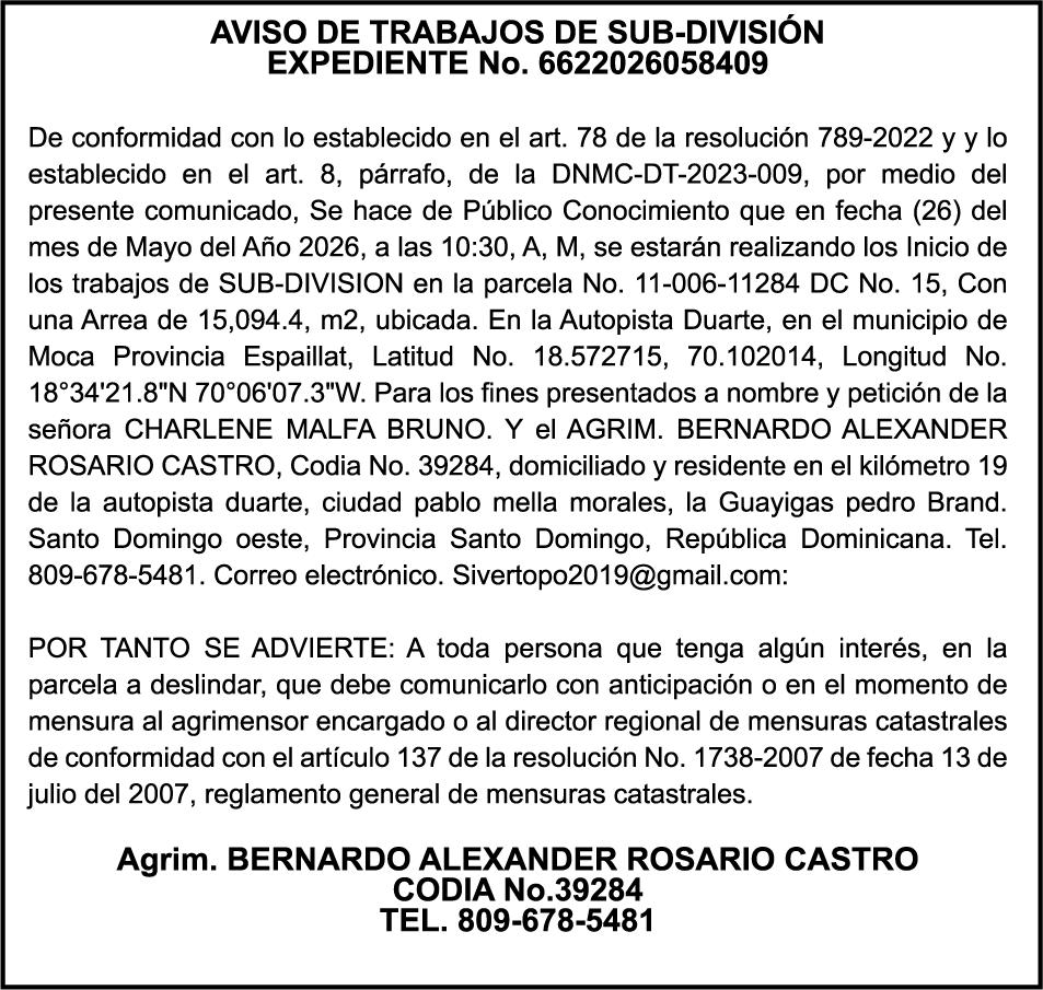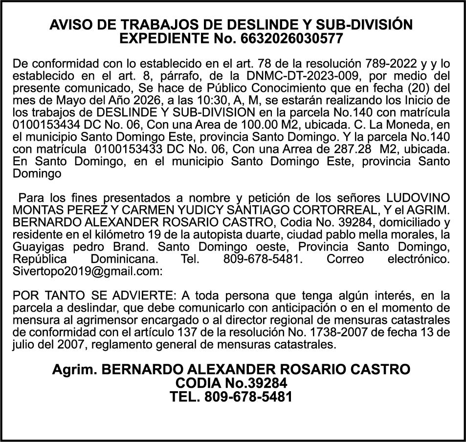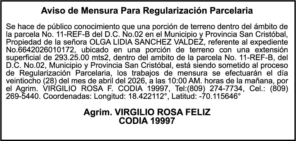 SE HACE de público conocimiento la pérdida del Certificado Financiero número 850227810 emitido por Banco Popular Dominicano, S. A. Banco Múltiple, a nombre de ALBIERIS MIGUEL GRULLON VALERIO, portador de la Cédula de Identidad y Electoral número 402-3855170-5, certificado número 850227810 expedido el 1 de julio de 2025 por el monto de (RD$52,157.22) más intereses generados a la fecha.