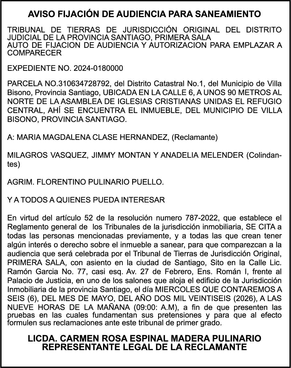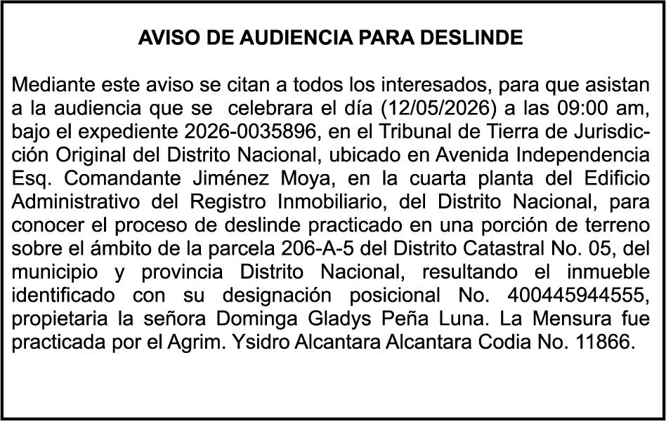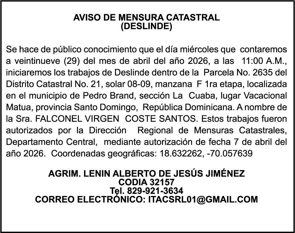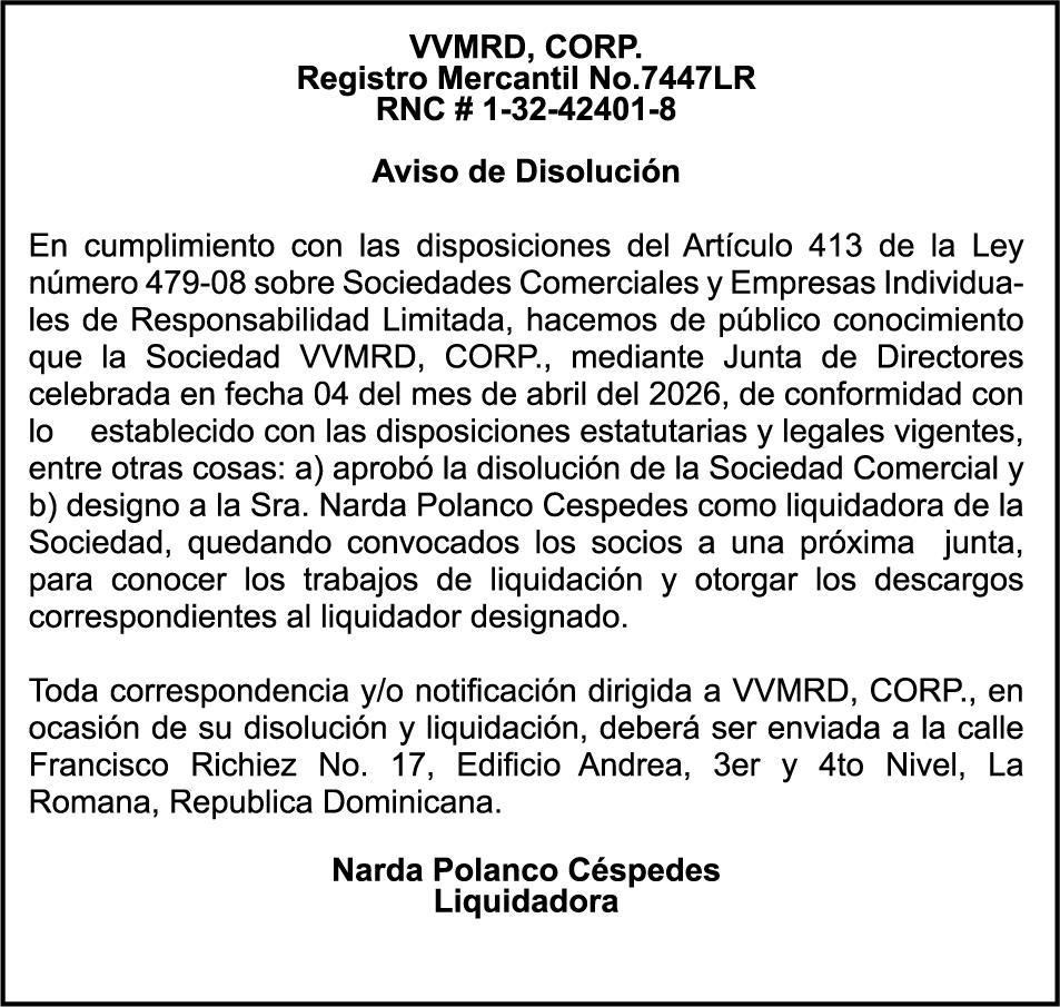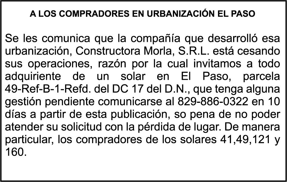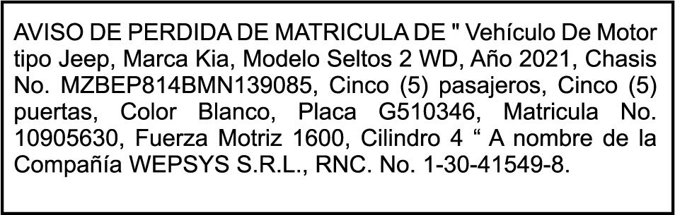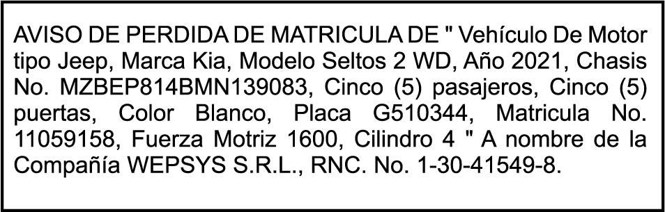 PERDIDA DE MATRICULA Jeep marca JEEP, modelo GRAND CHEROKEE LAREDO, color negro, año 2015, placa G555882, chasis 1C4RJFAG0FC115496, a nombre de MARLONY GERALDINO. SE HACE de público conocimiento la pérdida del Certificado Financiero número 850227810 emitido por Banco Popular Dominicano, S. A. Banco Múltiple, a nombre de ALBIERIS MIGUEL GRULLON VALERIO, portador de la Cédula de Identidad y Electoral número 402-3855170-5, certificado número 850227810 expedido el 1 de julio de 2025 por el monto de (RD$52,157.22) más intereses generados a la fecha.