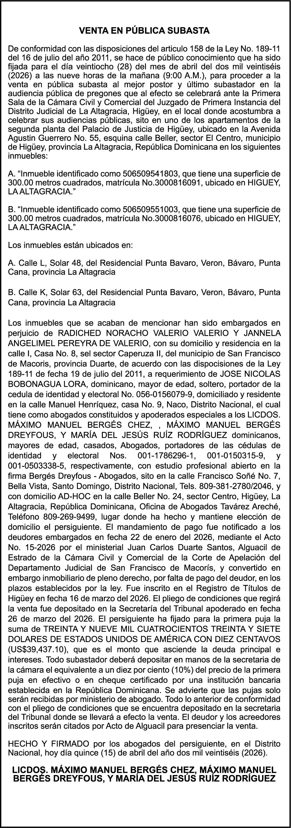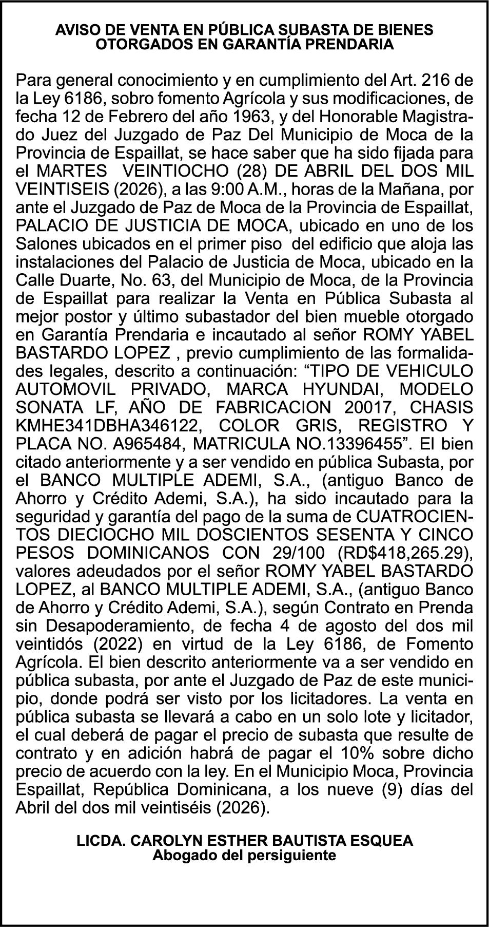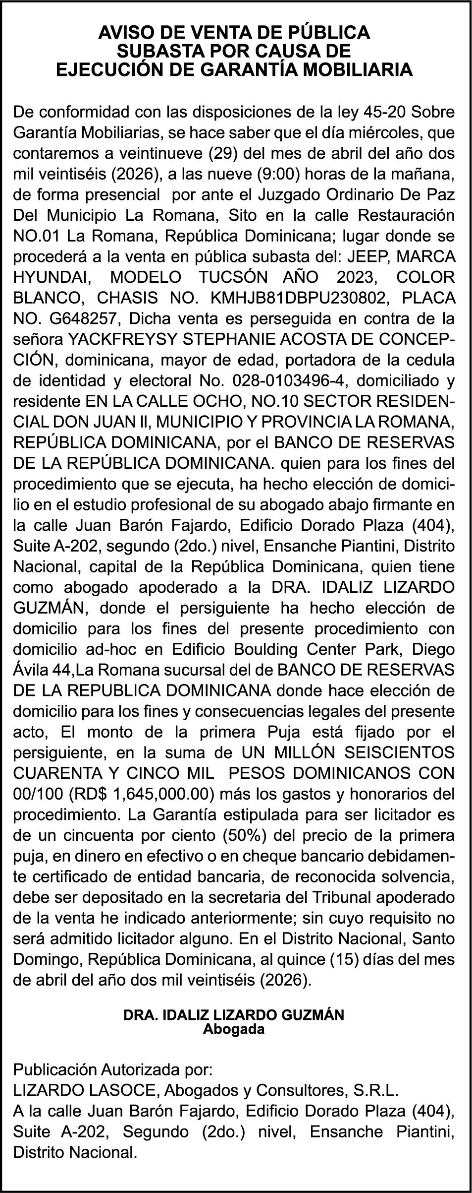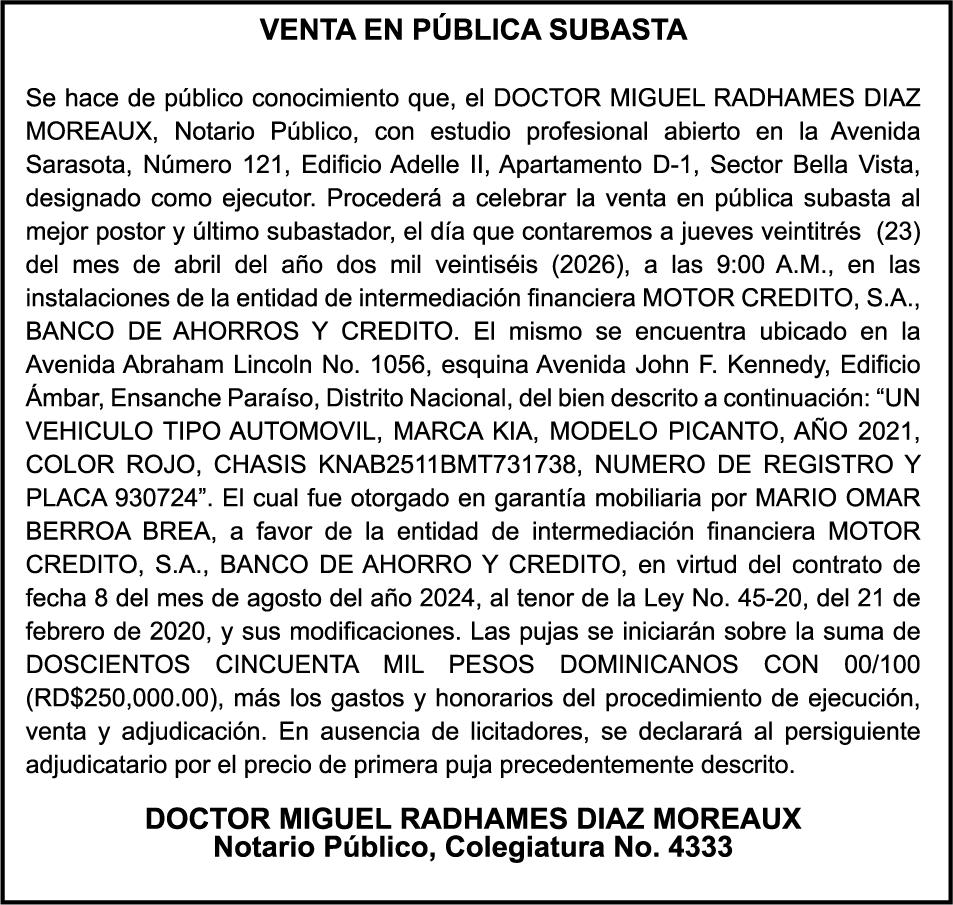 PERDIDA DE MATRICULA Jeep marca JEEP, modelo GRAND CHEROKEE LAREDO, color negro, año 2015, placa G555882, chasis 1C4RJFAG0FC115496, a nombre de MARLONY GERALDINO. SE HACE de público conocimiento la pérdida del Certificado Financiero número 850227810 emitido por Banco Popular Dominicano, S. A. Banco Múltiple, a nombre de ALBIERIS MIGUEL GRULLON VALERIO, portador de la Cédula de Identidad y Electoral número 402-3855170-5, certificado número 850227810 expedido el 1 de julio de 2025 por el monto de (RD$52,157.22) más intereses generados a la fecha.